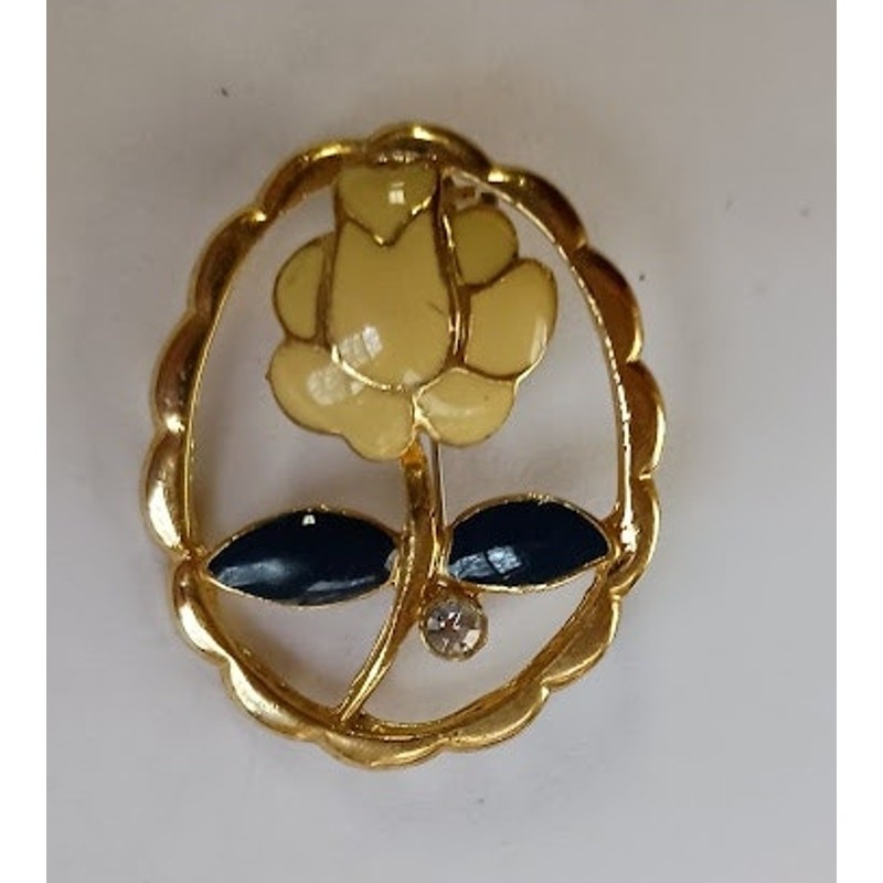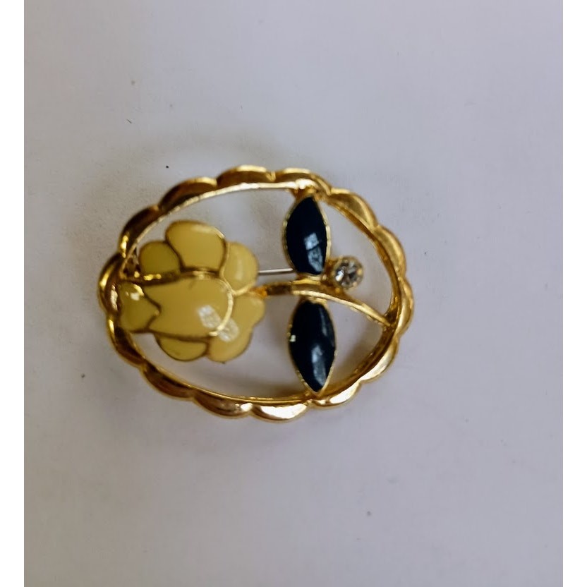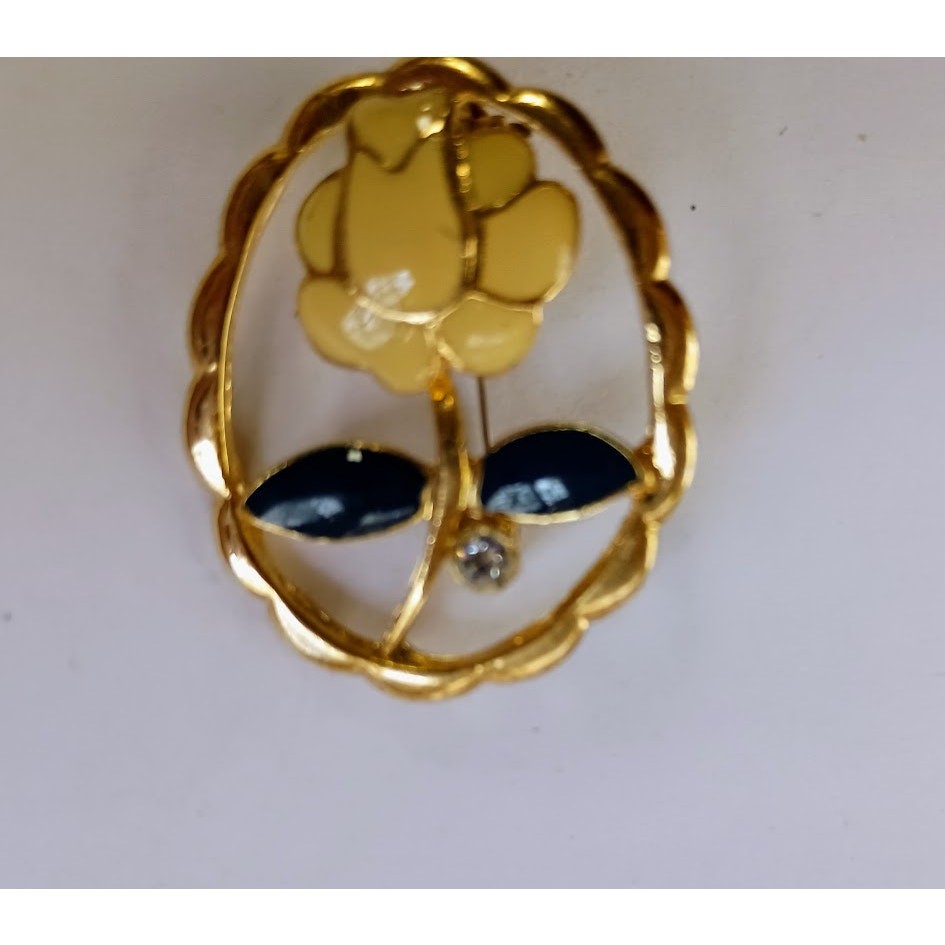 Vintage Cream Flower Brooch Navy Leaves One Faux Diamond Gold-Tone Size: 1.5" X 1" Flower: Cream petals are outlined in gold-tone, the stem is gold-tone, navy leaves are outlined in gold-tone, and one faux diamond is on the stem. Small scratch on hinge of clasp. Please see picture.