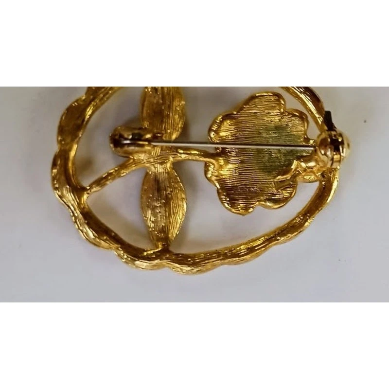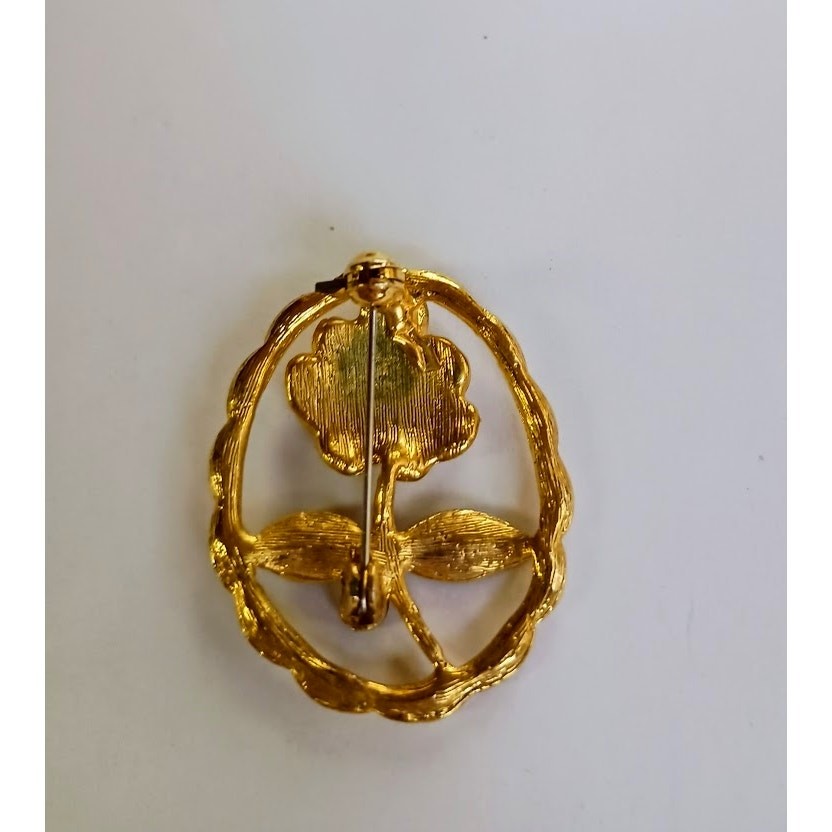 Avon gold & pearl flower brooch as pictured. For such a small, easy item to ship, it was not shipped very promptly. Had to ask about it several days after a tracking number was provided. Then it was finally shipped. Seller ignored offers & overall communication was quite poor. Seller shipped in a nice small box suitable for storing the brooch, but she wrapped the box in tape. Why?Wrap the box in paper first. Then put on tape & preserve the box. Removing the tape totally ruined the box.