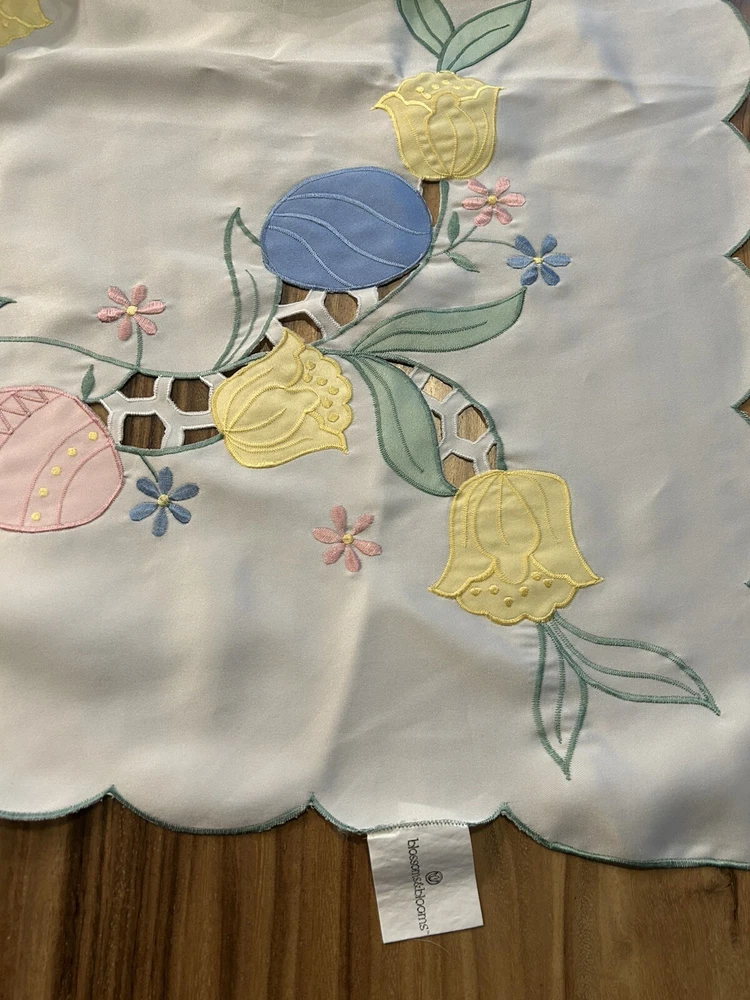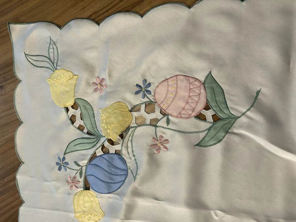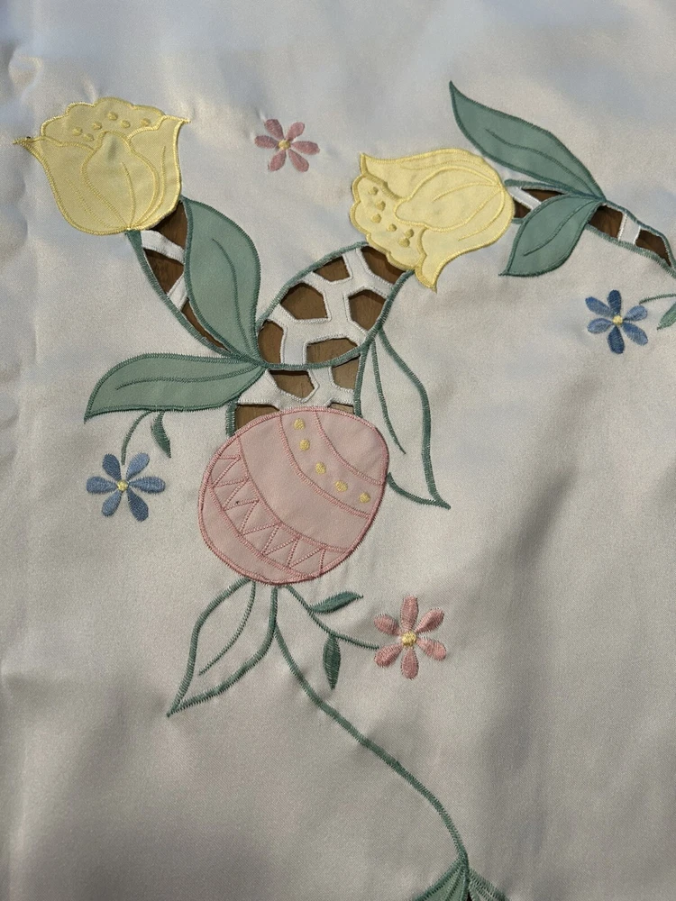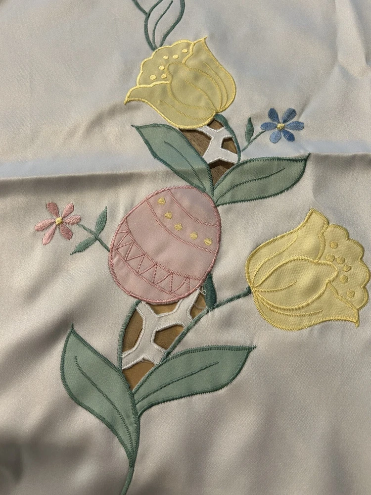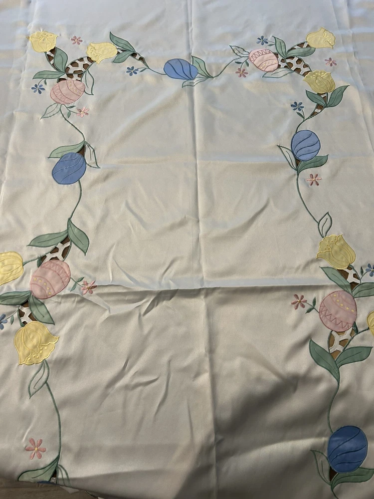Handmade:NoColor:CremeItem Width:More Than 25 inStyle:1960sFeatures:EmbroideredType:TableclothSize:MAntique:NoPattern:DamaskTheme:ClassicalOriginal/Licensed Reproduction:OriginalBrand:UnbrandedNumber of Items in Set:1Time Period Manufactured:1960-1969Country/Region of Manufacture:UnknownItem Length:71-90 inShape:RectangleMaterial:Satin