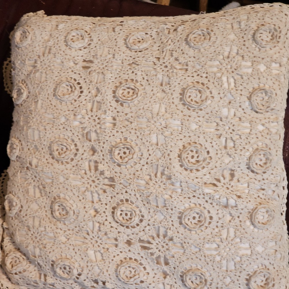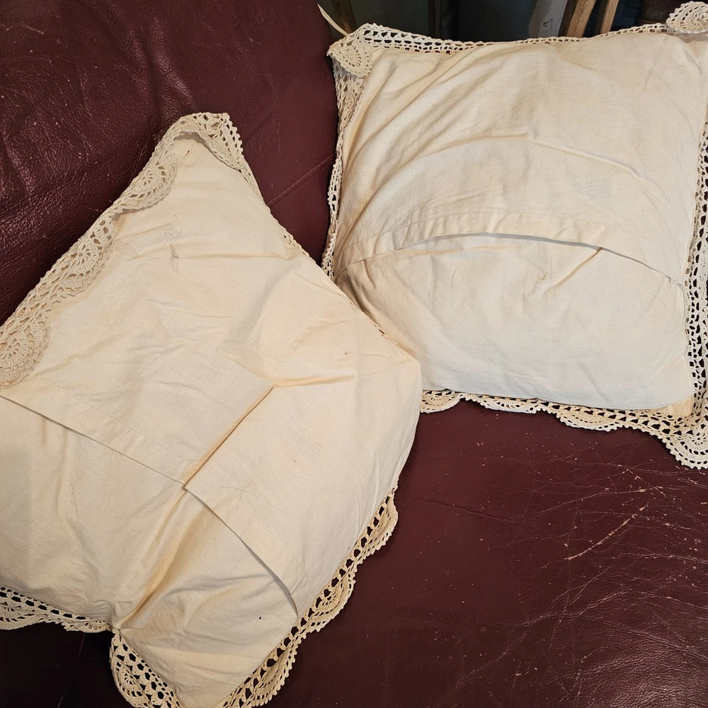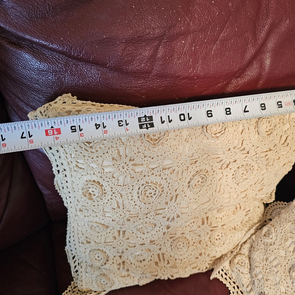 This is a set of two Vintage Crochet Lace Throw Accent Pillows in a Square shape measuring 16 x 16 inches. The pillows feature a Floral pattern in Beige color with a Cottagecore theme. Made of 100% Cotton lace material, they have a vintage/retro style and textured design. The pillows are bordered and 3D, suitable for indoor use and machine washable. Perfect for adding a Grannycore or romantic touch to any room. There is a stain on the back of one that I have not tried to clean. Sold as is