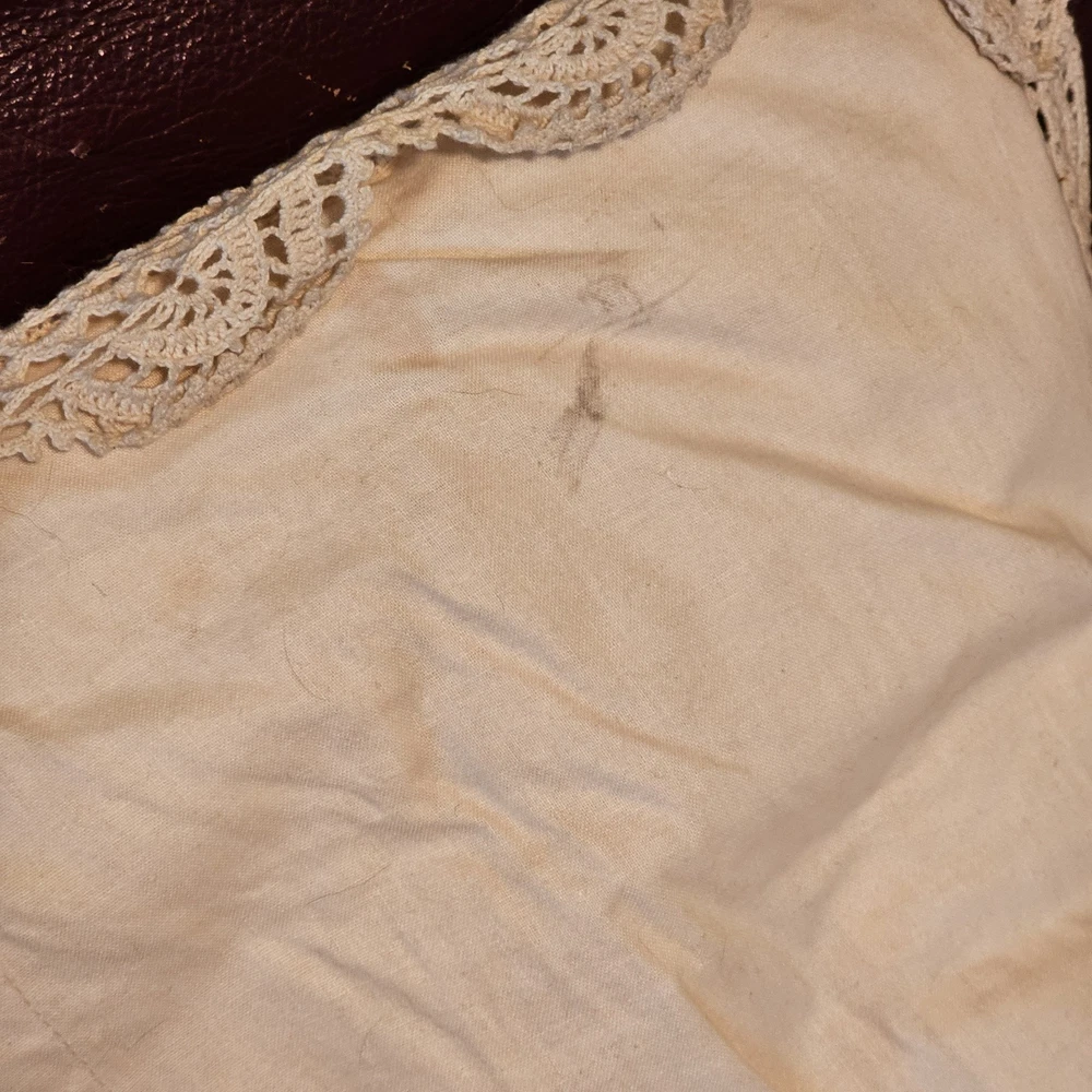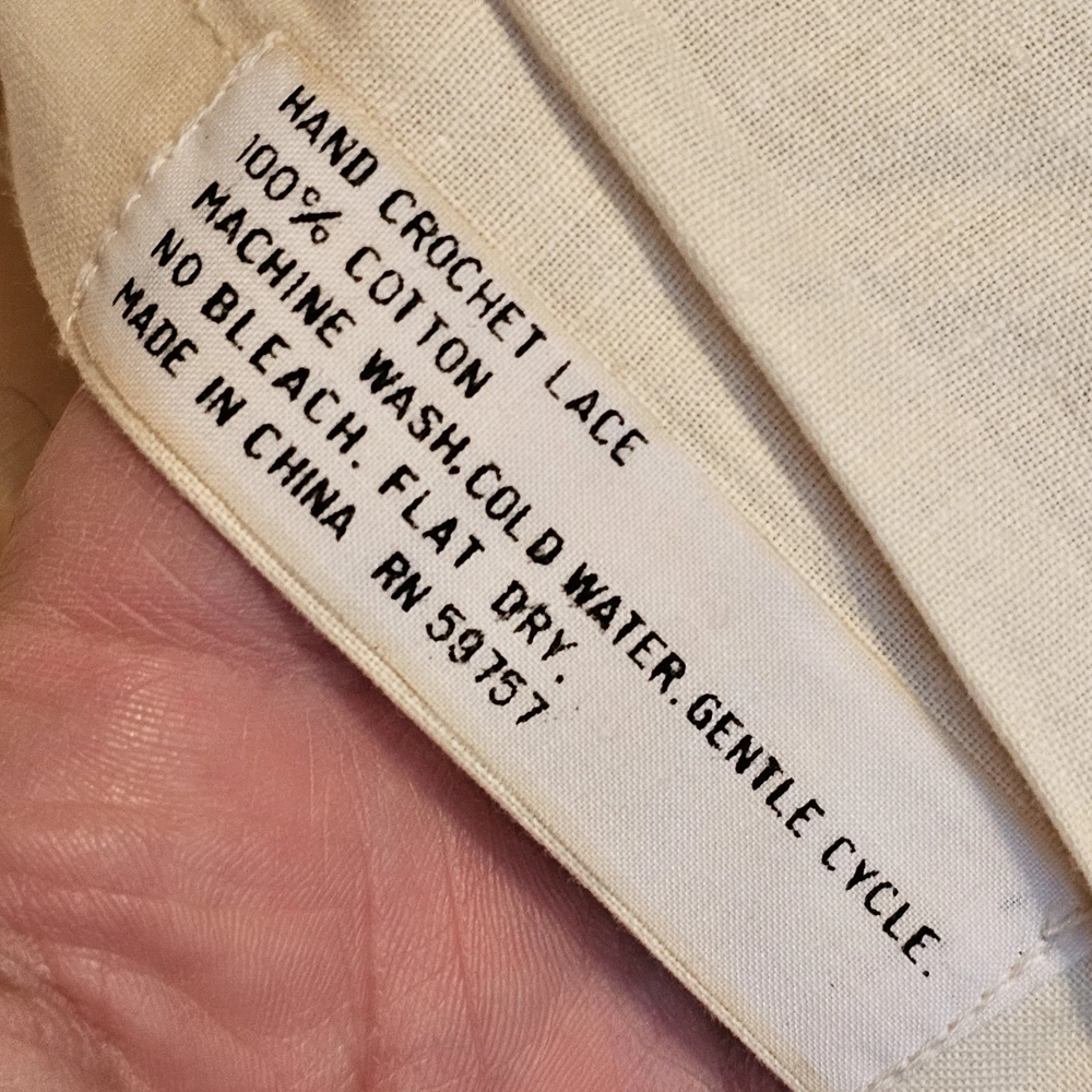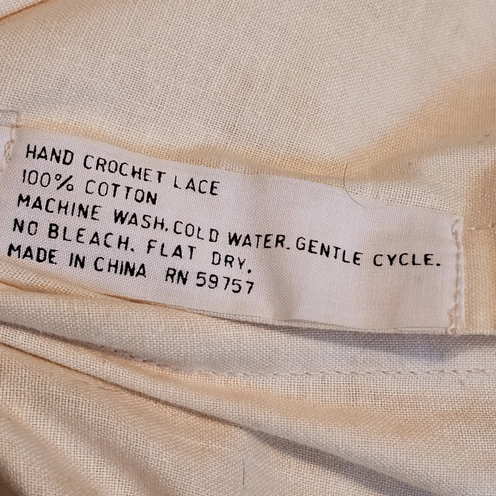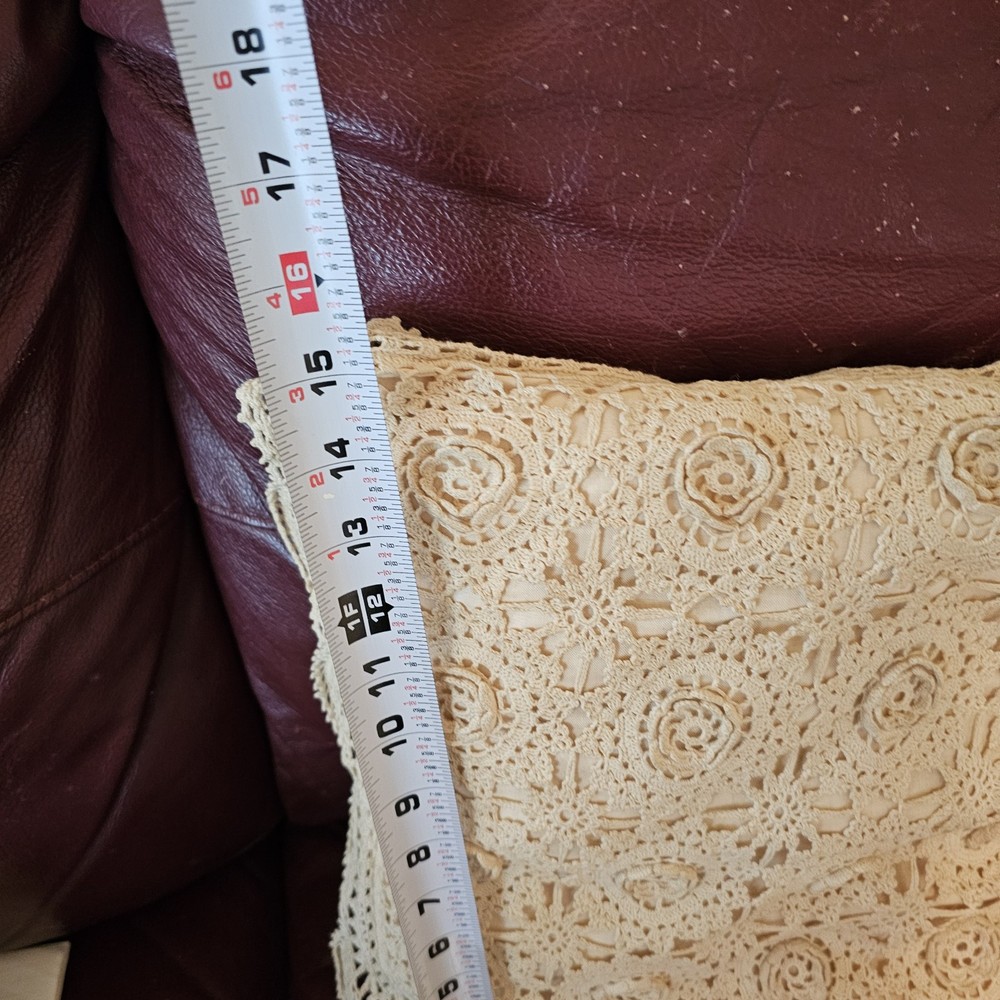 This is a set of two Vintage Crochet Lace Throw Accent Pillows in a Square shape measuring 16 x 16 inches. The pillows feature a Floral pattern in Beige color with a Cottagecore theme. Made of 100% Cotton lace material, they have a vintage/retro style and textured design. The pillows are bordered and 3D, suitable for indoor use and machine washable. Perfect for adding a Grannycore or romantic touch to any room. There is a stain on the back of one that I have not tried to clean. Sold as is