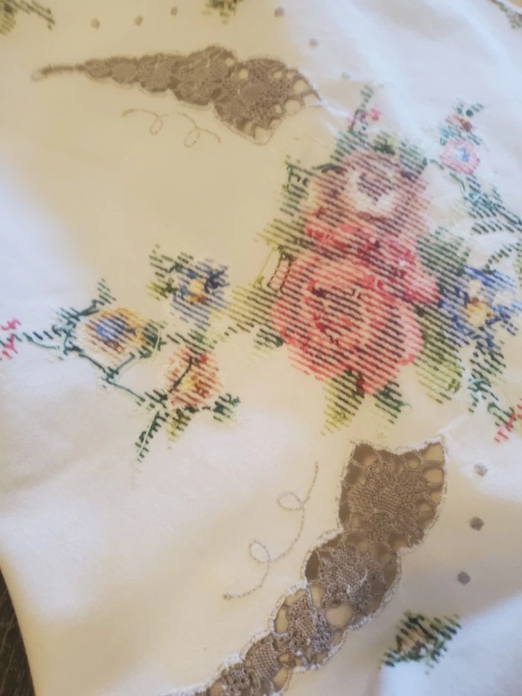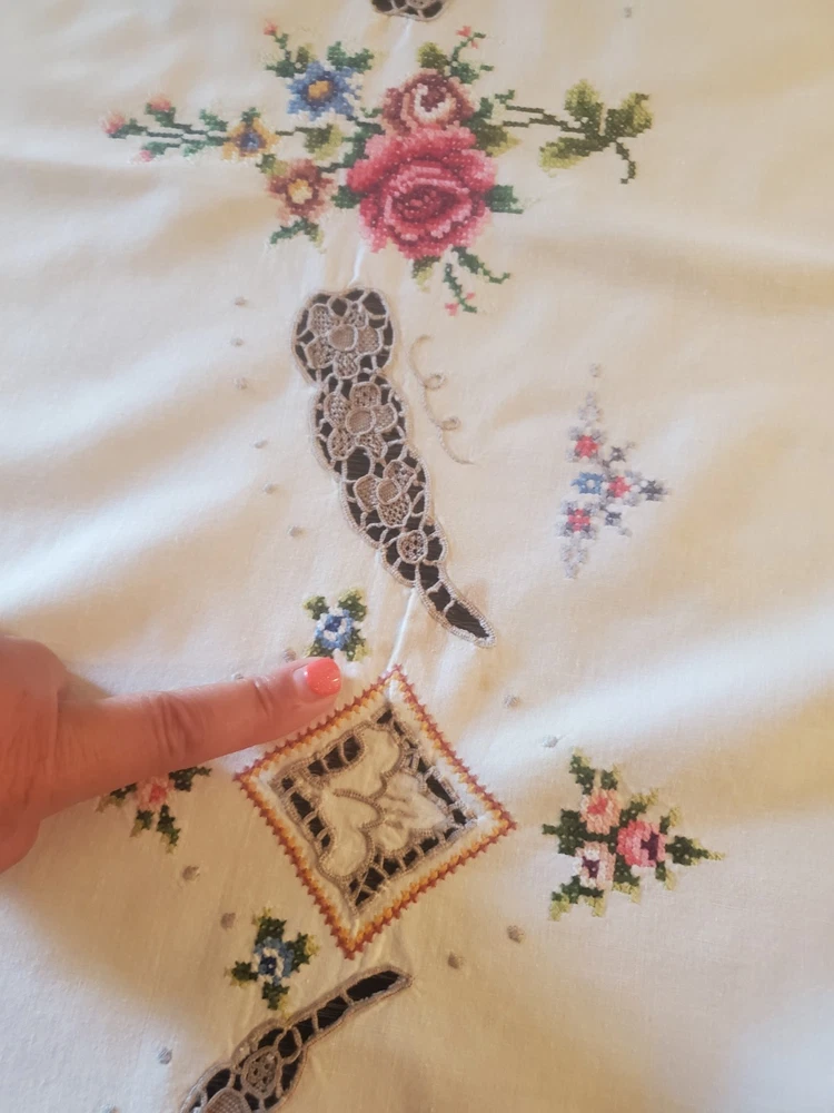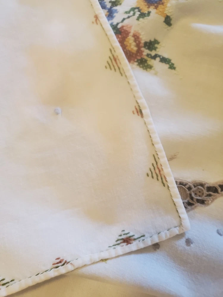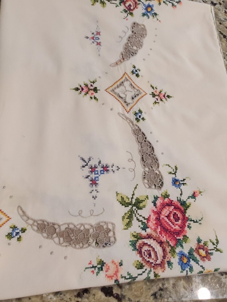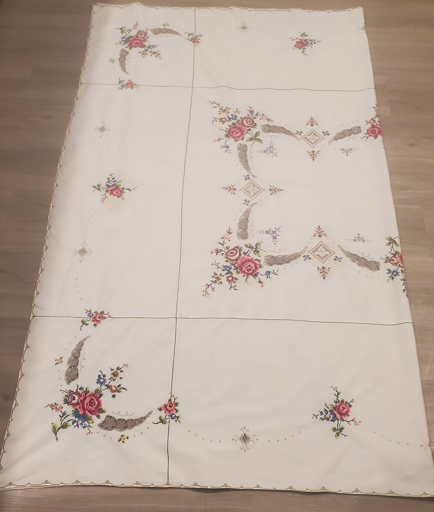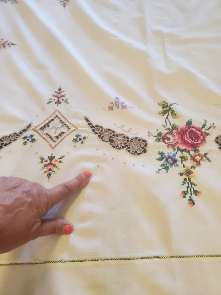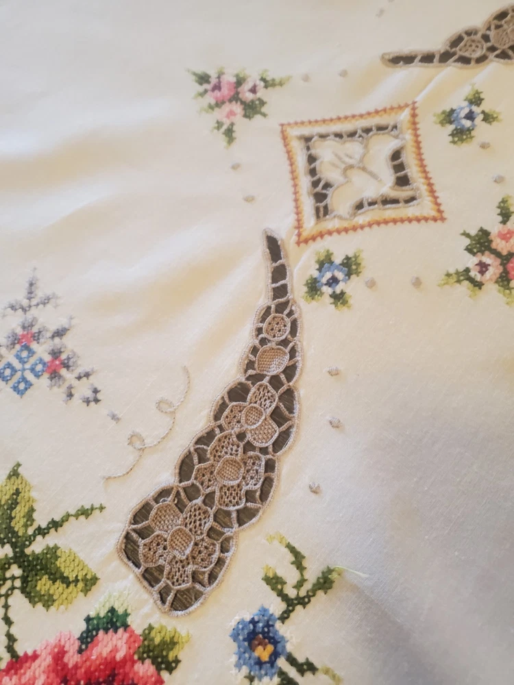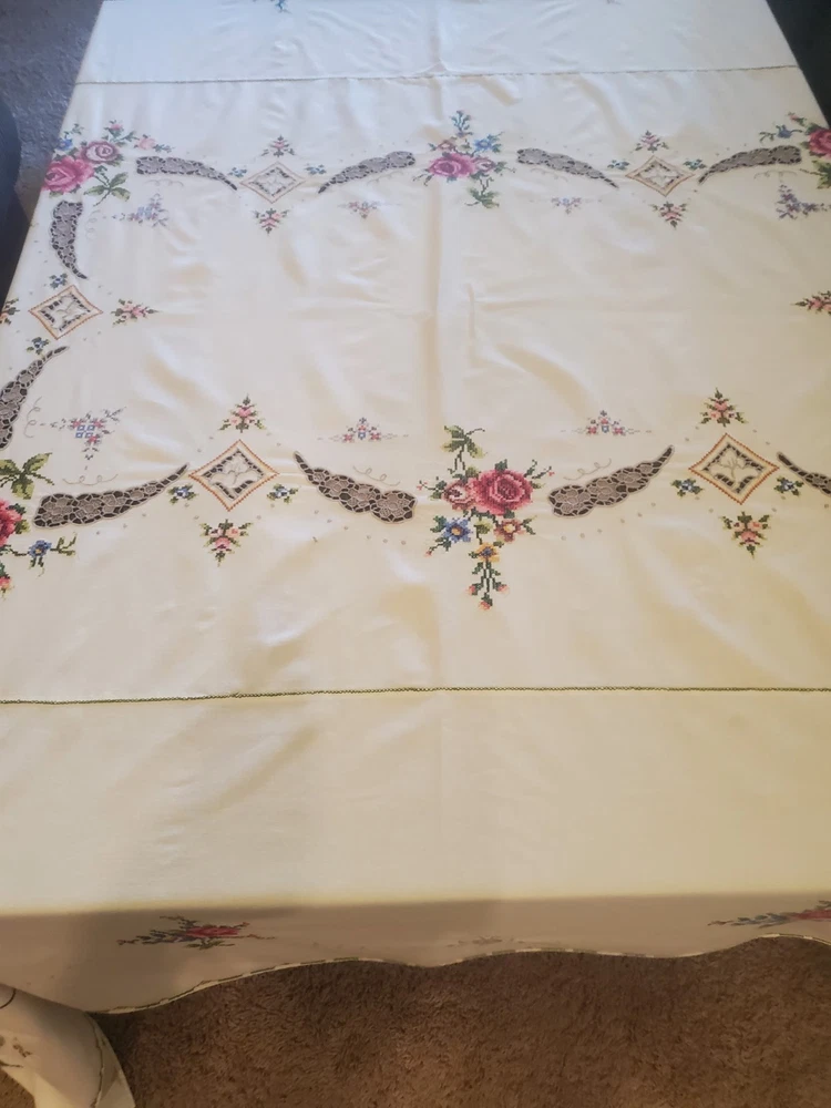 This is a stunning, vintage, handmade tablecloth featuring intricate cross-stitch and crochet lace work. The craftsmanship is exceptional, representing countless hours of meticulous hand-stitching. The beautiful floral design includes embroidered borders and handmade inlay lace work. The large size, measuring 82" by 68", makes it a perfect statement piece for a dining room or special occasion table. Please note that as a vintage item, there are some signs of age. There are a few faint stains, which have been highlighted in the product photos. Additionally, there is one tiny hole, which is also pointed out in the pictures for full transparency. Despite these minor imperfections, the tablecloth remains a beautiful and unique piece of textile art. This is a true treasure for collectors of vintage linens and handmade embroidery. Features Material: It appears to be a linen or cotton blend. Measurements: 82" (length) x 68" (width) Craftsmanship: Hand-embroidered cross-stitch, hand-stitched borders, and handmade crochet lace inlay. Condition: Pre-owned vintage condition with faint stains and a tiny hole (see photos for details).