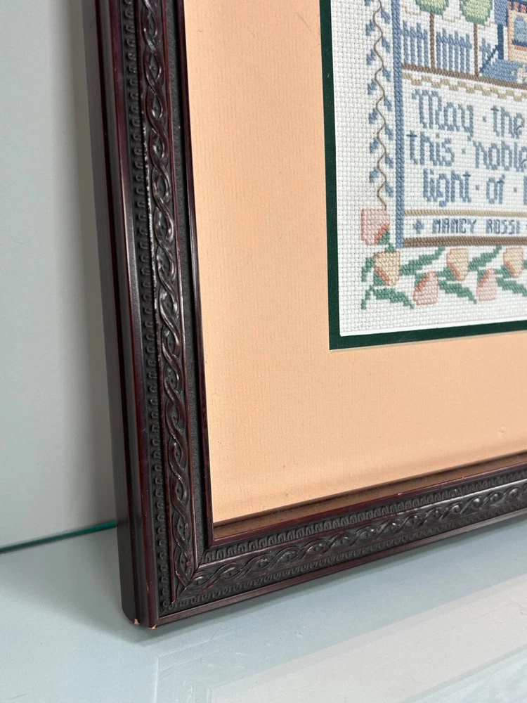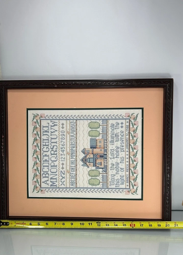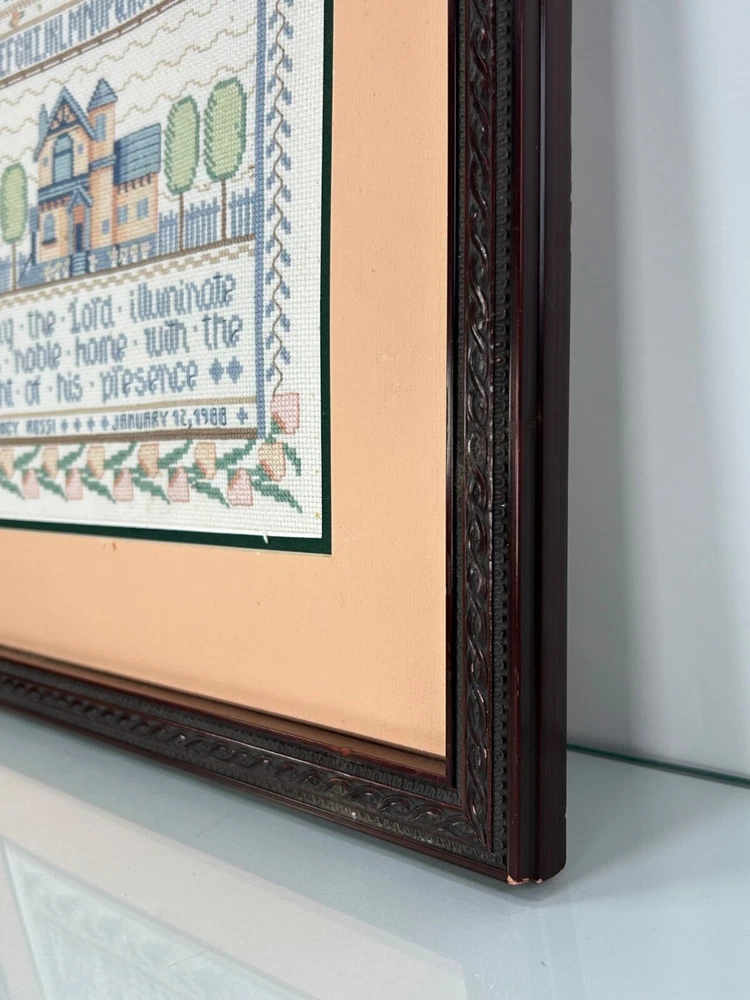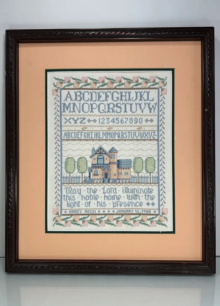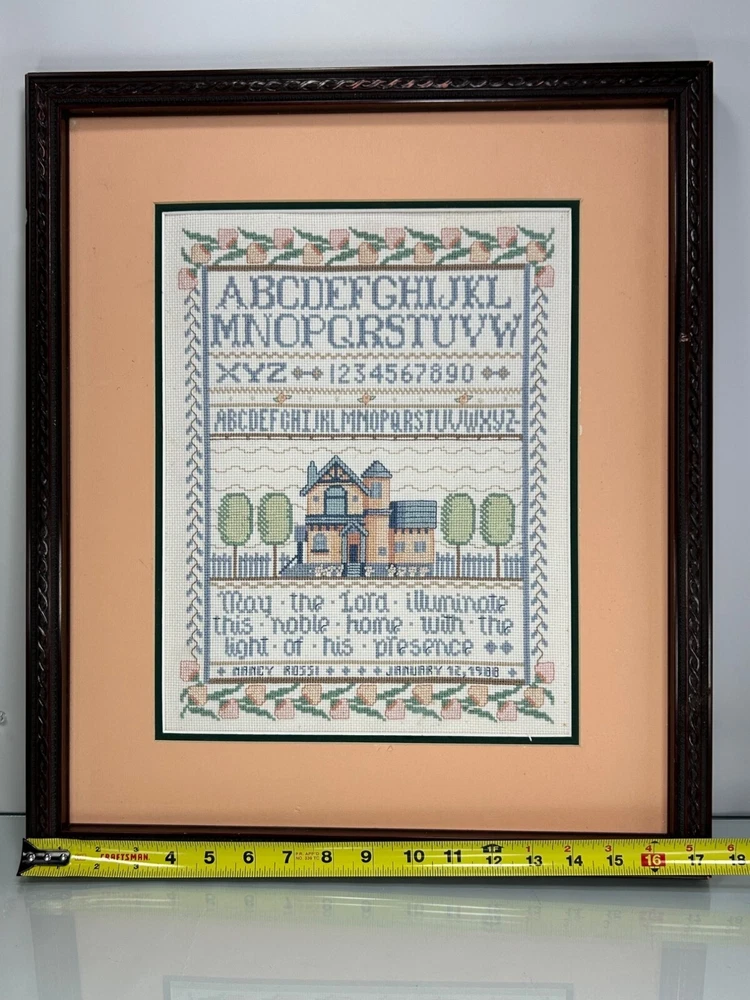 Pre-loved with minimal signs of age on frame, see pictures for details Vintage Nancy Rossi Cross Stitching Wall Art Professionally Framed by La Canada by fastframe in Austin, TX! Cost of this frame could be close to $150-$200! Hand made in 1987 Dark lacquer on wood frame border Carved spiral design Alphabet and Numbers with a prayer "May the Lord illuminate this noble home with the light of his presence." Length of frame: 20.5" Width of frame: 17.5" Length of actual stitching: 13.5" Width of actual stitching: 10.5" #framed #framedcrossstitch #crossstitch #crossstitching #vintagewallart #wallart #framedart #nancyrossi #professionallyframed #LaCanada #vintageart