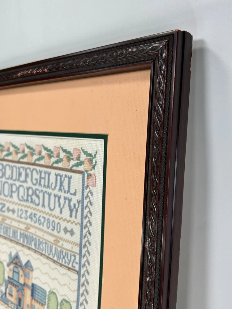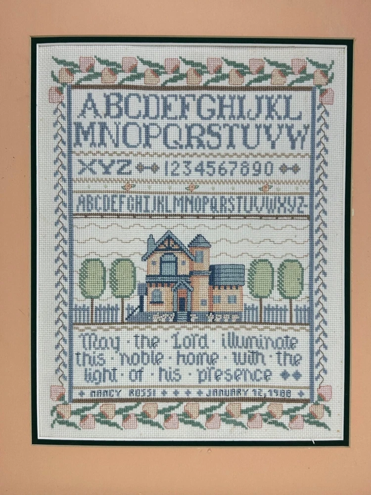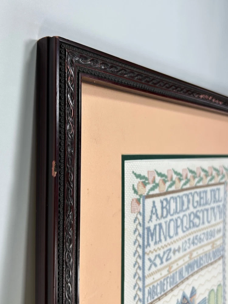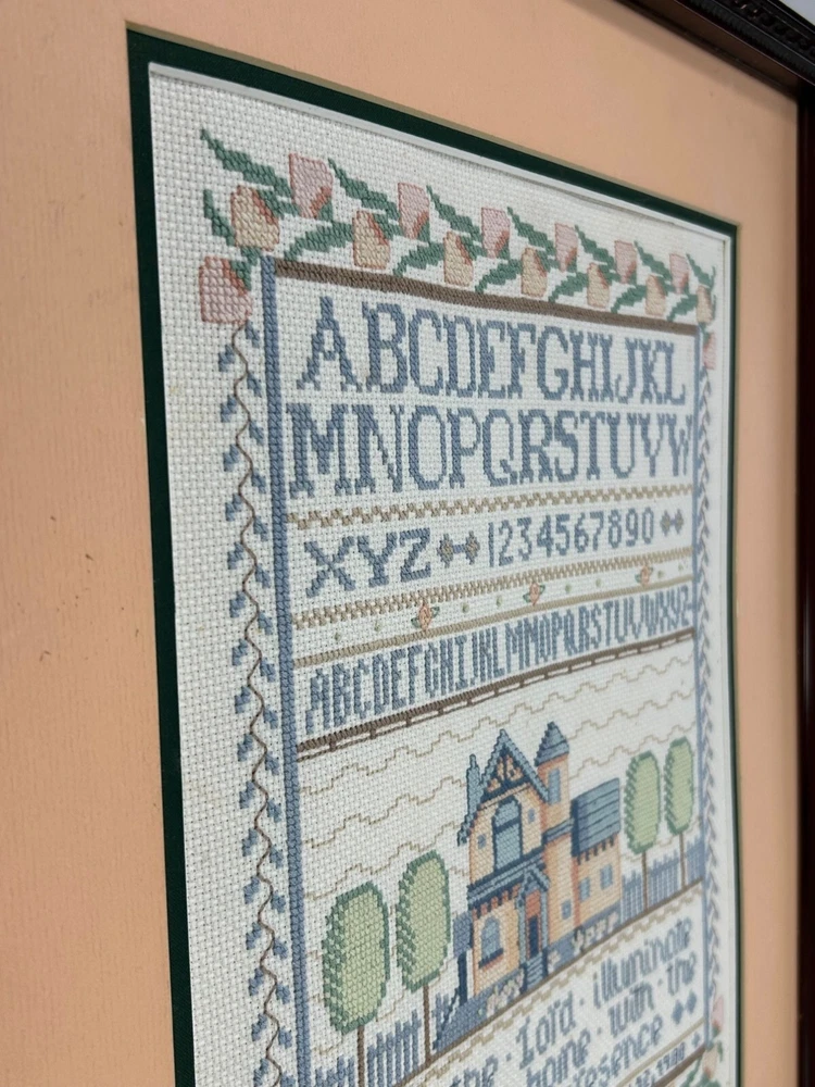 Pre-loved with minimal signs of age on frame, see pictures for details Vintage Nancy Rossi Cross Stitching Wall Art Professionally Framed by La Canada by fastframe in Austin, TX! Cost of this frame could be close to $150-$200! Hand made in 1987 Dark lacquer on wood frame border Carved spiral design Alphabet and Numbers with a prayer "May the Lord illuminate this noble home with the light of his presence." Length of frame: 20.5" Width of frame: 17.5" Length of actual stitching: 13.5" Width of actual stitching: 10.5" #framed #framedcrossstitch #crossstitch #crossstitching #vintagewallart #wallart #framedart #nancyrossi #professionallyframed #LaCanada #vintageart