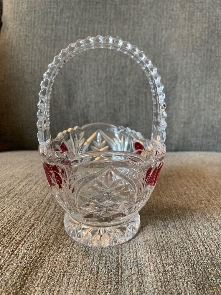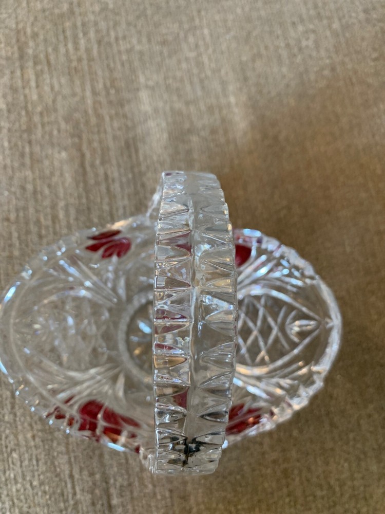 The vintage crystal candy/bonbon dish is oval-shaped, made of clear crystal, and ideal for displaying candies. It is perfect for adding a touch of elegance to your table setting or home decor.