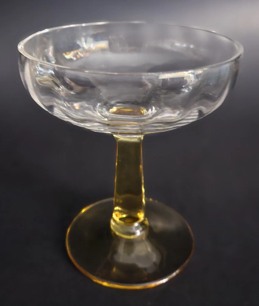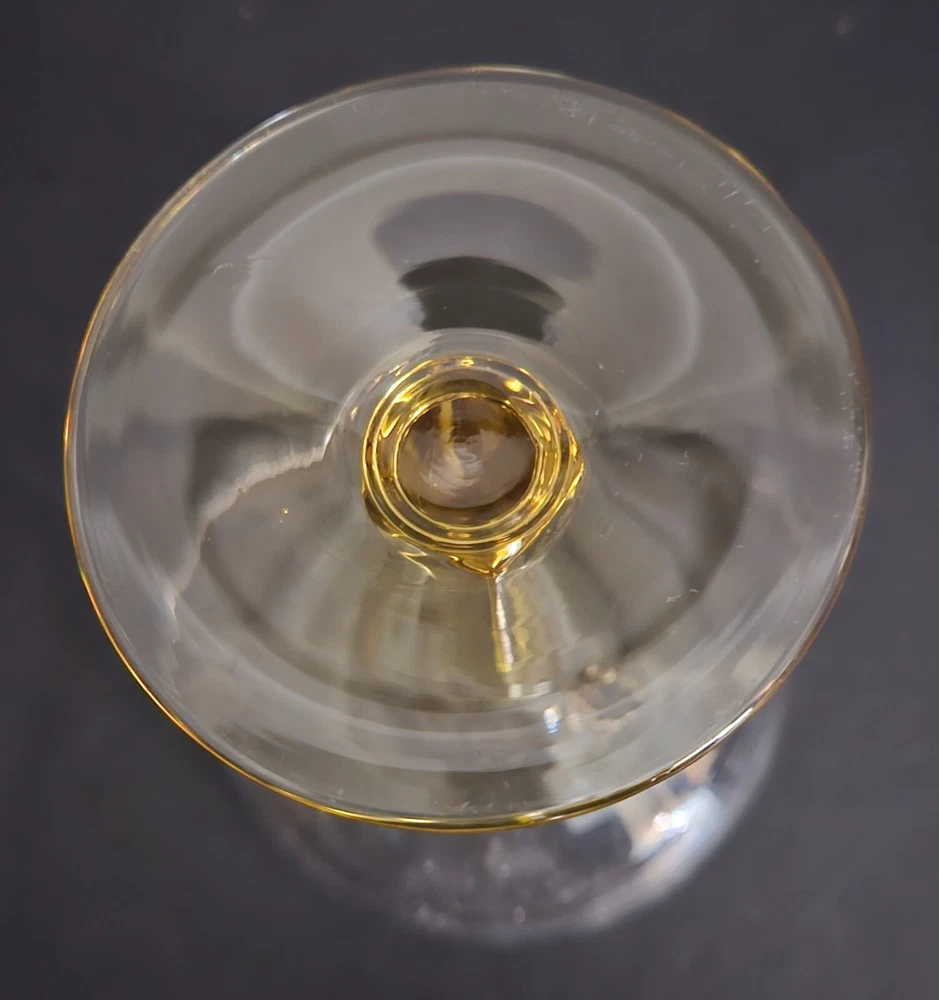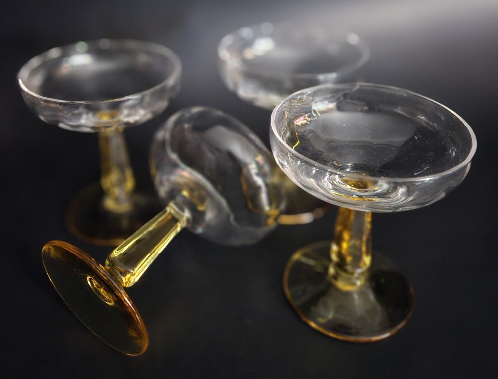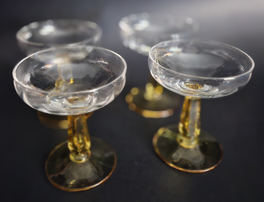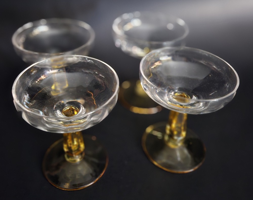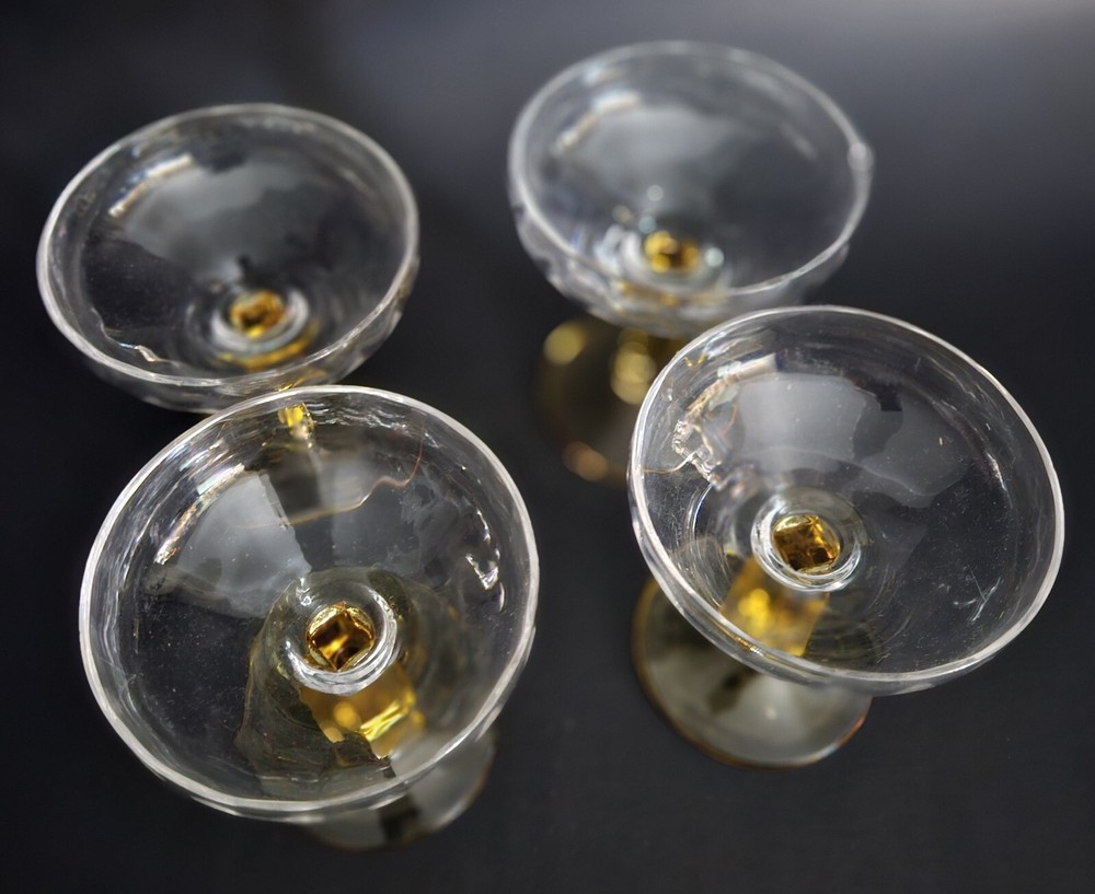 Set of 4 vintage champagne glasses. Tops are clear with a scalloped design. Stems are gold. 3 of the glasses have a tiny flea bite on rims. Barely noticeable. See last close up photo. 4.5" tall. Great overall vintage condition.