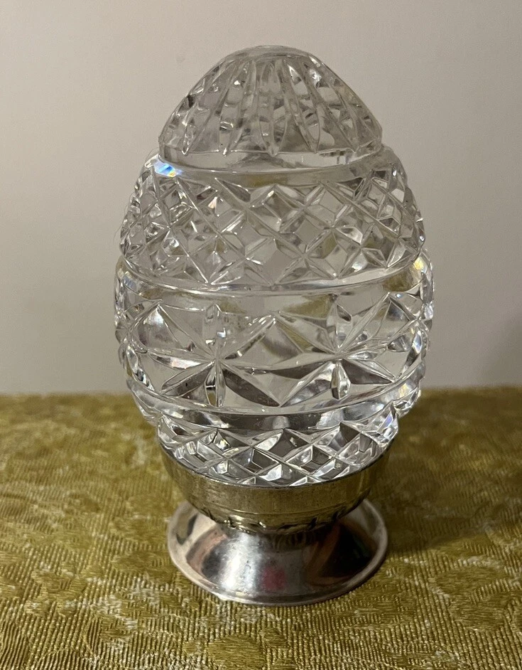 Retired annual Waterford Crystal Imperial Egg designed with the most ornate, intricate details The egg comes with its silver plated base / stand — exceptional condition and exceptionally beautiful when light shines upon it — quite an eye catcher See photos for approximate size and condition