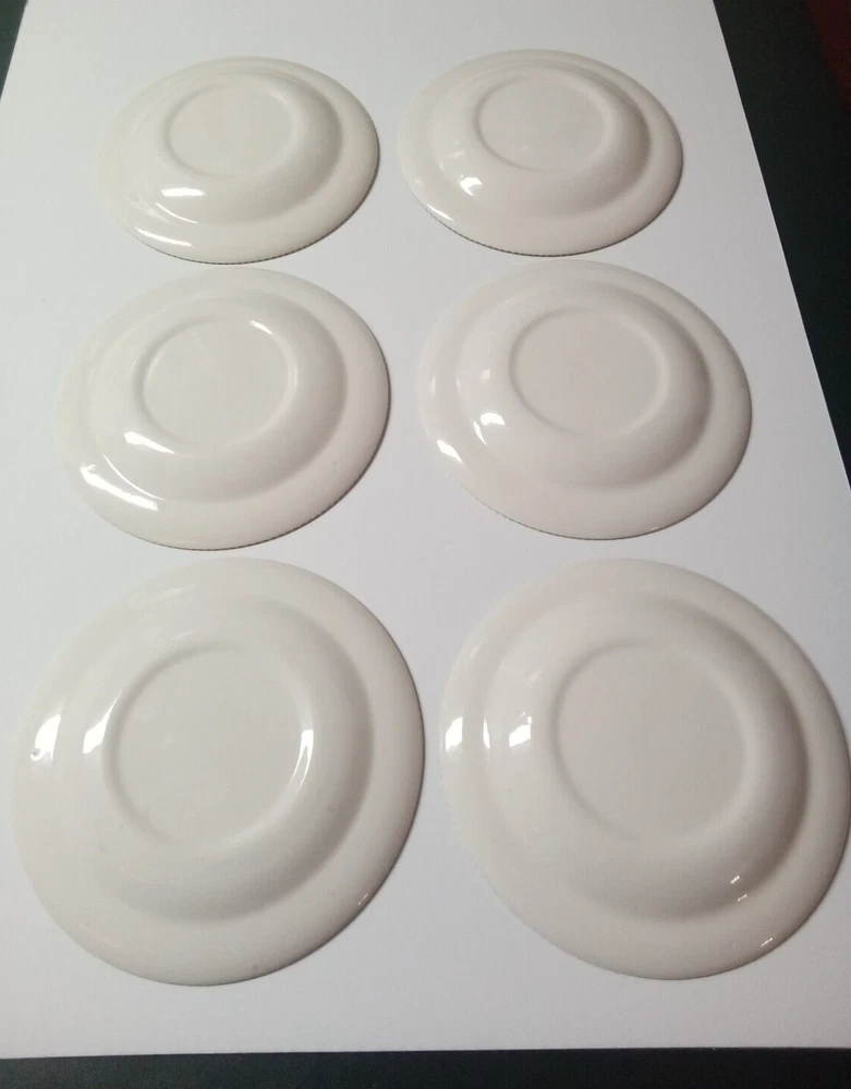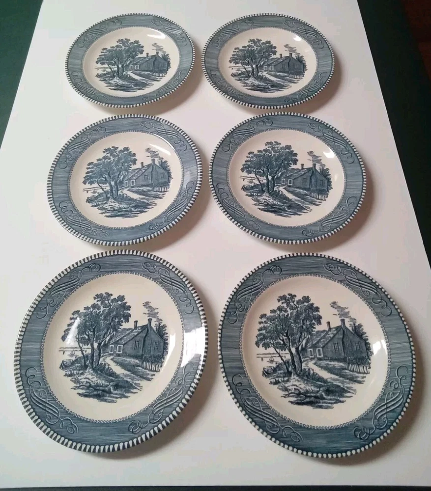 The Vintage Currier and Ives 7-1/4" Salad Plates by Royal China are a set of six retro-style salad plates featuring a multicolor Currier & Ives pattern. The plates are round in shape, measuring 7-1/4 inches in diameter, and are made of ceramic with a glossy finish. These salad plates showcase blue and white pottery production style, embodying a Farm theme from the Late 20th Century. Hand wash only, These original plates are perfect for all occasions, adding a touch of vintage charm to any table setting. These plates are in good used condition with no chips or cracks. See photos.