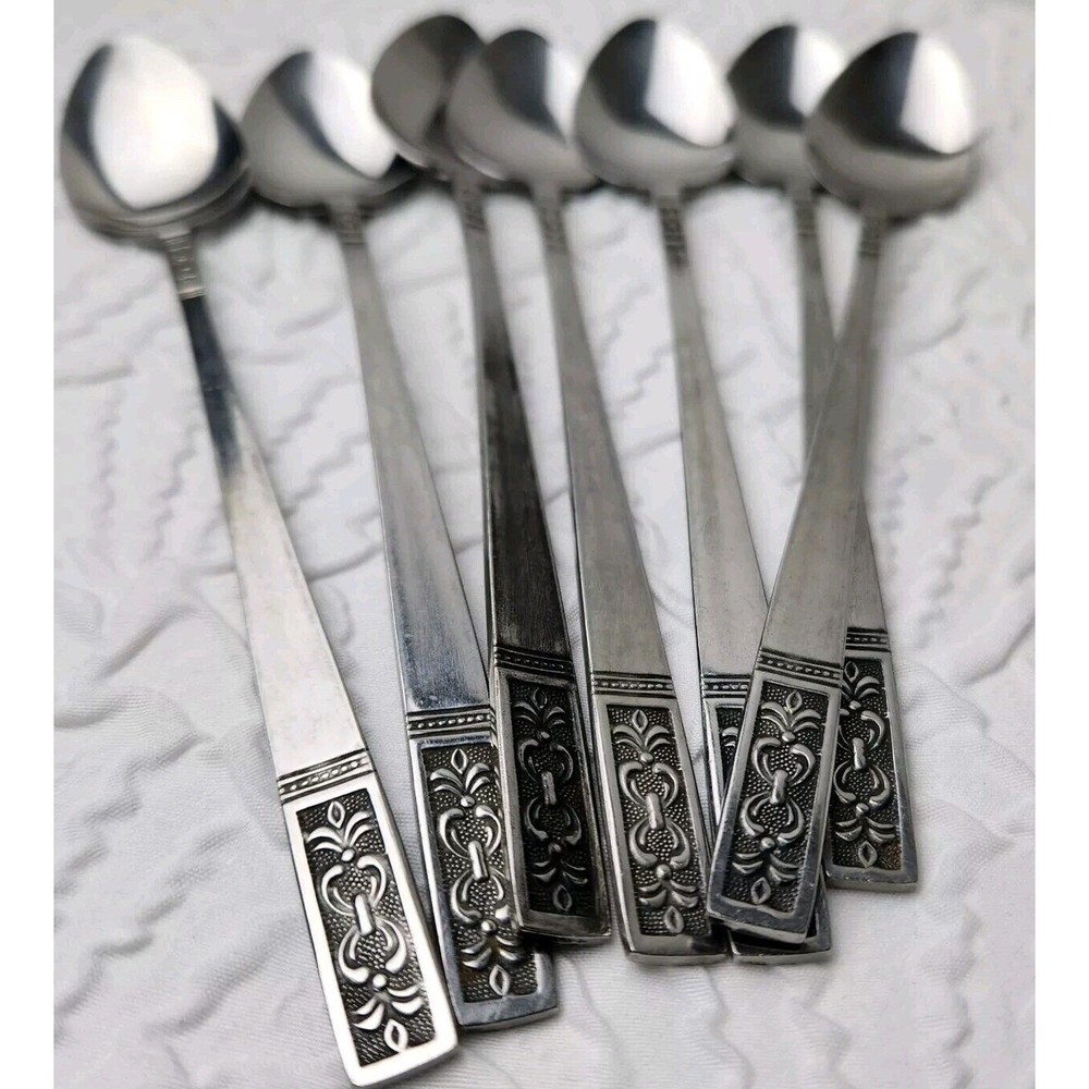 Normal Wear, used for holidays. Add a touch of vintage charm to your tea time with these Customcraft stainless ice tea spoons. The intricate Fleur de Lis design on seven spoons is sure to impress your guests. Made in Taiwan, these spoons are crafted from durable stainless steel, perfect for everyday use. The silver color adds a touch of elegance to any table setting. Ideal for adults, these ice tea spoons are a must-have addition to your flatware collection.