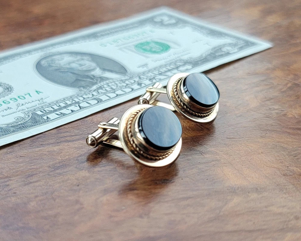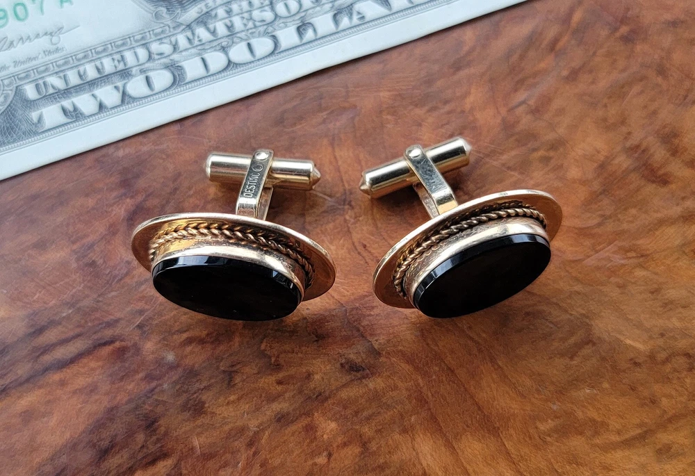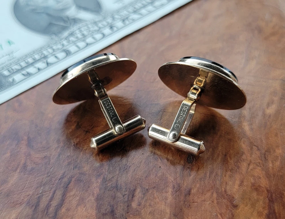Vintage DESTINO Cufflinks - Oval - Gold Filled/Black Onyx DIMENSIONS: Front: 25 mm x 20 mm. Cabochon: 18 mm x 13 mm. Total weight, both cufflinks: 13.3 grams. DESCRIPTION: Vintage cufflinks. By DESTINO. 1/20th 12K gold filled cufflinks. Oval front with bezel-set flat oval black onyx cabochon and twisted wire accent. Bullet toggle with hinged post. All original. Maker's marks: "Destino © - 1/20th 12K G.F. - D&F"; "Pat 2093723 - Pat 2544833". Mid 20th century. USA. CONDITION: Both cufflinks are in excellent original condition. No damage and no significant wear. No restorations / repairs. Gently used, not abused. No dings, dents, scuffs, cracks, splits, bends, breaks. No significant scratches or rubs. No significant edge wear. The hinges and toggles hold position as designed with no issues. On close inspection you may detect light typical use- / handling-related wear: scattered fine superficial scratches and rubs. Nothing at all significant or conspicuous. Old patina as found. Light typical age-related oxidation.