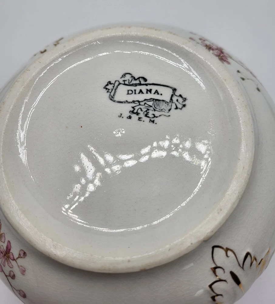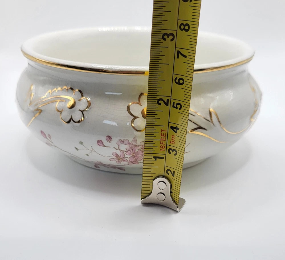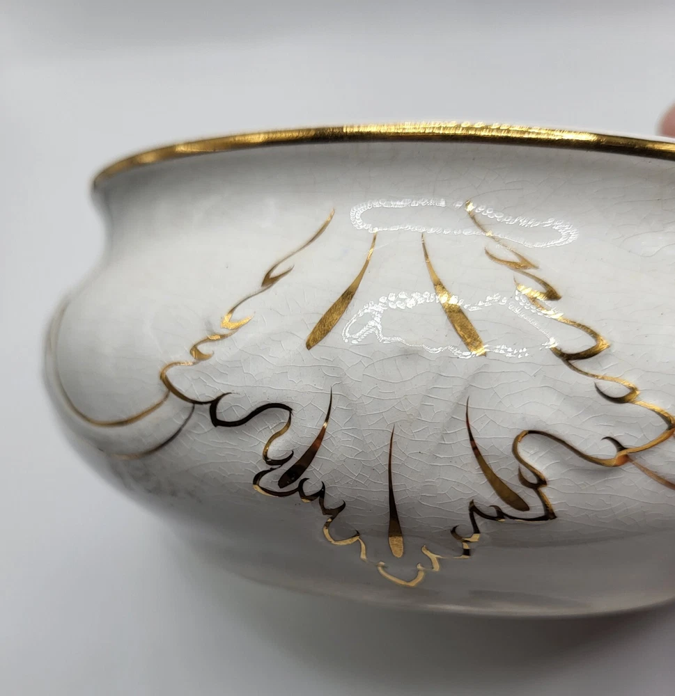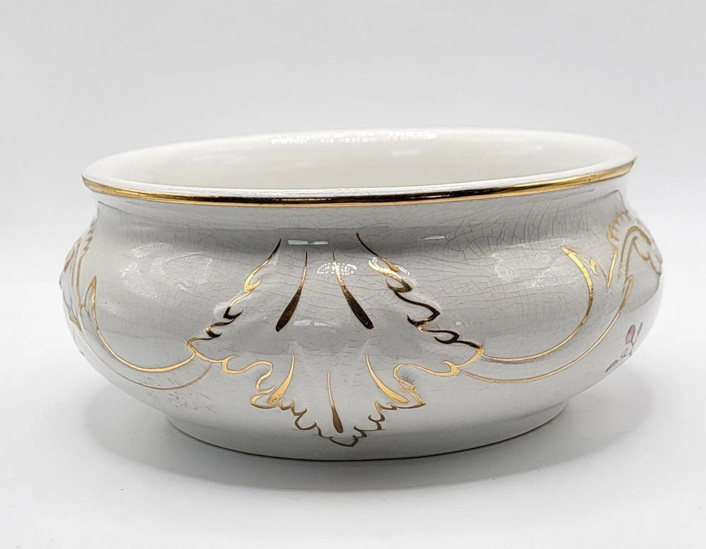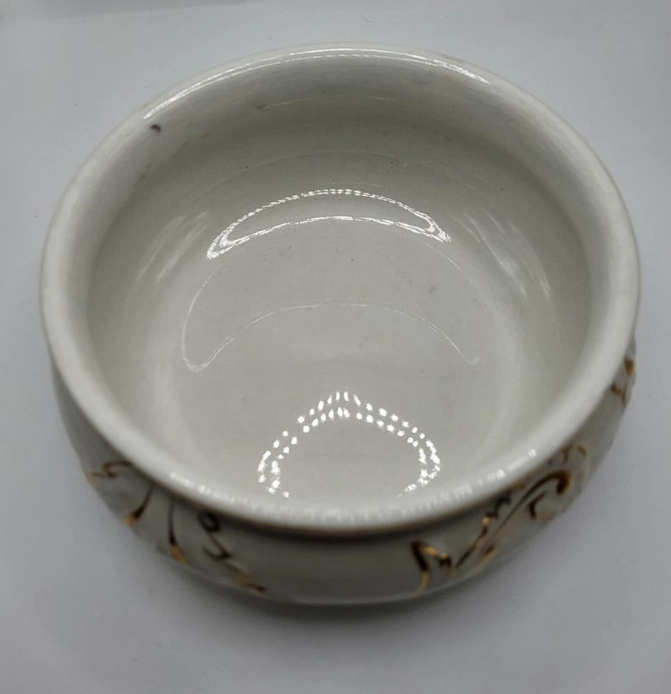 I am not sure about this piece. It's lovely, but I'm only guessing about the use. I'm going with shaving dish and that it is vintage. Or it could be a trinket dish. It appears to be hand painted with gold accents over embossing. The diameter measures 5 in. With a height of 2.5 in. The guilding is sharp and in good condition.