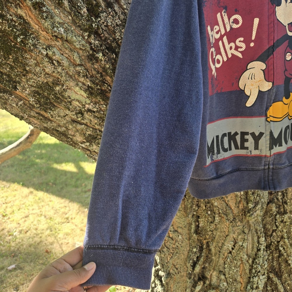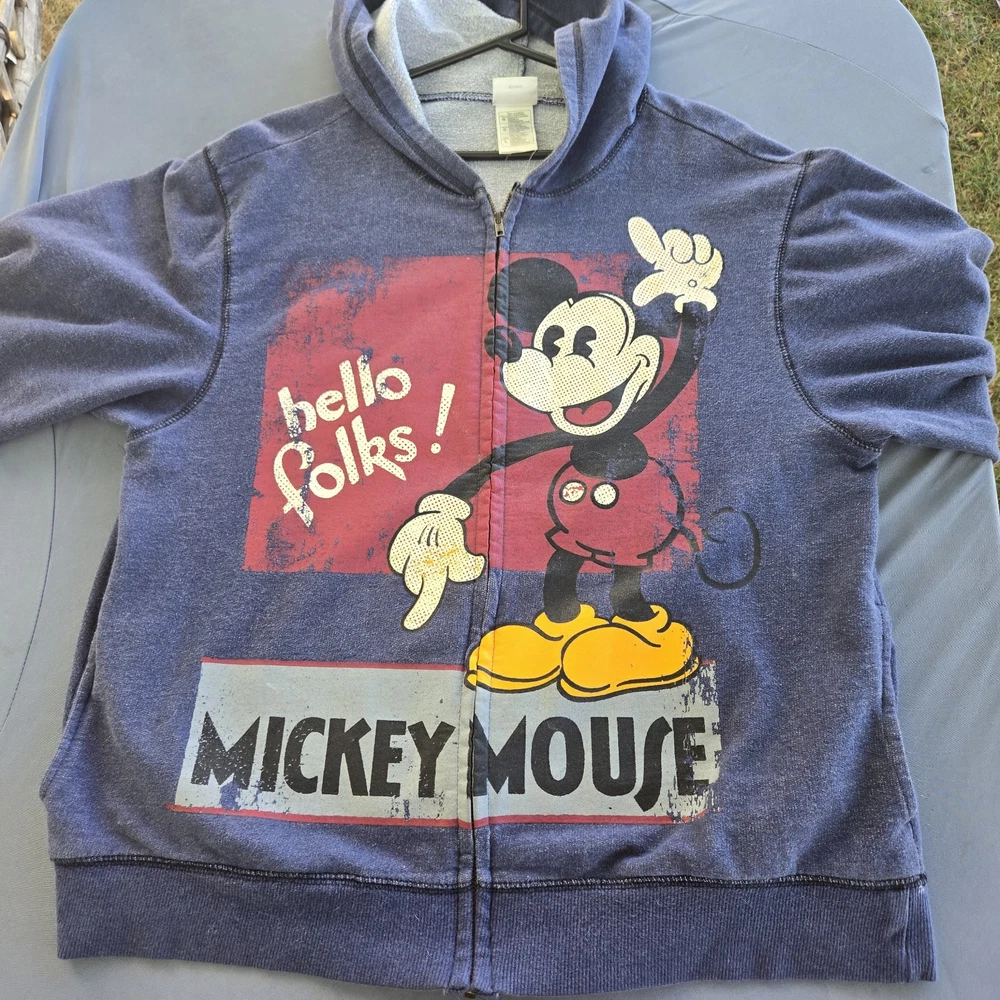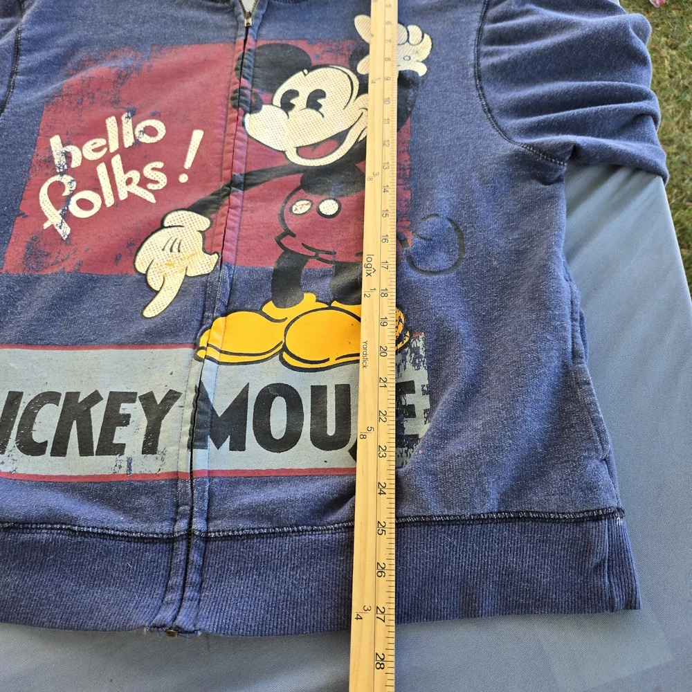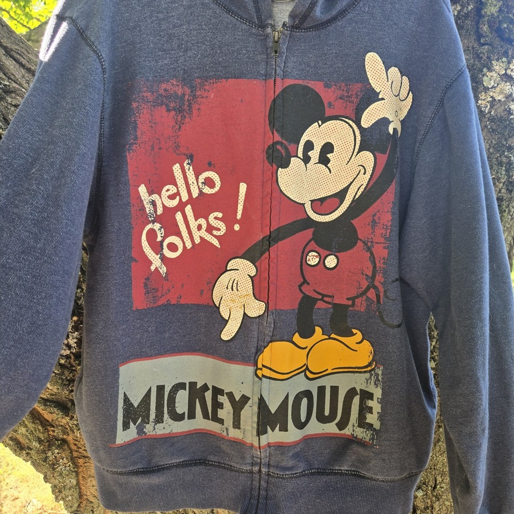 This Vintage Disney Store Mickey Mouse Hello Folks! Full Zip Size Large Retro Hoodie is a nostalgic piece of activewear with a cartoon theme and 90s retro style. Made from a blend of polyester and cotton, this hoodie features the iconic Mickey Mouse character with a graphic print and hooded design. The full zip closure and Crew Neck neckline make it easy to wear in all seasons, while the breathable material ensures comfort during various activities like gym training, walking, and running. Perfect for unisex adults who appreciate classic Disney characters and vintage style, this hoodie is a must-have for fans of Mickey Mouse and retro fashion.