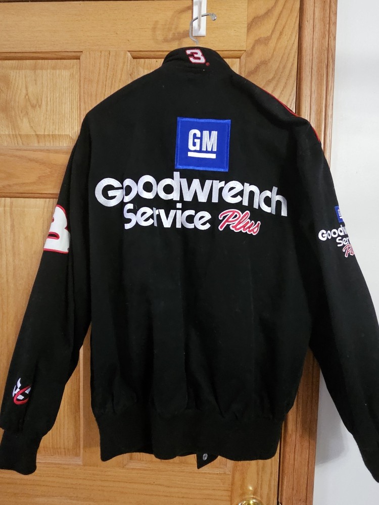 The product is a vintage Dale Earnhardt jacket from the 90s, featuring the iconic black color associated with the driver's Goodwrench sponsor. This jacket is a size small for men, showcasing the branding of Chase, the team of Richard Childress Racing. As a piece of fan apparel, it is a must-have for any NASCAR racing enthusiast looking to honor the legendary driver and his racing legacy.