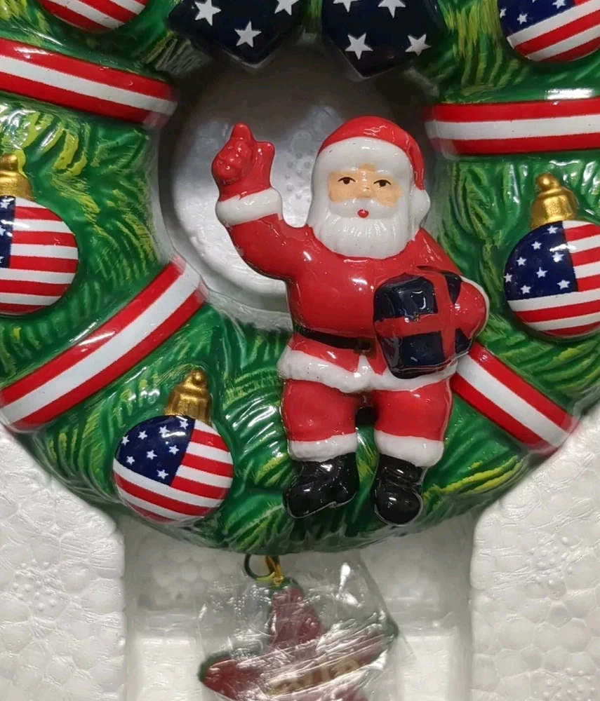 Celebrate the holiday season with this beautiful vintage Danbury Mint Patriotic Christmas Ornament. This ornament features a jolly Santa holding a wreath, perfect to add to your collection of ornaments. Made in 2016, this original piece is a must-have for any collector or enthusiast. The ornament is in great shape and comes in its original packaging, making it a perfect gift for a loved one or to keep in your collection. Add this Danbury Mint ornament to your collection today and enjoy its timeless beauty for years to come.