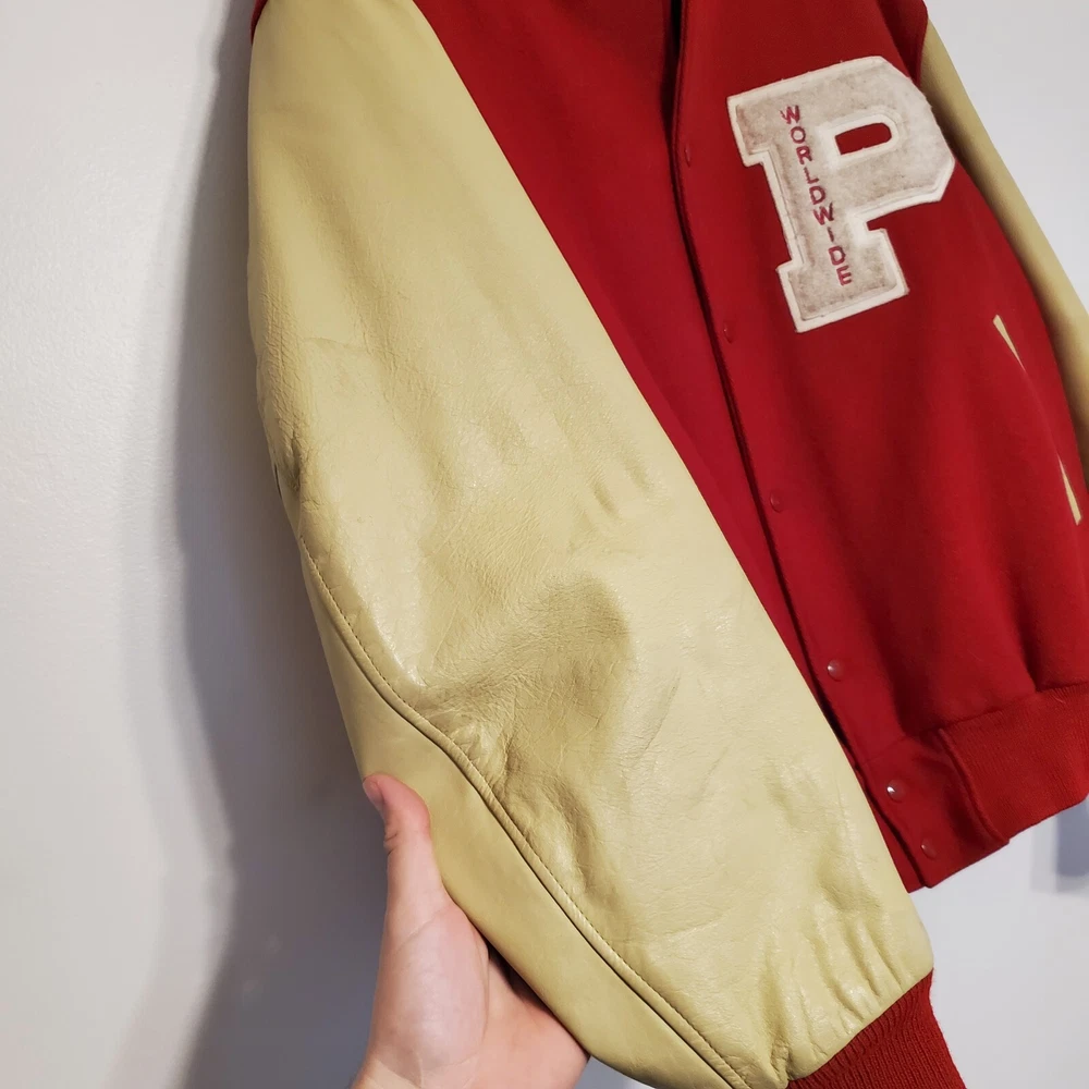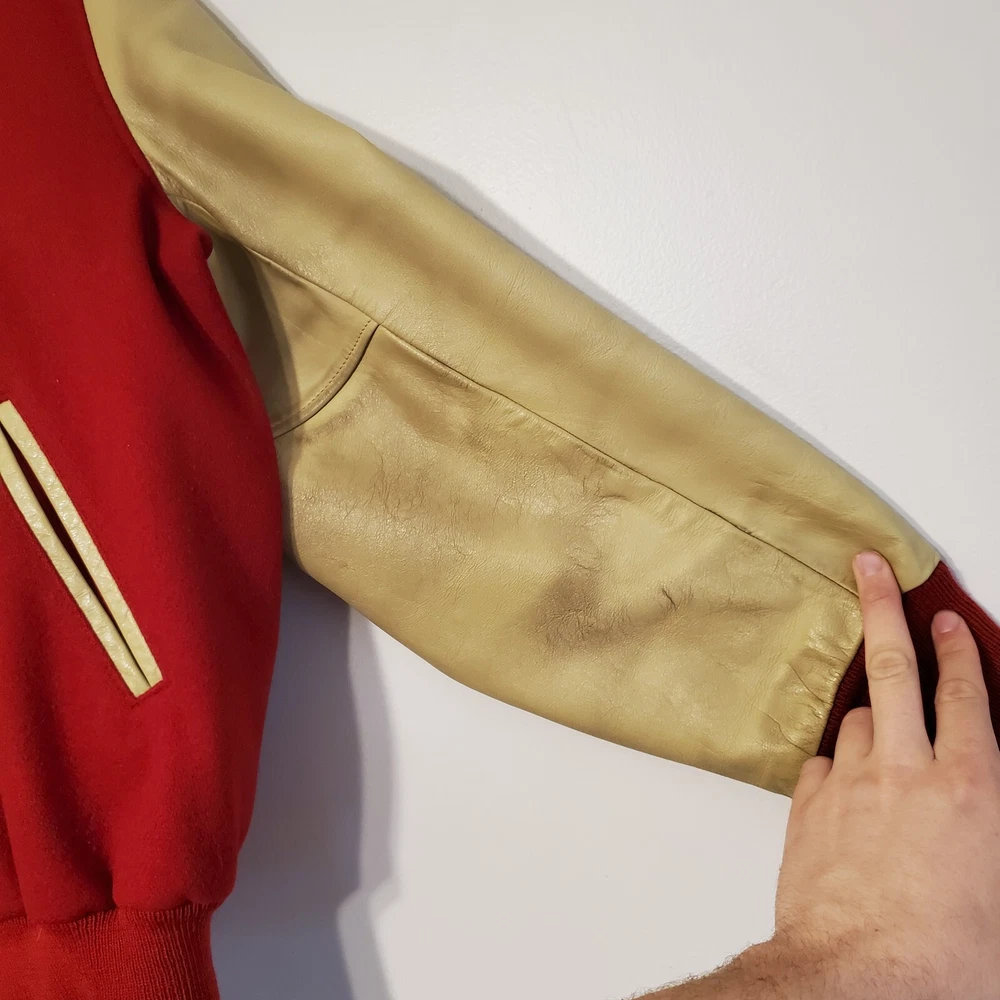 Great shape, has some light marks on leather sleeves but they should come off with a cleaning or magic eraser. Dated 1999 on an ebbets field jacket 26.5" pit to pit 28" length