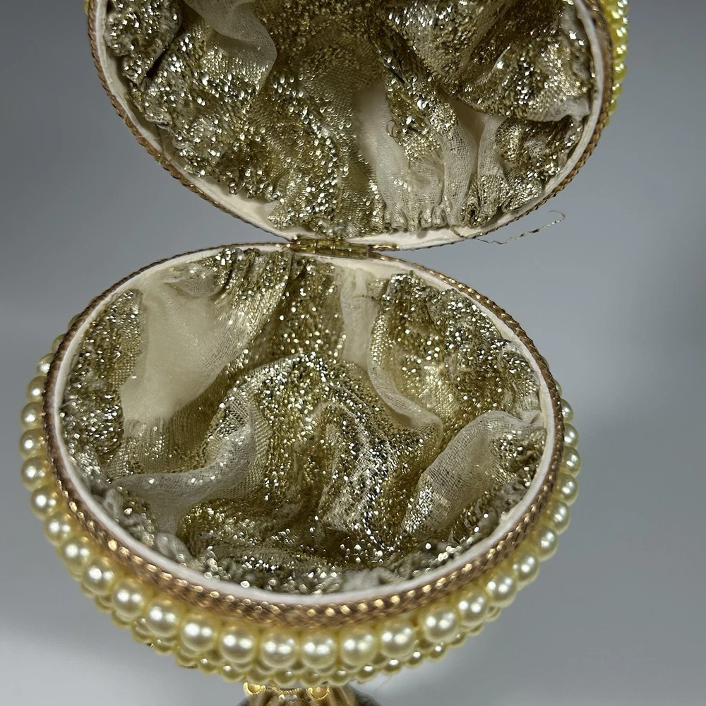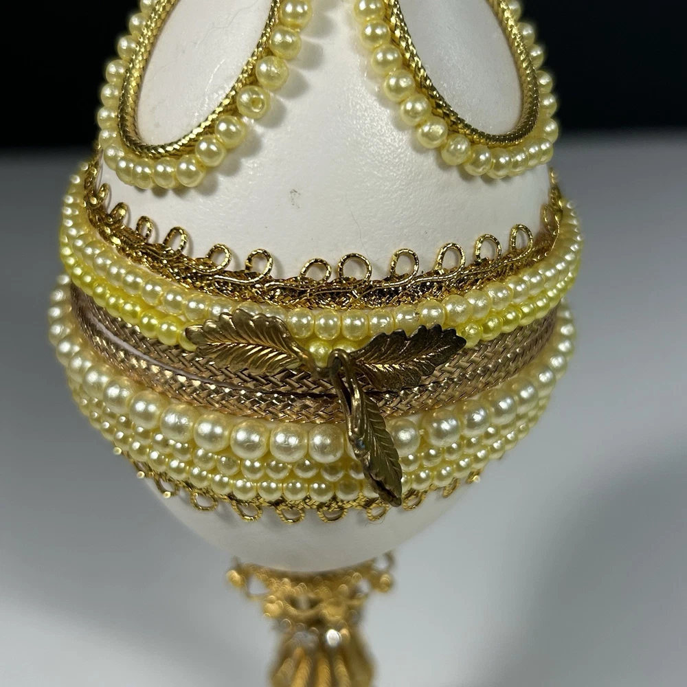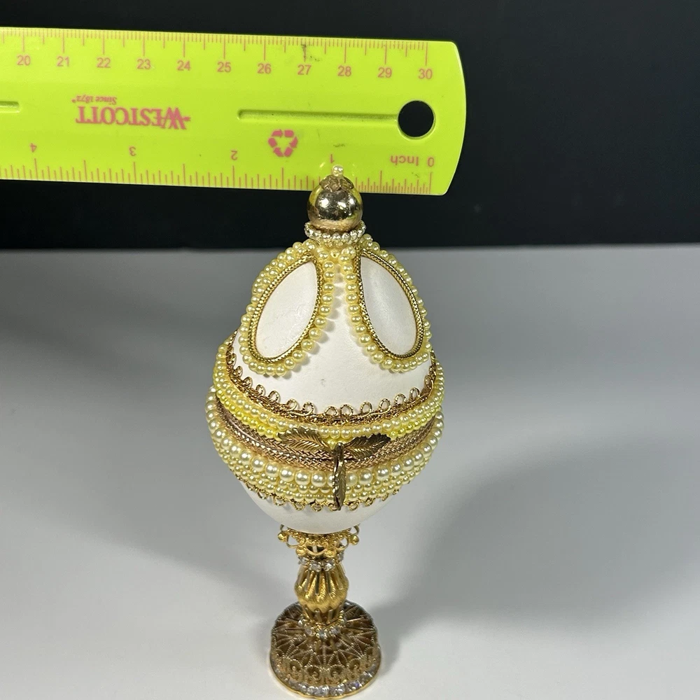 Vintage Decorative Egg Jewelry Box Floral Pearl Ornate Gold Rhinestone Stand Elevate your jewelry storage with a touch of vintage charm using this exquisite Vintage Decorative Egg Jewelry Box. Ornately designed with a hand-painted floral motif and accented with pearl and jewel embellishments, this gold-tone box boasts a majestic presence, making it a regal addition to any dresser or display cabinet. The box features a hinged top with a clasp closure, ensuring your precious items are kept secure while adding a dash of elegance to your space. Ideal for those who appreciate the allure of Victorian and Fabergé-inspired design, this unbranded jewelry box is a testament to classic style and craftsmanship. Whether it's a luxurious gift for an anniversary or a whimsical addition to your home decor, this collectible piece resonates with a romantic and feminine aesthetic, perfect for bridging the gap between functionality and decorative art. Please See All Pictures For Condition of Item and Details Before Purchasing ! Thank You For Looking and Have a Great Day!