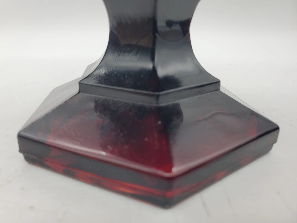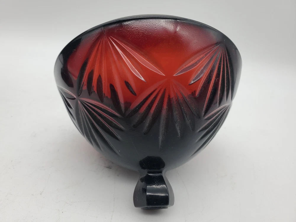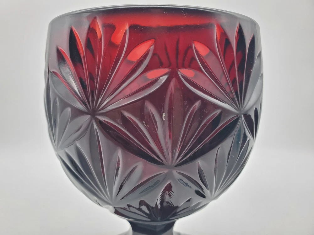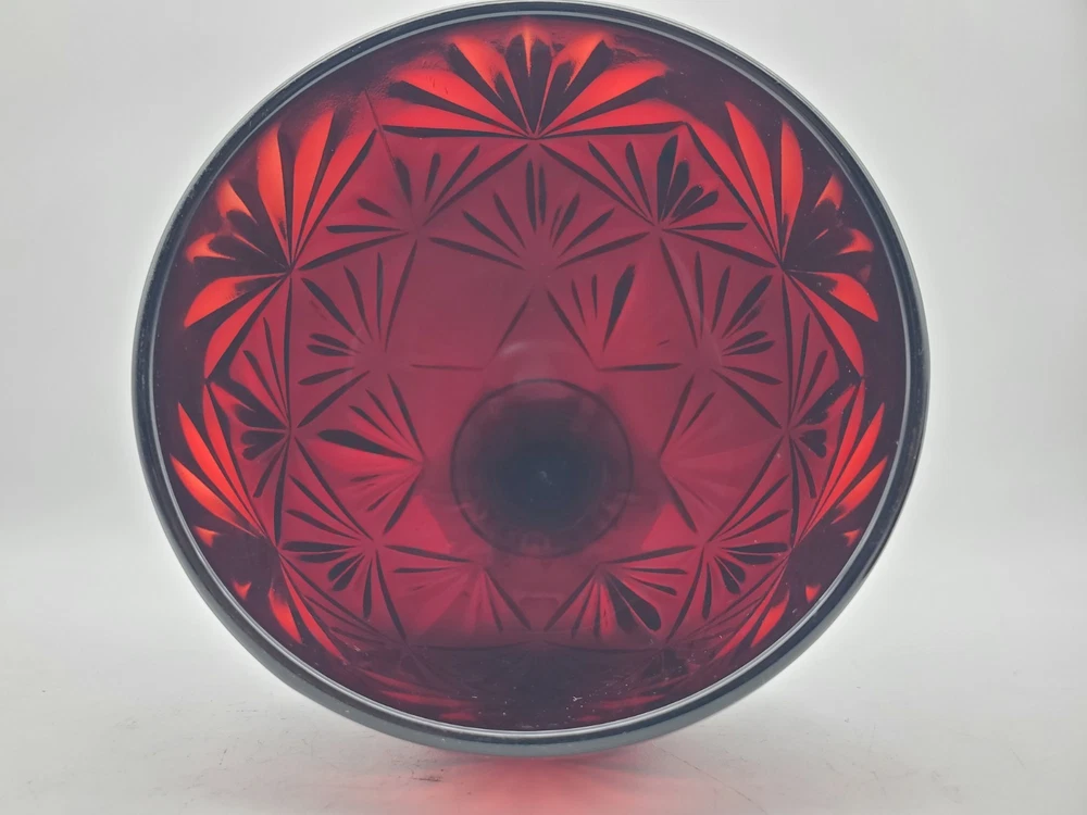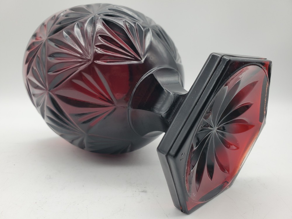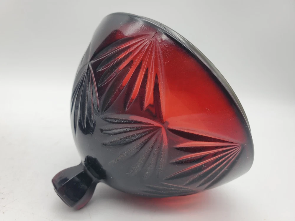 The Cristal D’arques Durand Luminarc Ruby Red Glass Egg Pedestal Candy Dish Jar is a stunning antique-style collectible featuring a vibrant red glass design. Made by the reputable brand Luminarc, this original piece adds a touch of elegance to any decor with its unique egg-shaped pedestal base. Perfect for displaying candy or potpourri, this beautiful glass dish is a must-have for collectors of decorative items. Made in France circa 1984, this piece features the beautiful fanned fern pattern and stands 8.75" tall with its lid and 4.5" in diameter. The deep red color makes it great for bright holiday candy, or any time of year.