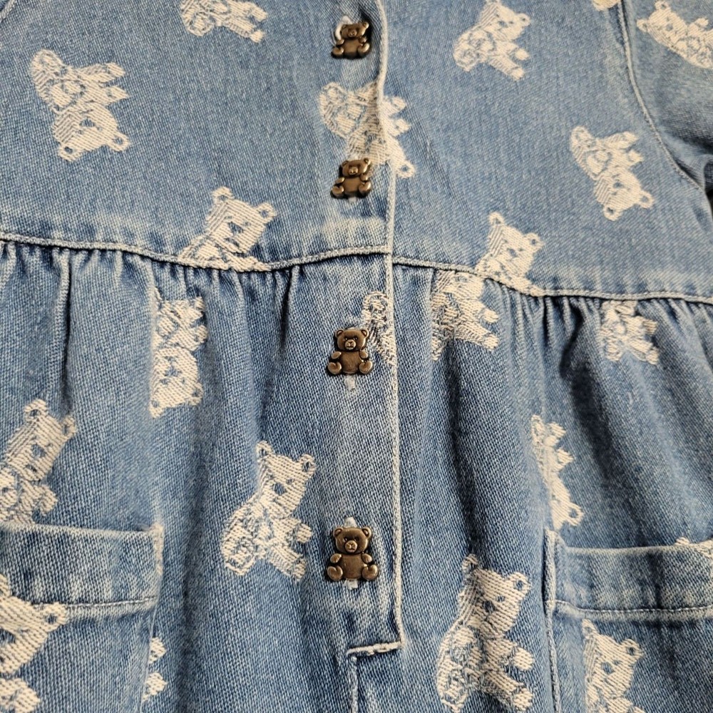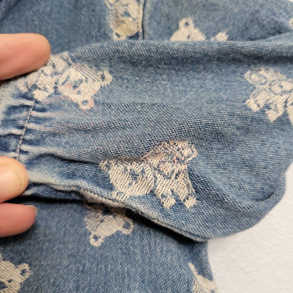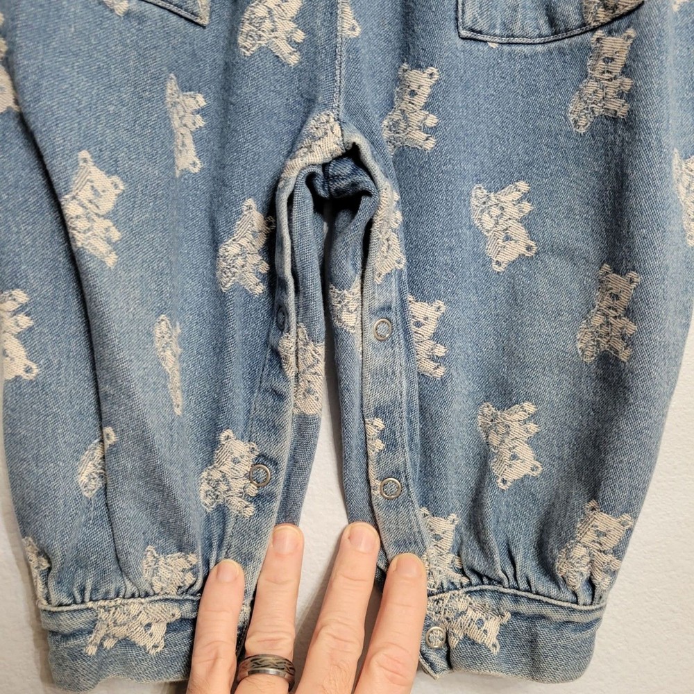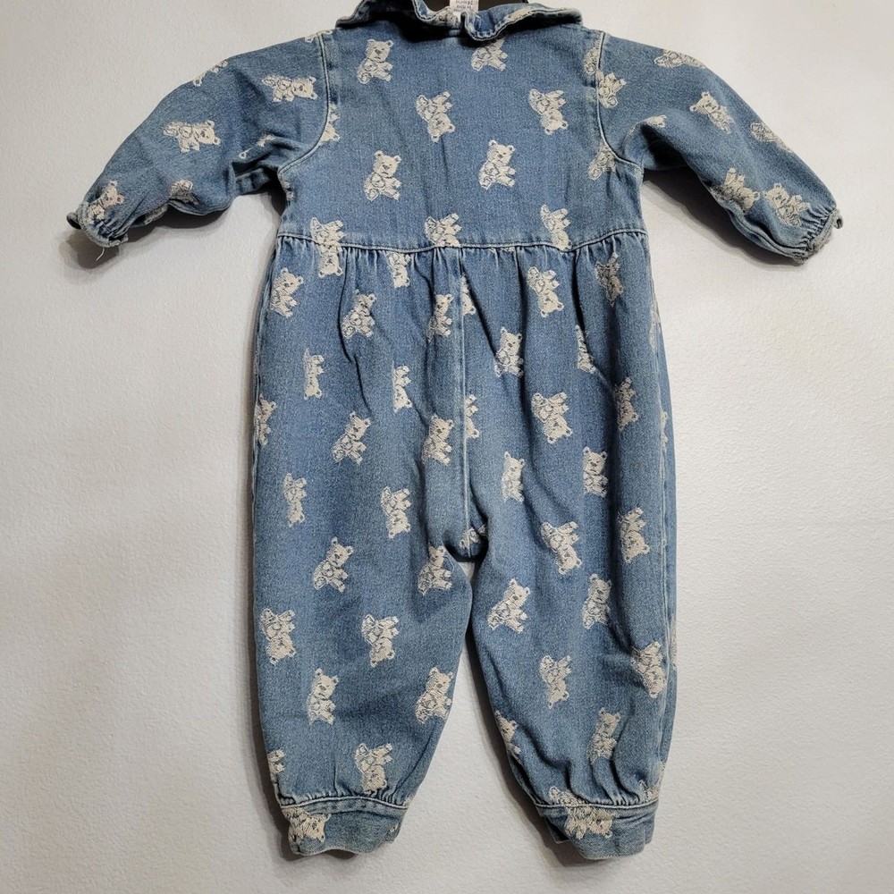 Vintage Denim Romper Jumpsuit All Over Teddy Bear Print Collared Ruffled 24 mo
