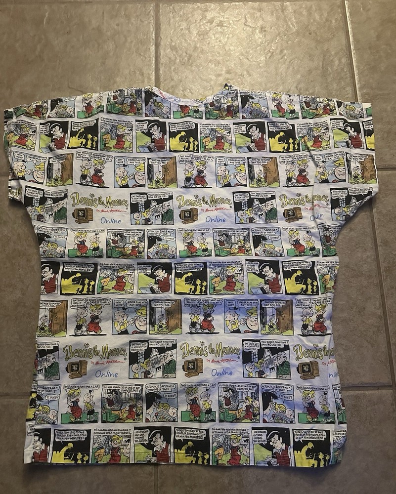 This vintage "Dennis the Menace" comic strip print scrub top in size small is a unique and nostalgic addition to any medical professional's wardrobe. Designed for women and featuring a playful comic strip print, this scrub top offers a fun and lighthearted touch to the medical industry. Made for comfort and functionality, this top combines style with practicality, making it a great choice for those who appreciate a touch of personality in their work attire. This is the cutest top ever. No size tag but is a small fit.