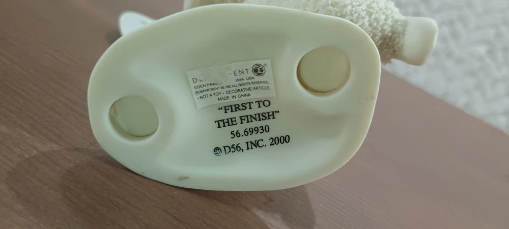 This is a vintage Department 56 figurine from the Snowbabies collection. The figurine features two snow babies racing each other and is titled "First To The Finish Line". It is made of ceramic and porcelain and was manufactured in China in the early 2000s. The figurine is white and has a snow pattern, and it is suitable for teens, adults, and girls who are interested in collectibles and holiday-themed items.