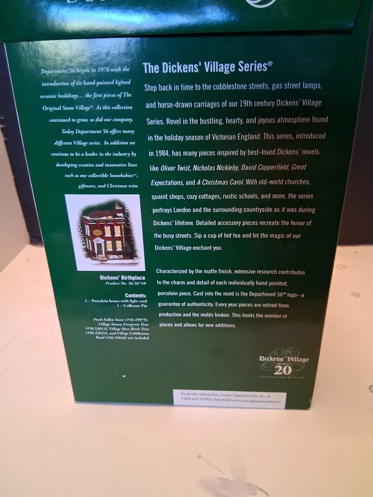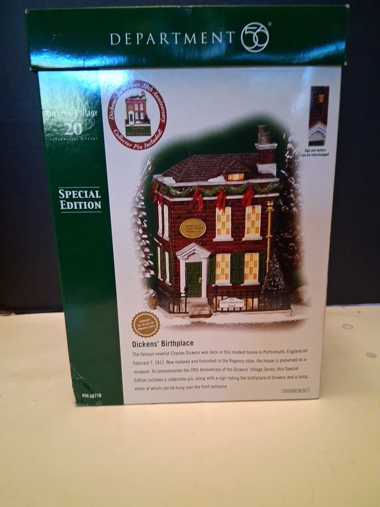 Add a touch of vintage charm to your holiday decor with this special edition Department 56 Dickens Village Building. With its asymmetrical shape and multicolor design, this porcelain piece is perfect for any room in your home. Whether you're a collector or just looking for a unique addition to your holiday display, this "Birthplace" village building is sure to impress. Pre-owned like new with original box and pin see pictures for details perfect for any dept 56 collector perfect addition to any Christmas Village display could make a great gift shipped right out USPS ground advantage Celebrate the season with this beautiful piece from the Dickens Village collection. With its intricate details and high-quality construction, it's a great investment that will bring joy for years to come. Perfect for Christmas enthusiasts who appreciate unique and timeless decorations.