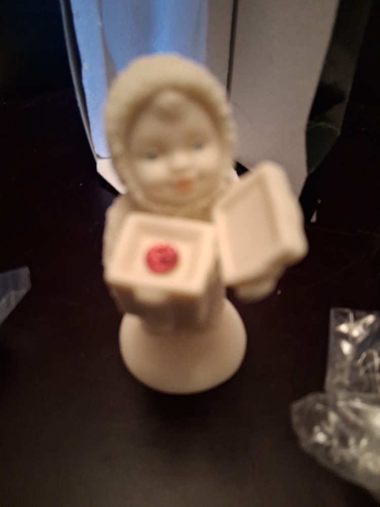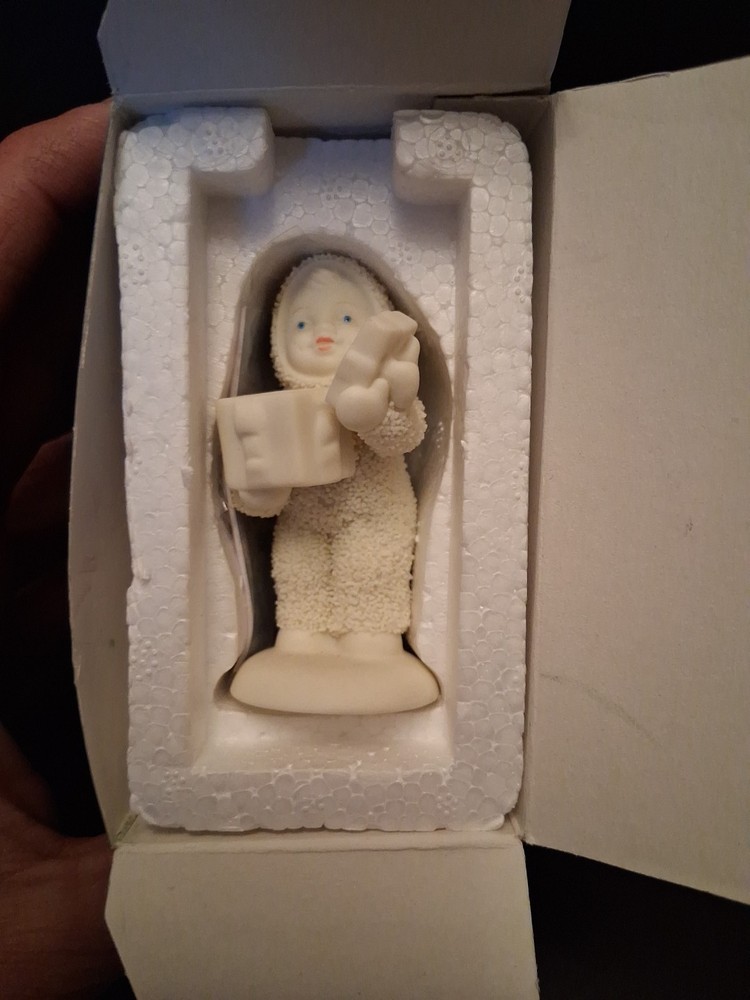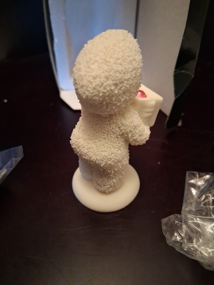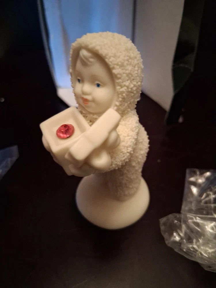 This is a vintage Department 56 Snow Babies figurine titled "A Gift for You" featuring a cute snowbaby with a crystal and textured finish. The figurine is made of porcelain and is part of the Snowbabies collection. It stands 3 inches tall and has a heart, mail, snow, love, baby, and birthday theme. The figurine is perfect for all occasions and is a great addition to any American style collection. Cute find like new condition see pictures for details perfect for any dept 56 Village collector nice addition could make a great gift shipped right out USPS ground advantage