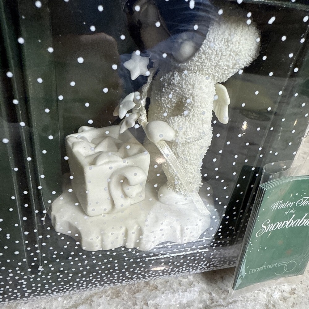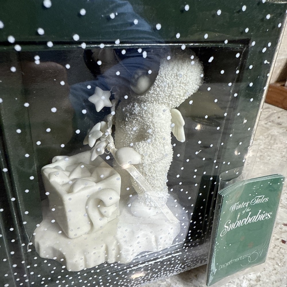 This vintage Dept 56 Snowbabies figurine, titled "STRINGING FALLEN STARS," is a beautiful addition to any holiday decor. Made of porcelain, this small figurine features a plain pattern and a white color finish. It depicts a child subject and is suitable for display on furniture. The figurine comes in its original box, making it a great gift option for collectors or as a seasonal decoration. Manufactured in Taiwan in 1992, this original piece from the Snowbabies collection is perfect for those who appreciate 1980s style. Add it to your collection today!