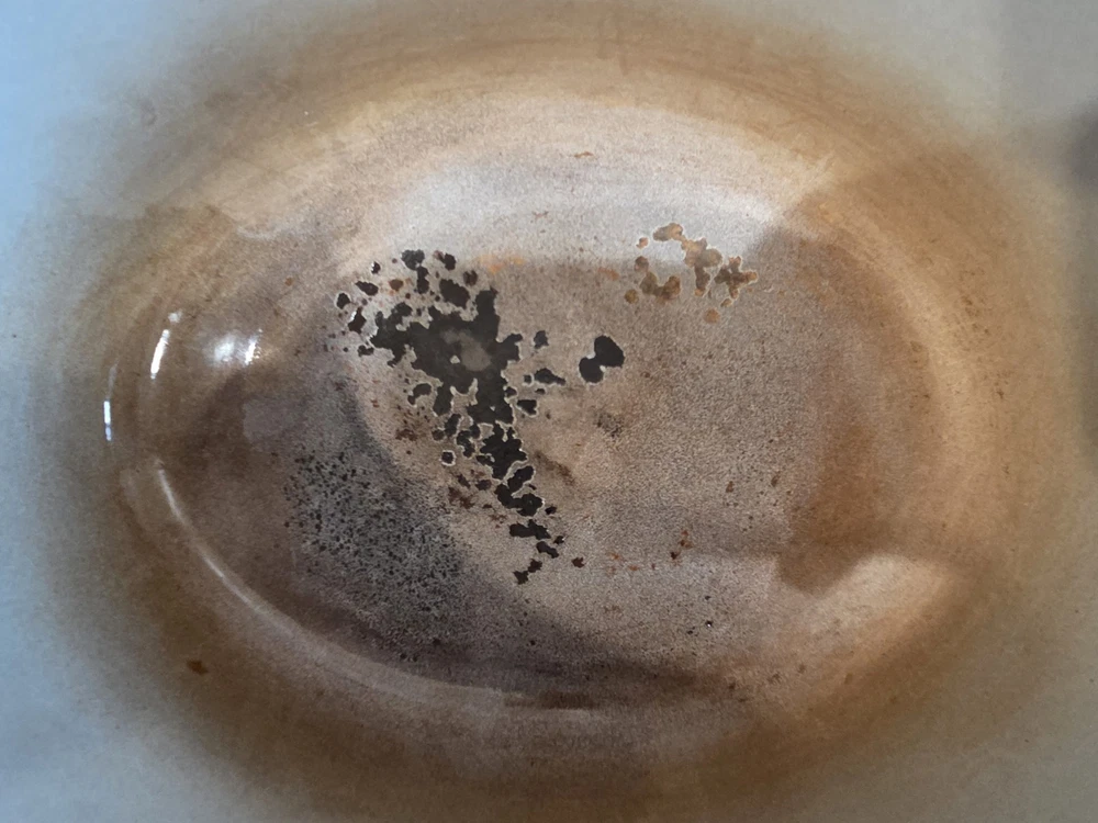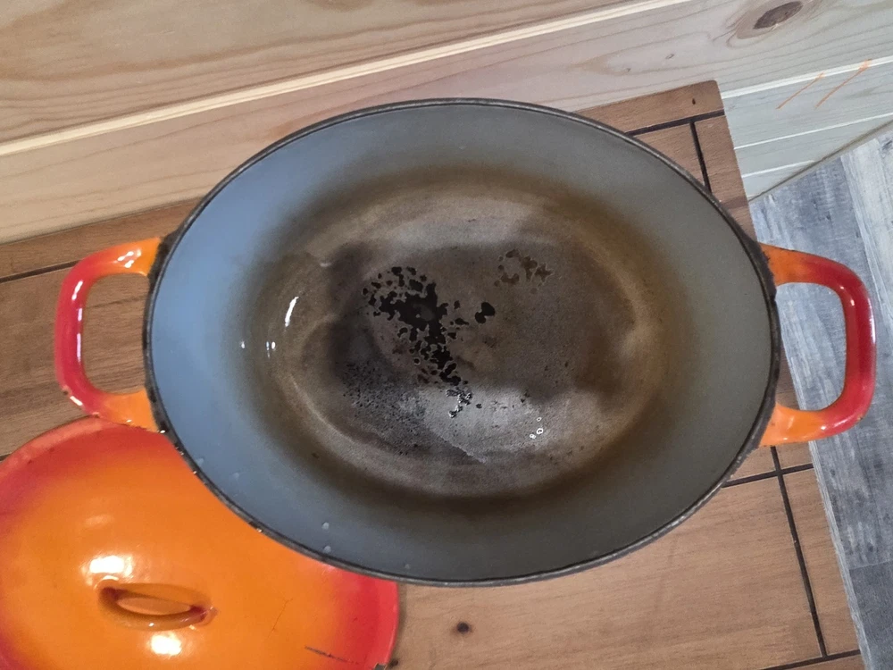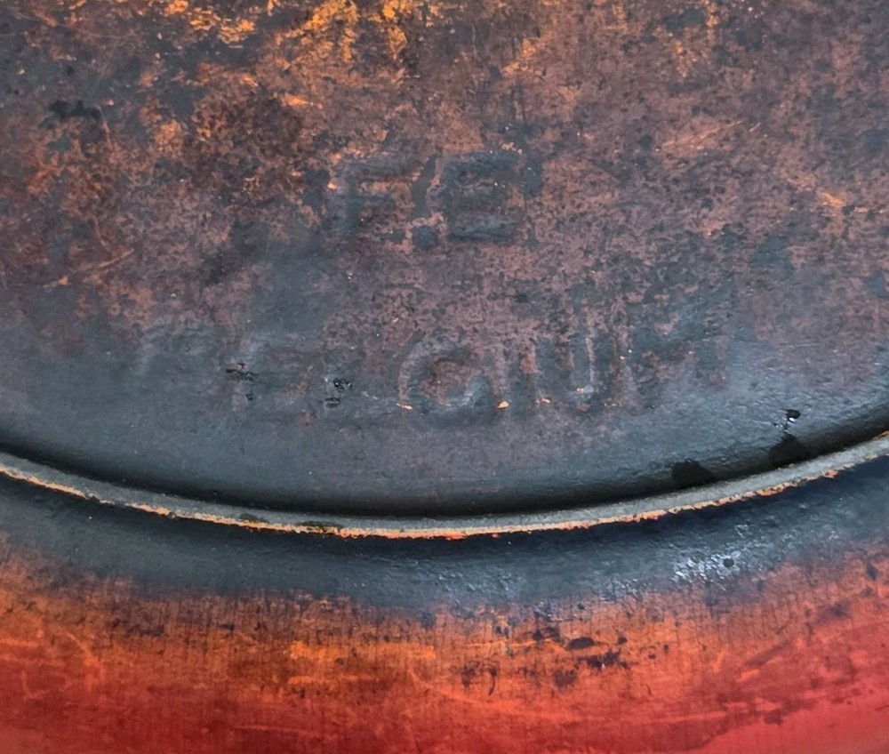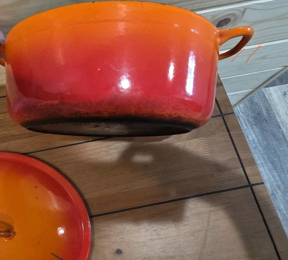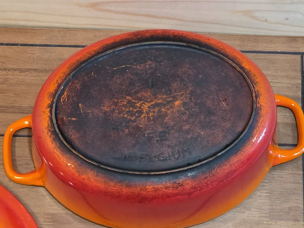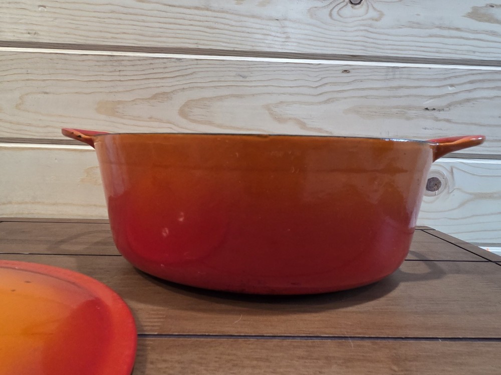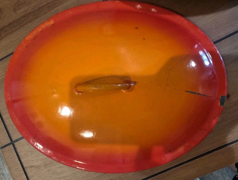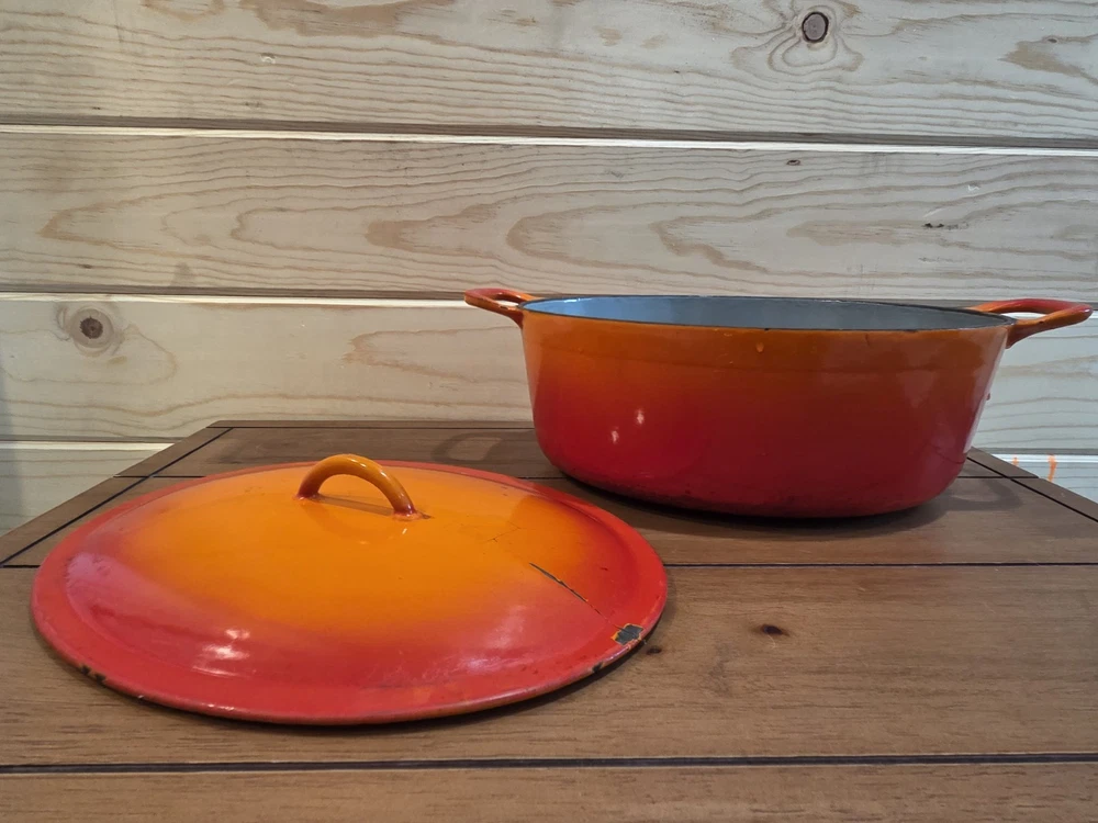 VTG cast iron enamel oval Dutch oven. Chipping to enamel on interior as noted in photos