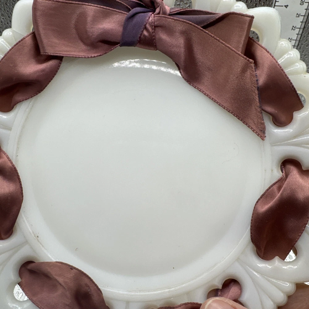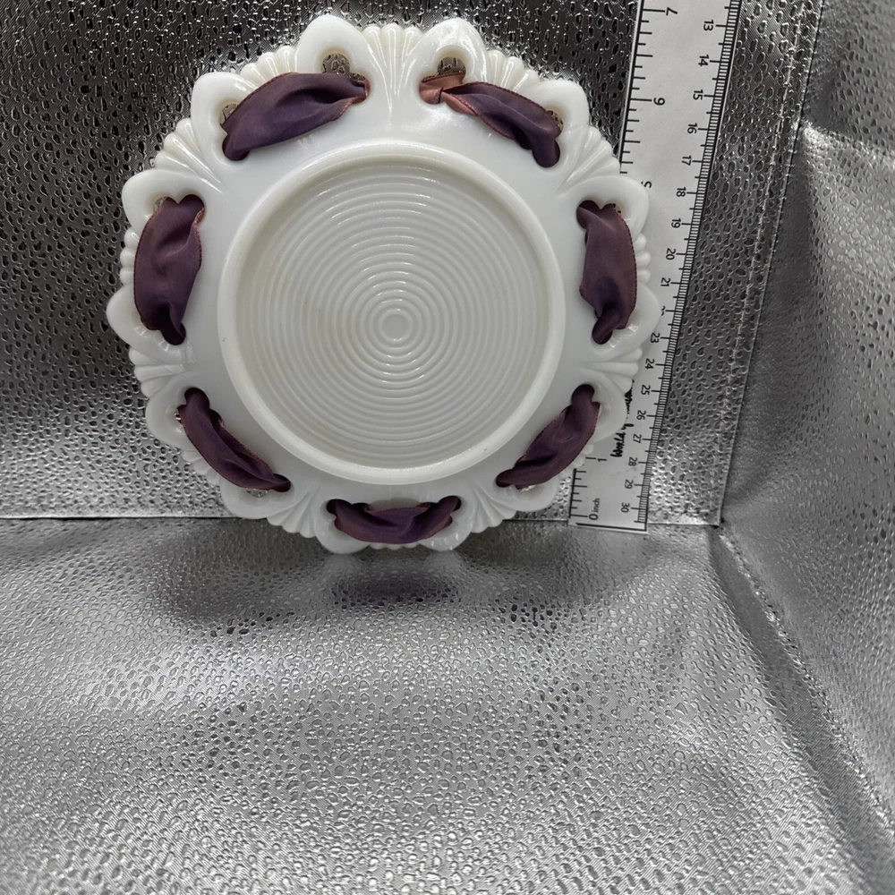 This vintage dessert serving set features a ten-piece collection of milk glass items with a lace edge design. The set includes snack plates, dessert bowls, dessert plates, serving bowls, salad plates, ice cream bowls, side plates, and starter plates, all in a glossy white finish. Made in America, these antique pieces are perfect for all occasions and add a touch of elegance to any table setting. The unmarked brand and vintage production style contribute to the charm and authenticity of this milk glass serving set.