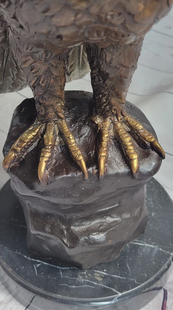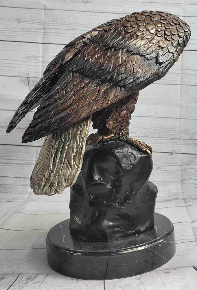 Condition : This sculpture is in perfect condition. Bronze Dimensions with Marble Base: Height 14" X Width 15" Marble Dimensions: Diameter 7" Height without base:13" Weight:20 LBS Inventory:29-5660012592 This captivating bronze sculpture portrays a magnificent bird, settling gracefully onto a rugged rock after an arduous journey away from the harsh, wintry tempests. With its powerful yet delicate presence, the bird perches majestically atop the rock, offering a panoramic view of the sprawling land below. The artist's intricate craftsmanship is reflected in the sculpture's meticulously rendered feathers, which capture the bird's beauty and grace in stunning detail, evoking a profound sense of the natural world's awe-inspiring wonder and splendor. Resting on a sleek black marble base, this sculpture stands as a testament to the artist's skillful interpretation of the avian form and the captivating allure of the wildlife it represents. The sculpture's seamless integration with the black marble base not only enhances its visual appeal but also accentuates the artwork's overall elegance and artistic significance. Crafted with meticulous attention to detail using the esteemed lost wax method, the sculpture embodies the artist's commitment to capturing the essence of the avian world and its natural magnificence. The intricate design and lifelike portrayal of the bird's form and features showcase the artist's profound understanding of the subject, elevating the sculpture to a captivating representation of the delicate balance between artistry and nature. Signed by the renowned artist Moigniez, this exceptional bronze sculpture serves as a stunning tribute to the timeless beauty and majesty of the avian realm, offering viewers a captivating glimpse into the enchanting world of wildlife and artistry. Bronze Sculpture Statue of Bald Eagle by Moigniez Marble Base Outdoor 14\" x 15\" 56600 Video will open in a new window Using the eBay App? Paste link into a browser window: [isdntekvideo]