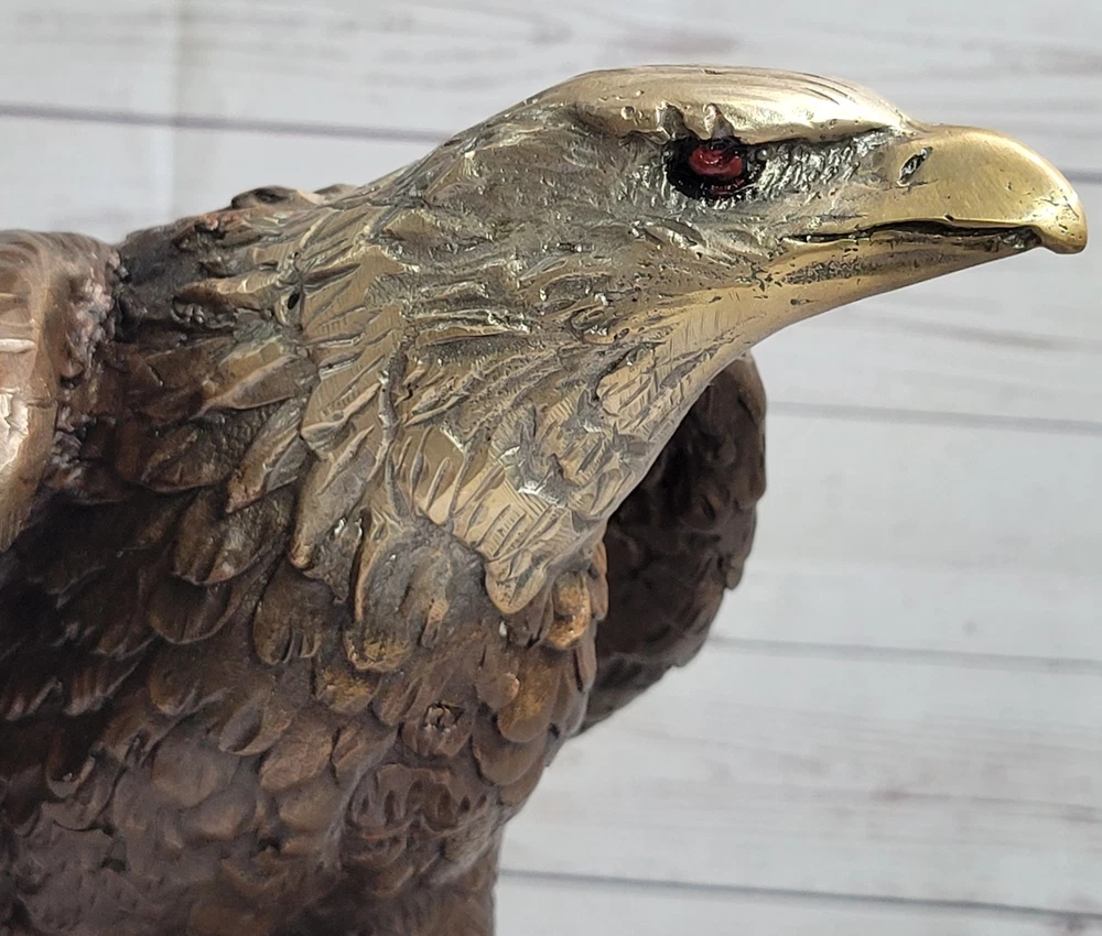 Condition : This sculpture is in perfect condition. Bronze Dimensions with Marble Base: Height 14" X Width 15" Marble Dimensions: Diameter 7" Height without base:13" Weight:20 LBS Inventory:29-5660012592 This captivating bronze sculpture portrays a magnificent bird, settling gracefully onto a rugged rock after an arduous journey away from the harsh, wintry tempests. With its powerful yet delicate presence, the bird perches majestically atop the rock, offering a panoramic view of the sprawling land below. The artist's intricate craftsmanship is reflected in the sculpture's meticulously rendered feathers, which capture the bird's beauty and grace in stunning detail, evoking a profound sense of the natural world's awe-inspiring wonder and splendor. Resting on a sleek black marble base, this sculpture stands as a testament to the artist's skillful interpretation of the avian form and the captivating allure of the wildlife it represents. The sculpture's seamless integration with the black marble base not only enhances its visual appeal but also accentuates the artwork's overall elegance and artistic significance. Crafted with meticulous attention to detail using the esteemed lost wax method, the sculpture embodies the artist's commitment to capturing the essence of the avian world and its natural magnificence. The intricate design and lifelike portrayal of the bird's form and features showcase the artist's profound understanding of the subject, elevating the sculpture to a captivating representation of the delicate balance between artistry and nature. Signed by the renowned artist Moigniez, this exceptional bronze sculpture serves as a stunning tribute to the timeless beauty and majesty of the avian realm, offering viewers a captivating glimpse into the enchanting world of wildlife and artistry. Bronze Sculpture Statue of Bald Eagle by Moigniez Marble Base Outdoor 14\" x 15\" 56600 Video will open in a new window Using the eBay App? Paste link into a browser window: [isdntekvideo]