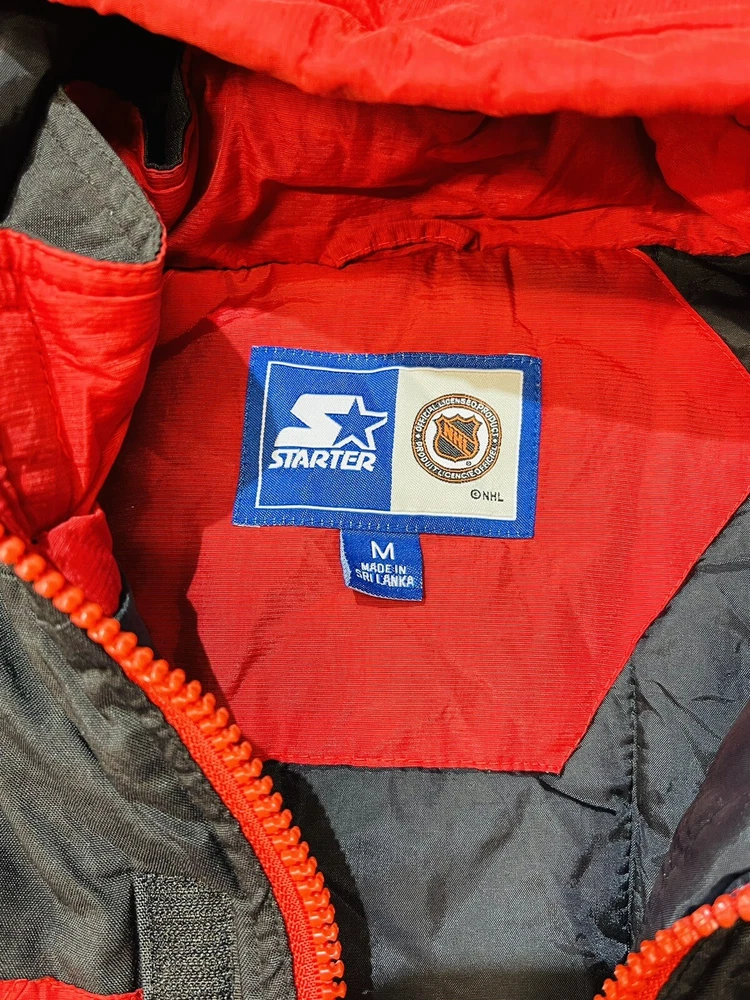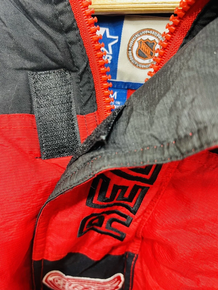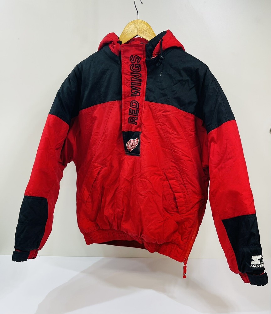 Vintage Detroit Red Wings Starter Jacket Adult Pullover Hooded NHL Medium The jacket is in good condition with some spots presents, one of the hook and loops has the stitching coming undone, but a few stitches and it will be back to normal. Size medium, made in Sri Lanka.