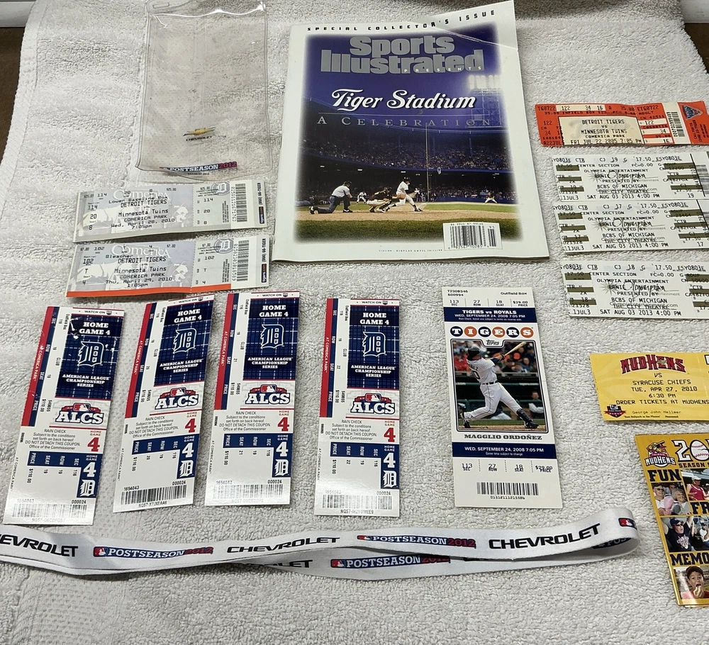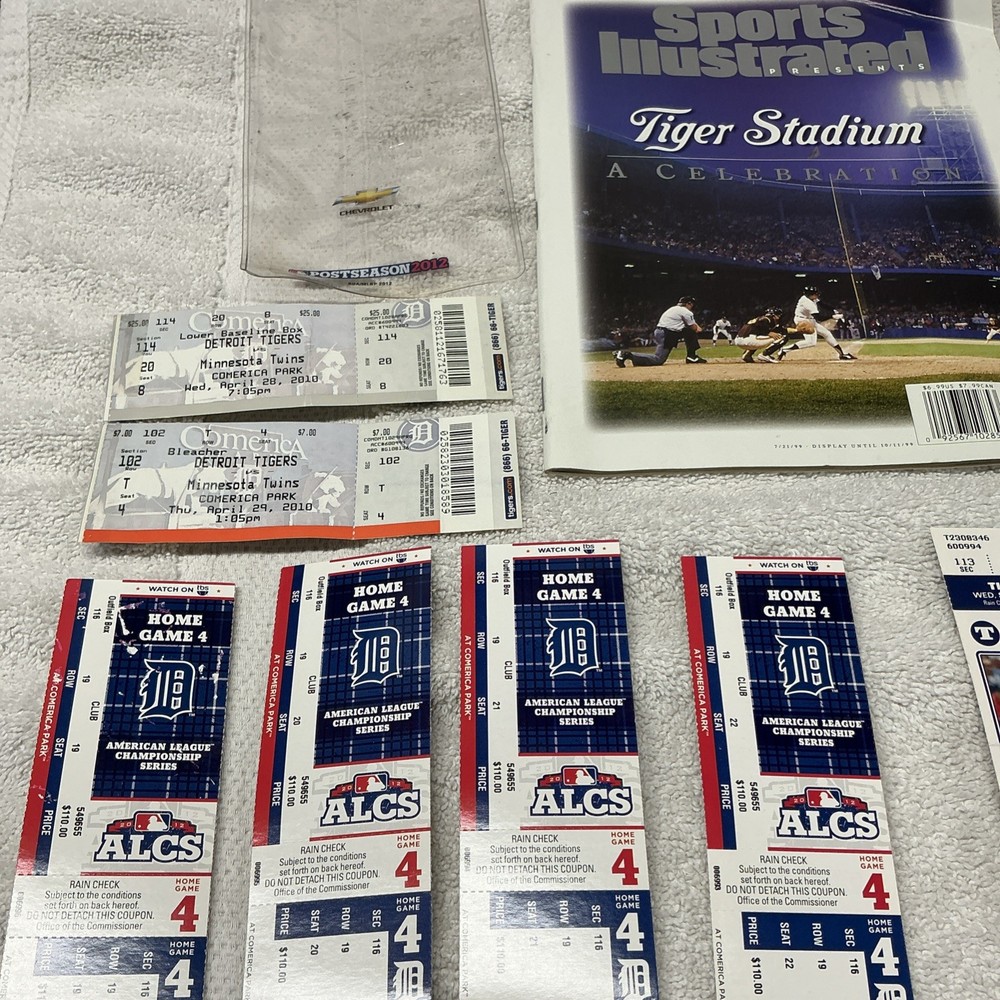 For all you Detroit Tigers fans out there, here's a wonderful piece of vintage sports memorabilia featuring your favorite team. This item includes a magazine looking at Tiger Stadium memories It's the perfect addition to any baseball fan's collection. The memorabilia from Tiger Stadium includes a ticket stub, program, and other related items. This is a must-have for any true Tigers fan and a great way to commemorate the team's storied history. Detroit Tiger rally towel. As pictured