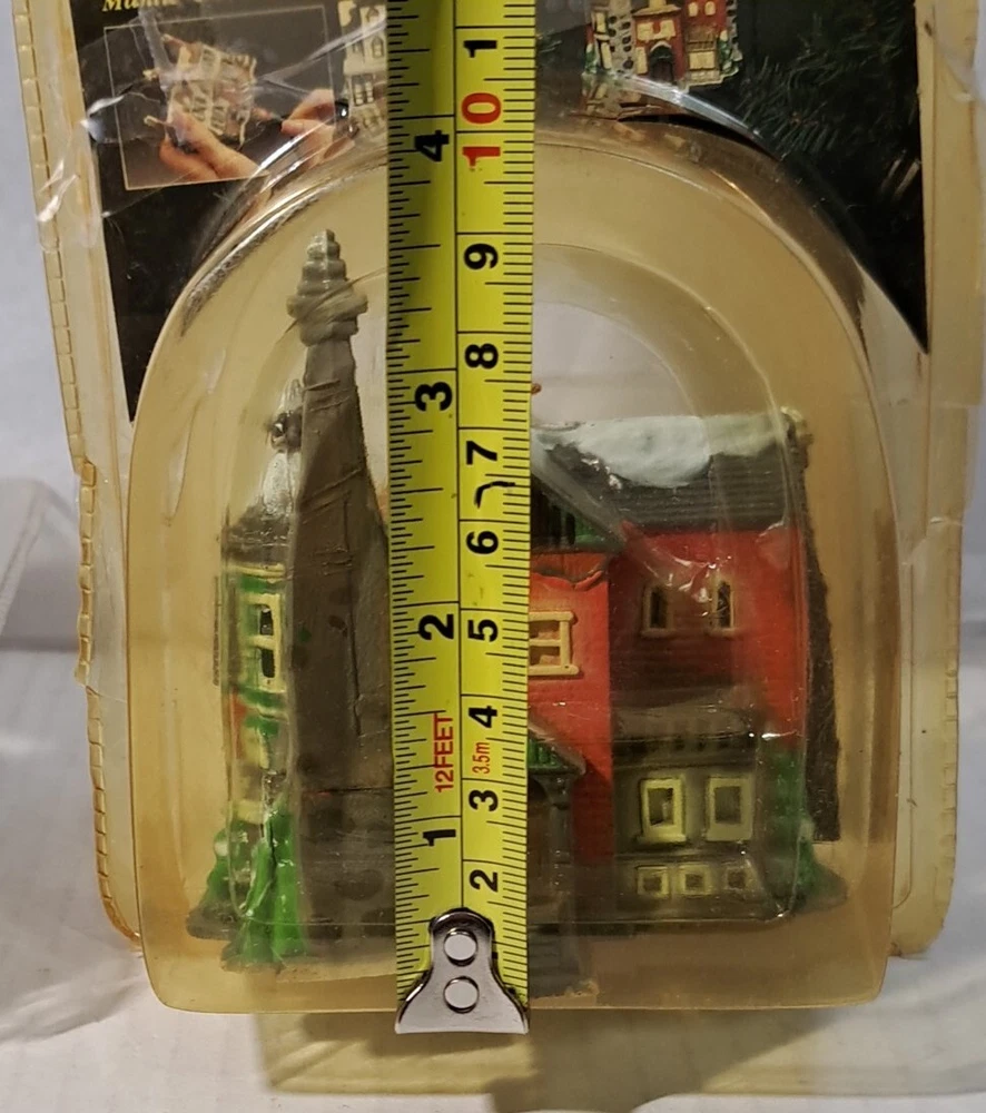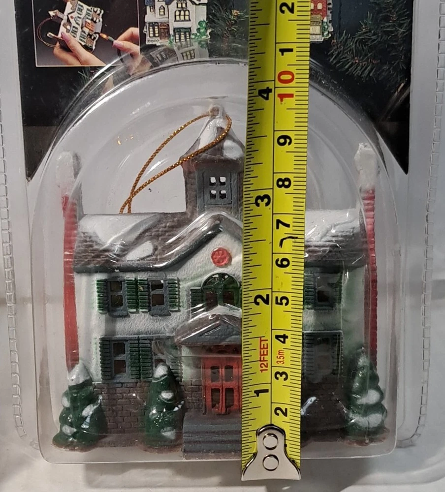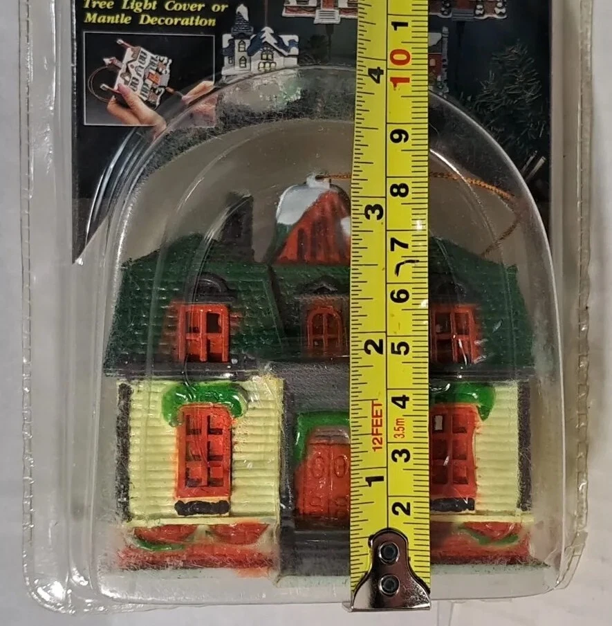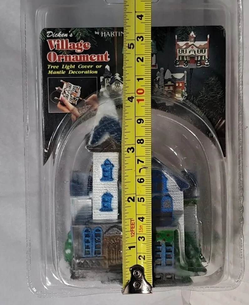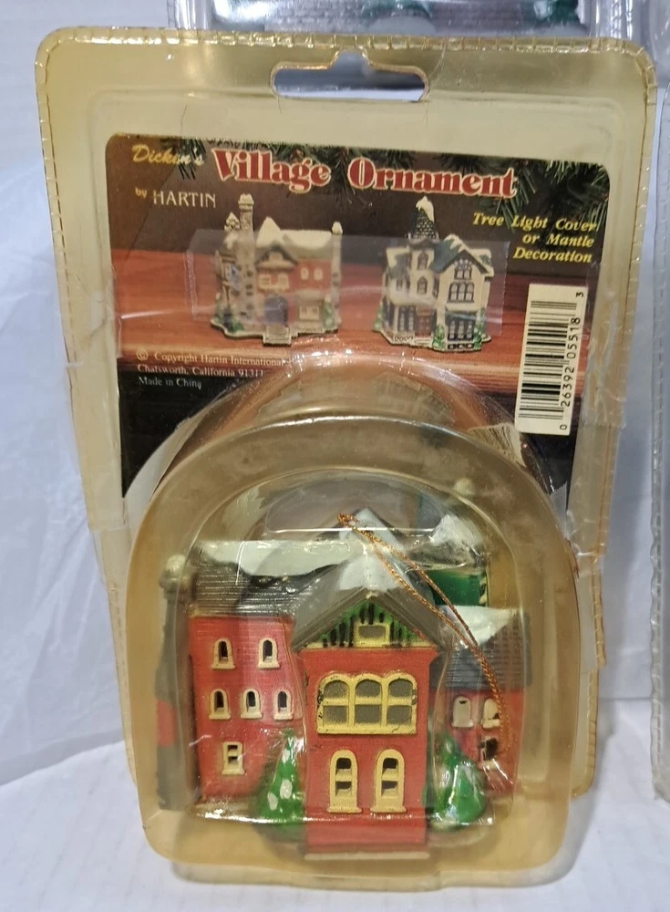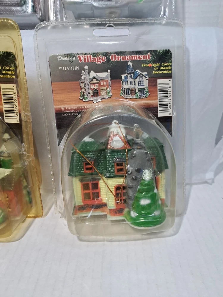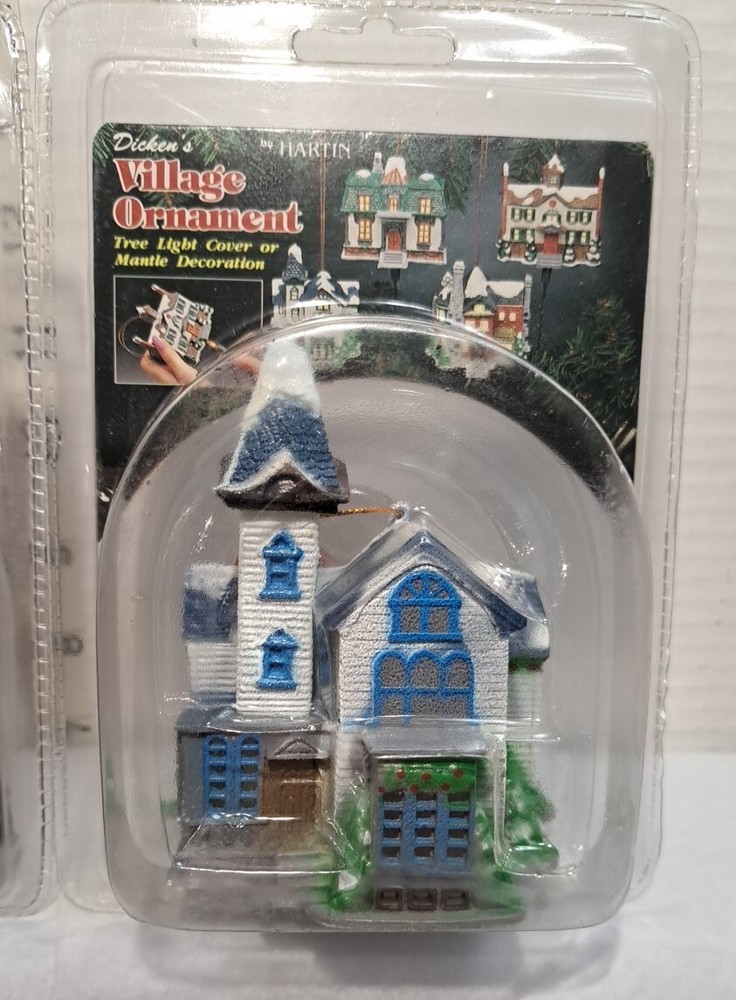 Vintage Tree Light Cover Hartin Dickens Village House Christmas Ornament 4pc set - Included in this set is houses 1 through 4 See photos for measurements These are vintage new House number 1's packaging has a little yellowing and a few cracks/splits but the house is unaffected House number 4's packaging has yellowed and became brittle with age so there is tape on this ones packaging as there is several cracks/splits in the packaging - the house inside the packaging appears to be just fine. Please see photos Please view all photos zooming in on them as they are part of the description for you to judge conditi