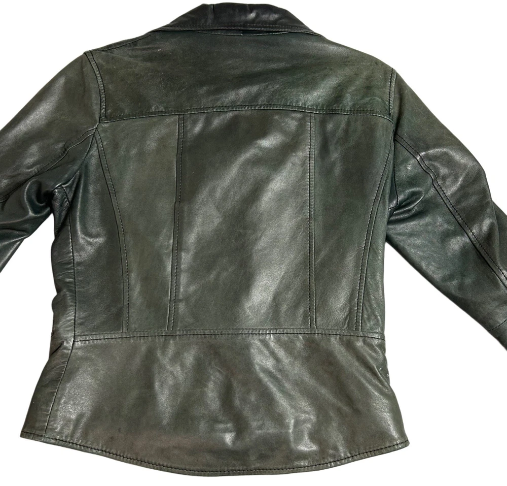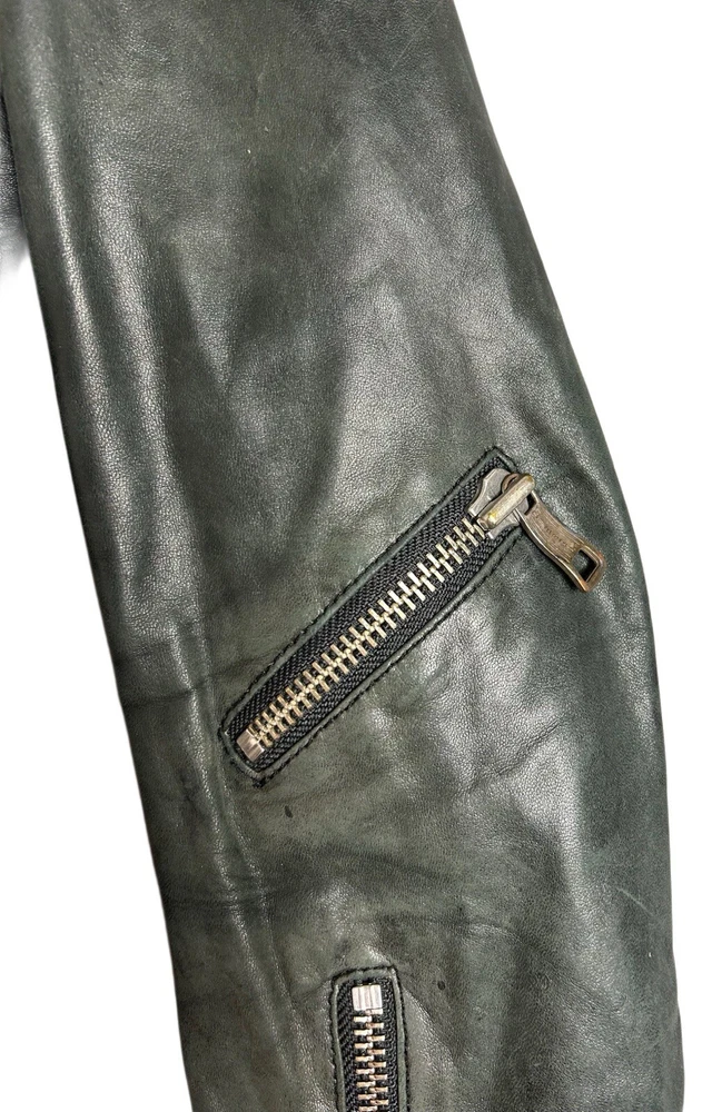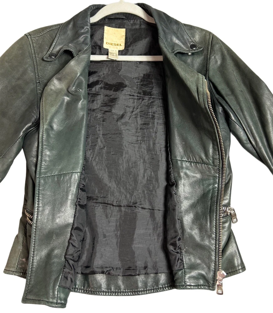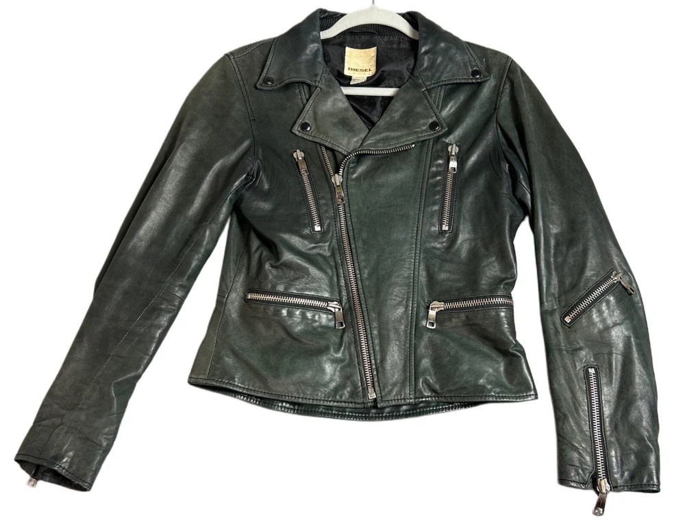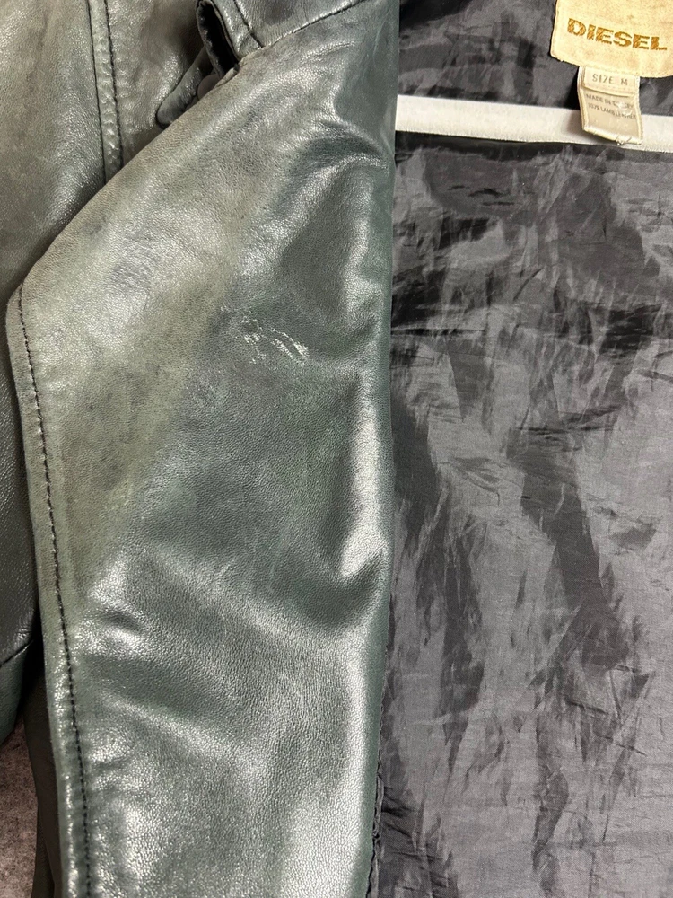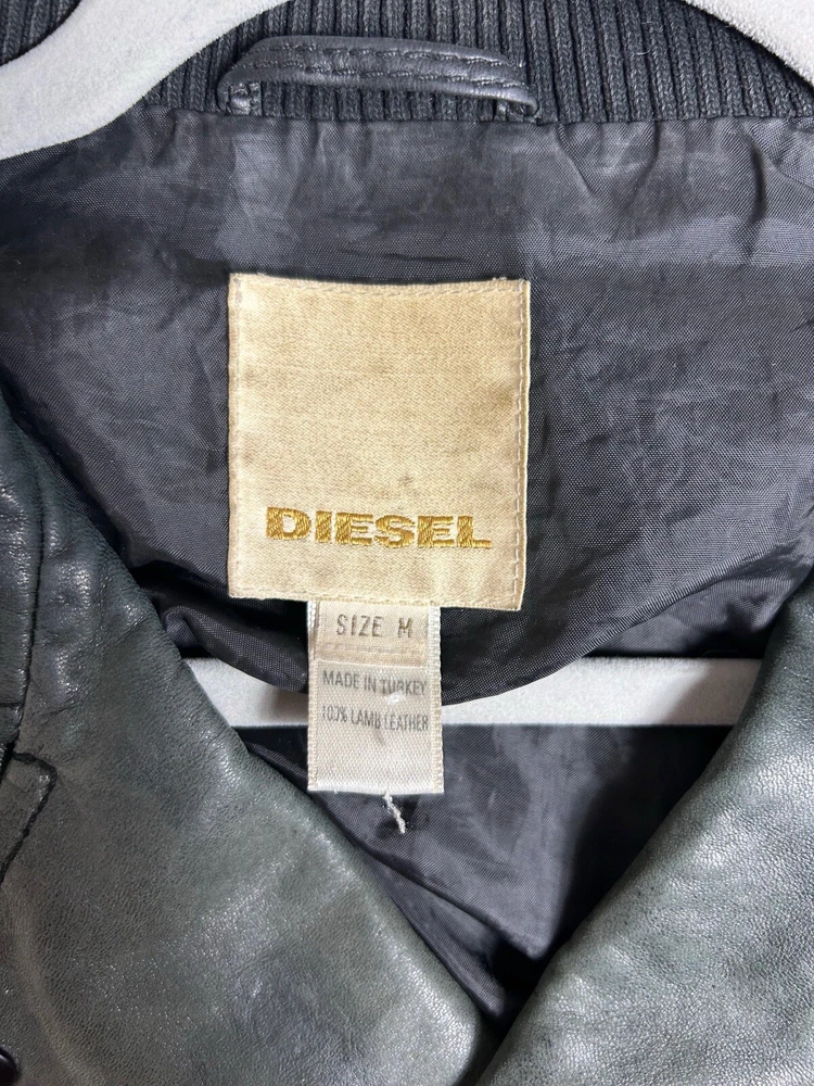 Vintage Women Diesel zipped Moto jacket. Size M Measurements have been provided in the photos. Lamb skin leather Made in Turkey Color: Black The leather on the jacket shows common vintage wear. Some areas of the leather look faded in color. Flaws: Few white stains. ( I have provided pictures ) 2 small spots where the leather has peeled. ( I have provided pictures ) 1 small tear on the sleeve ( I have provided pictures )