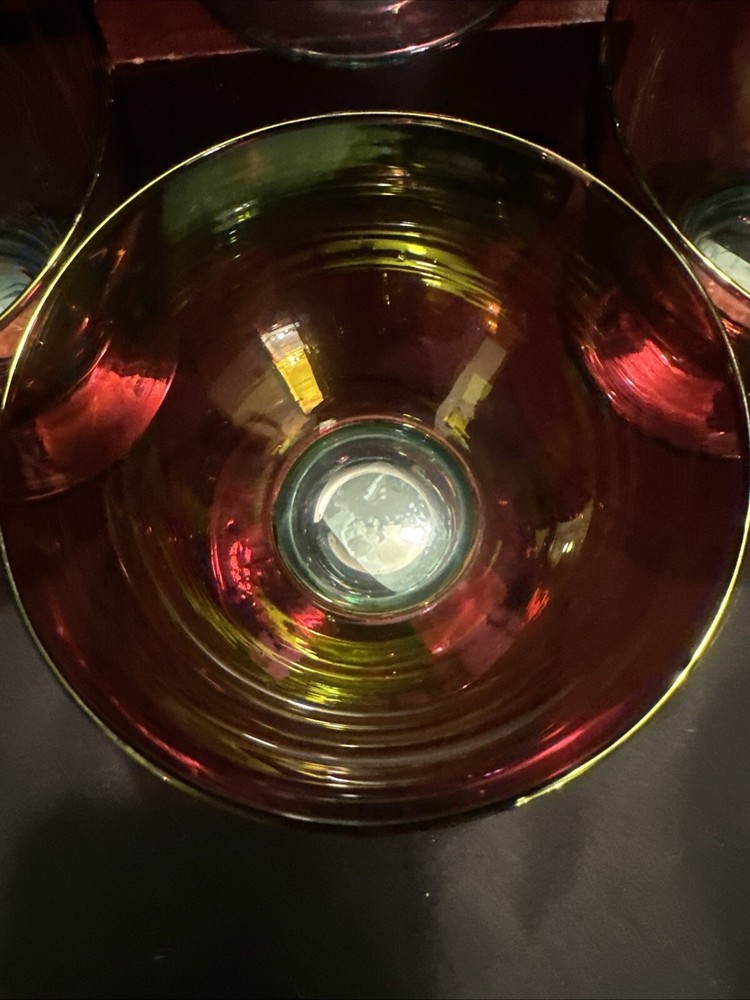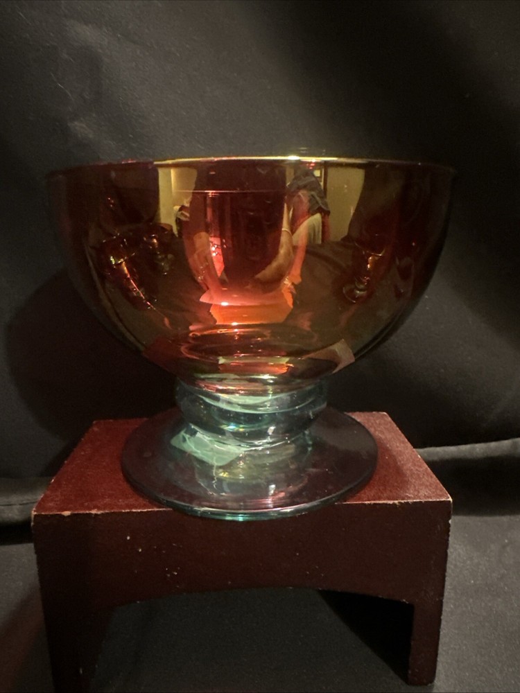 Elevate your dessert experience with this vintage Dillards iridescent 20 oz ice cream dish. Handcrafted with hand-blown glass production techniques, this dish showcases an eclectic style with a multicolor opalescent glass production style that adds a touch of uniqueness to your table setting. Perfect for serving your favorite desserts, this round dish has a capacity of 20 oz and is made of glass, making it durable and long-lasting. Originating from Mexico, this unmarked dish is perfect for those who love vintage glassware. The dish is not antique and is ideal for those who appreciate the beauty of vintage dishes. Whether you are hosting a dinner party or enjoying a quiet evening at home, this ice cream dish is perfect for adding a touch of sophistication to your table setting.