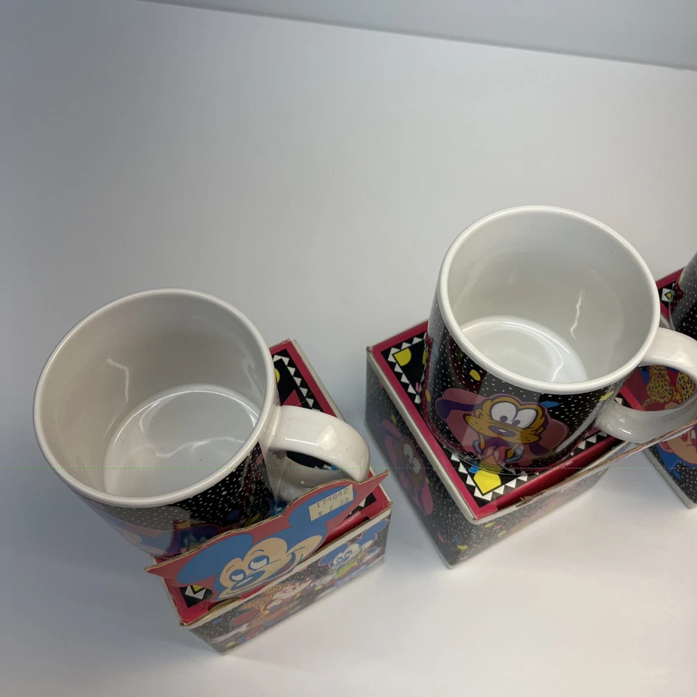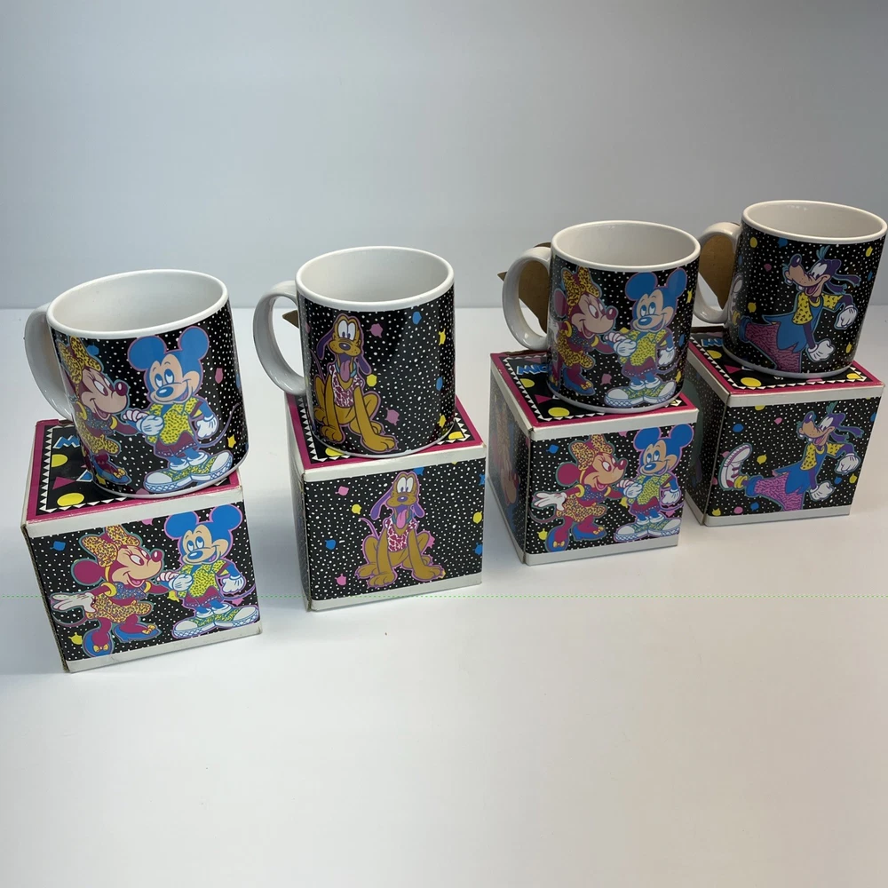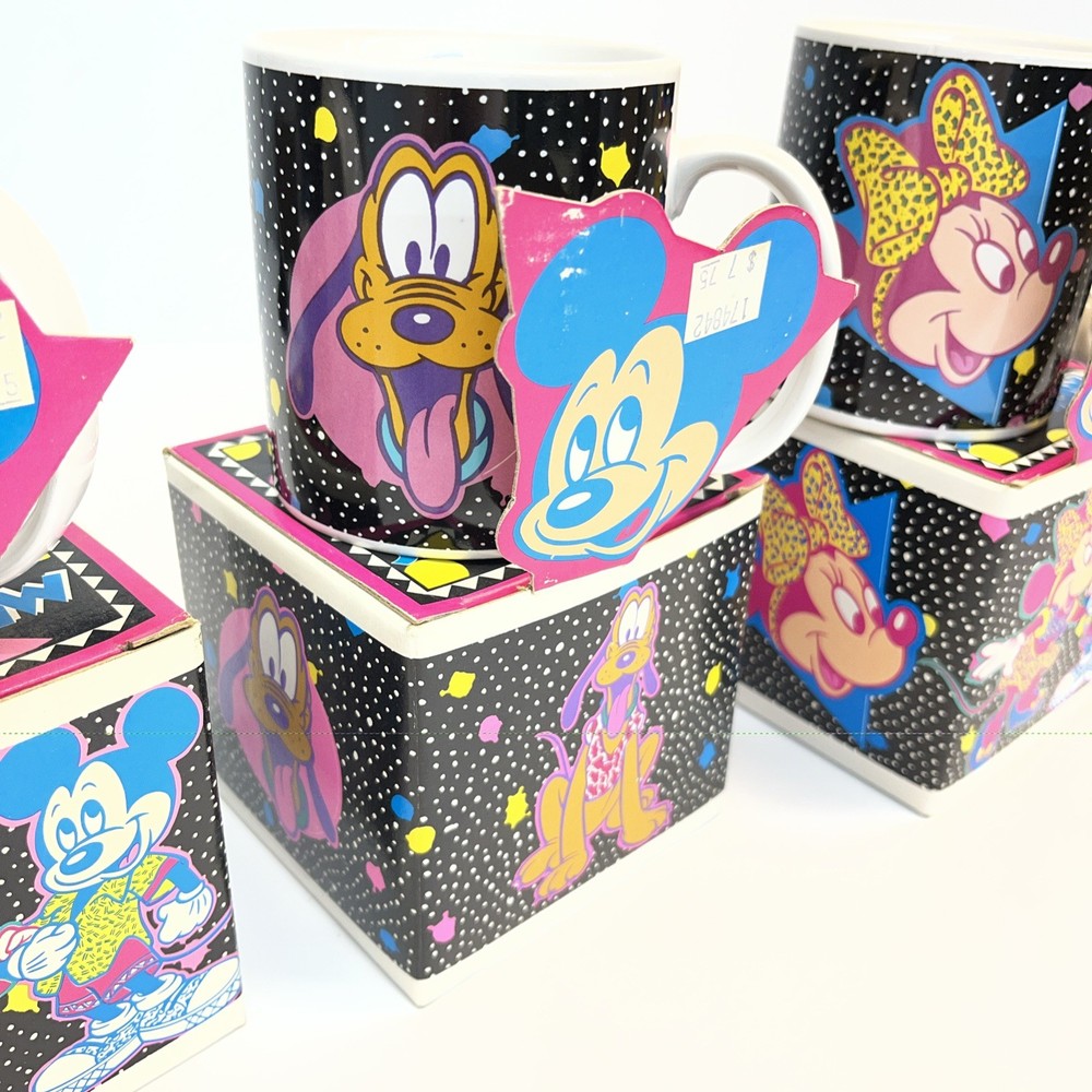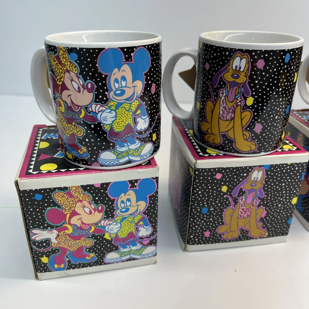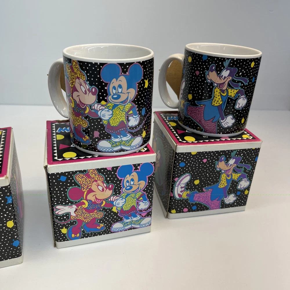 Vintage Disney ceramic mug set by Applause Inc. Includes 4 mugs featuring Mickey Mouse, Minnie Mouse, Pluto, and Goofy. Marked “Mickey & Pals Mugs” on the base. Applause Inc., Woodland Hills, CA. © The Walt Disney Company. Made in Korea. Each mug includes its original decorative cube box with character artwork. All items appear complete as shown. Condition Vintage pre-owned condition. Mugs show light surface wear consistent with age and normal handling. No visible cracks or chips noted. Boxes show edge wear, scuffing, and storage wear.