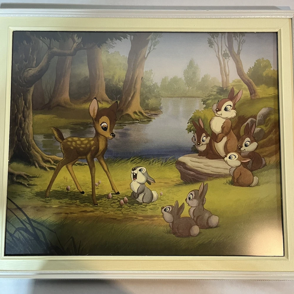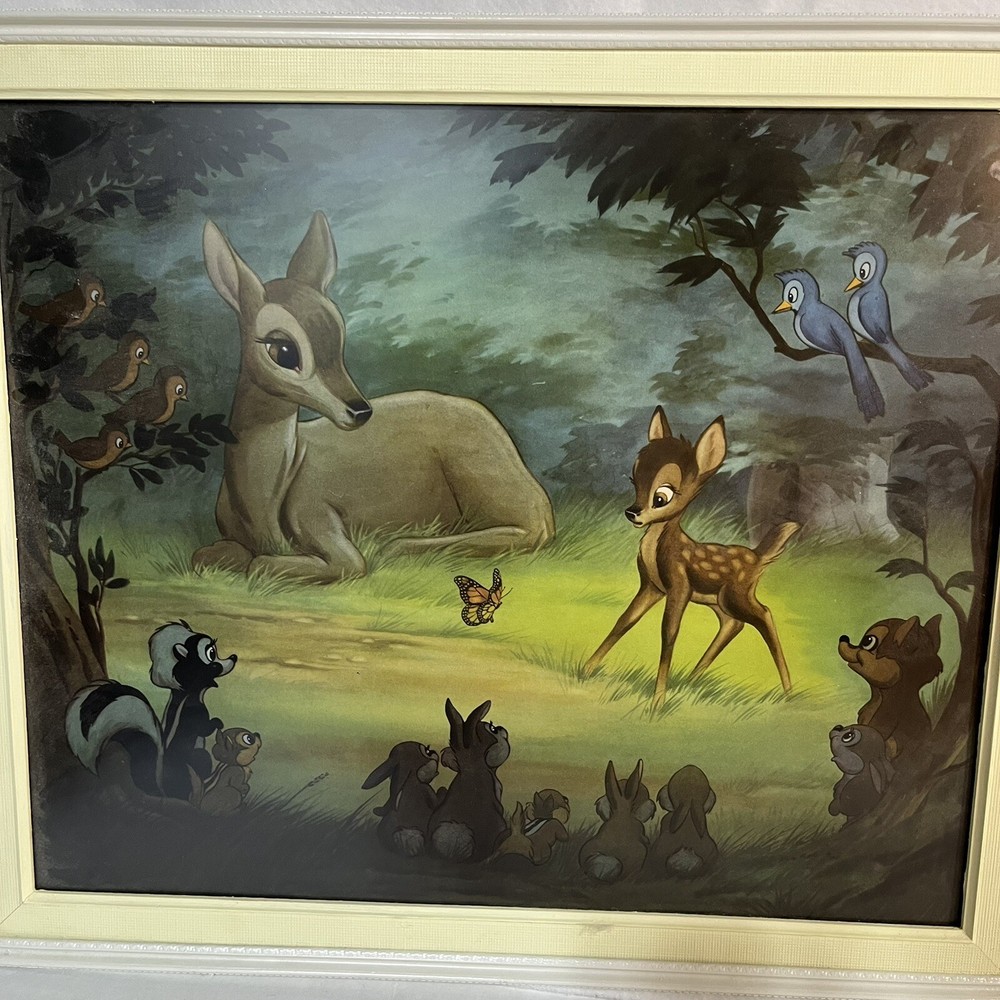 Few marks on the frames see pics These 2 beautiful framed art features Disney's Bambi meeting his friends in the forest. The vintage design is perfect for any Disneyana collector or fan of the beloved character. The piece measures 20 x 24 inches and is in great shape, ready to be displayed in your home or office. The art captures the essence of Disney's magic, showcasing the beauty of the forest and the joy of Bambi's adventure. The piece is a must-have for any fan of the franchise and is sure to be a conversation starter in any room. Add this amazing piece to your collection today!