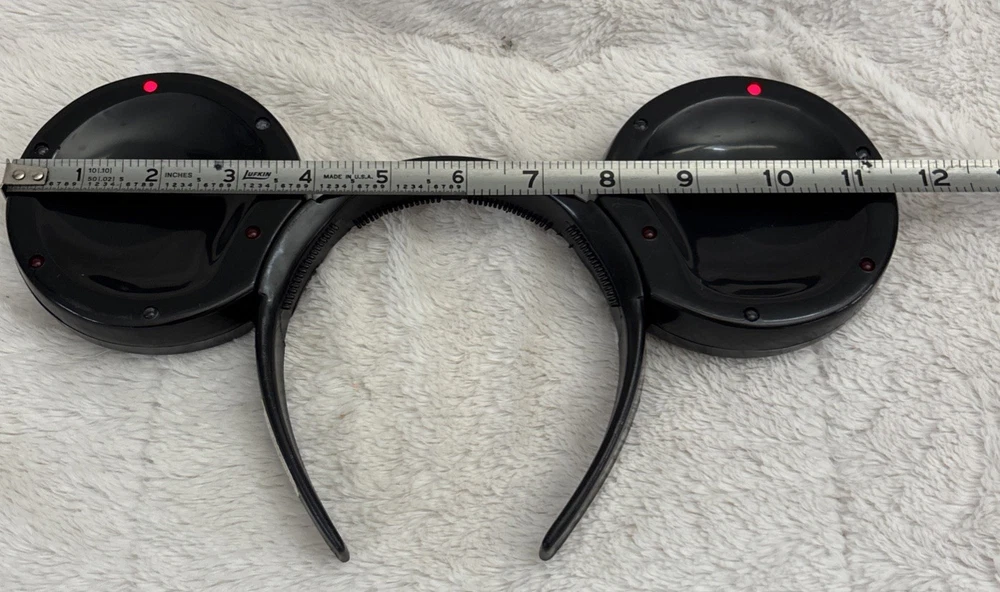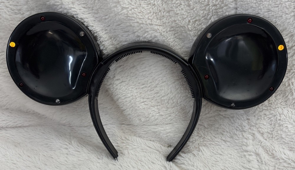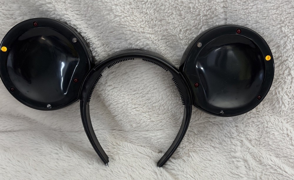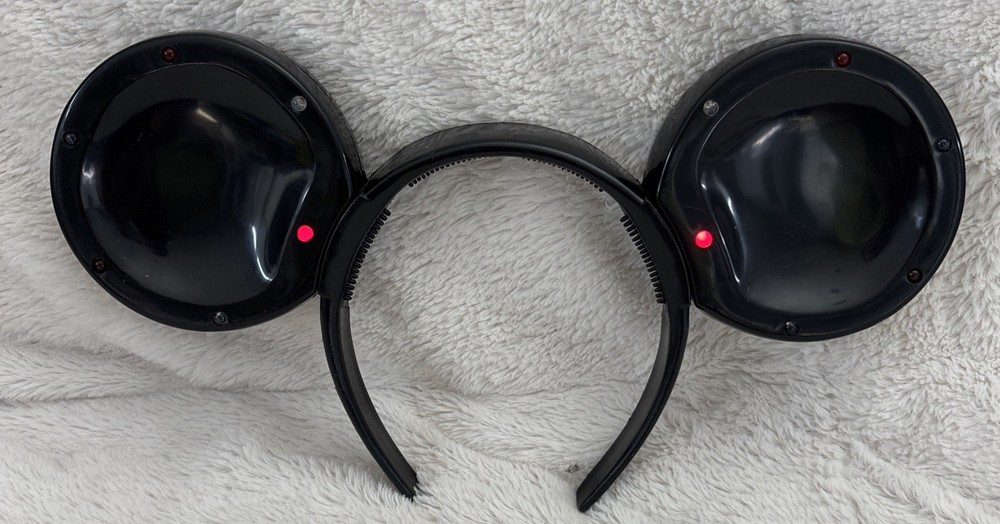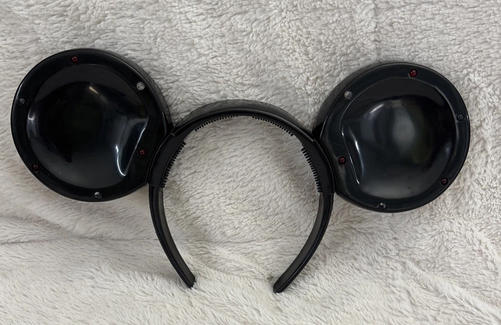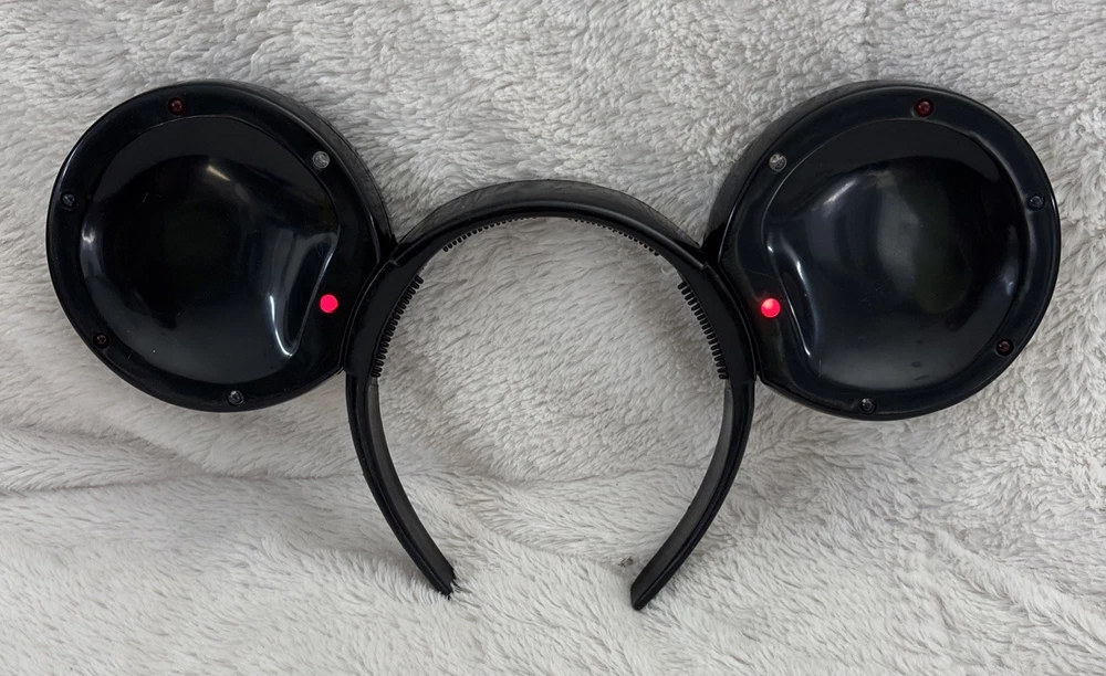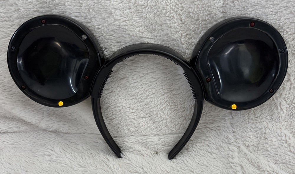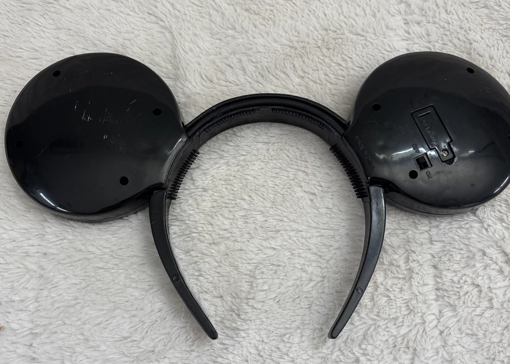 The product is a vintage Disney Parks Mickey Mouse blinking lights up ears black headband. This unisex adult accessory features the iconic Mickey Mouse character and lights up for added flair. Made by Disney and manufactured in China, this contemporary piece is one size fits most and is perfect for collectors or fans of Disney Parks. There are some scratches on the headband. See photos. Works