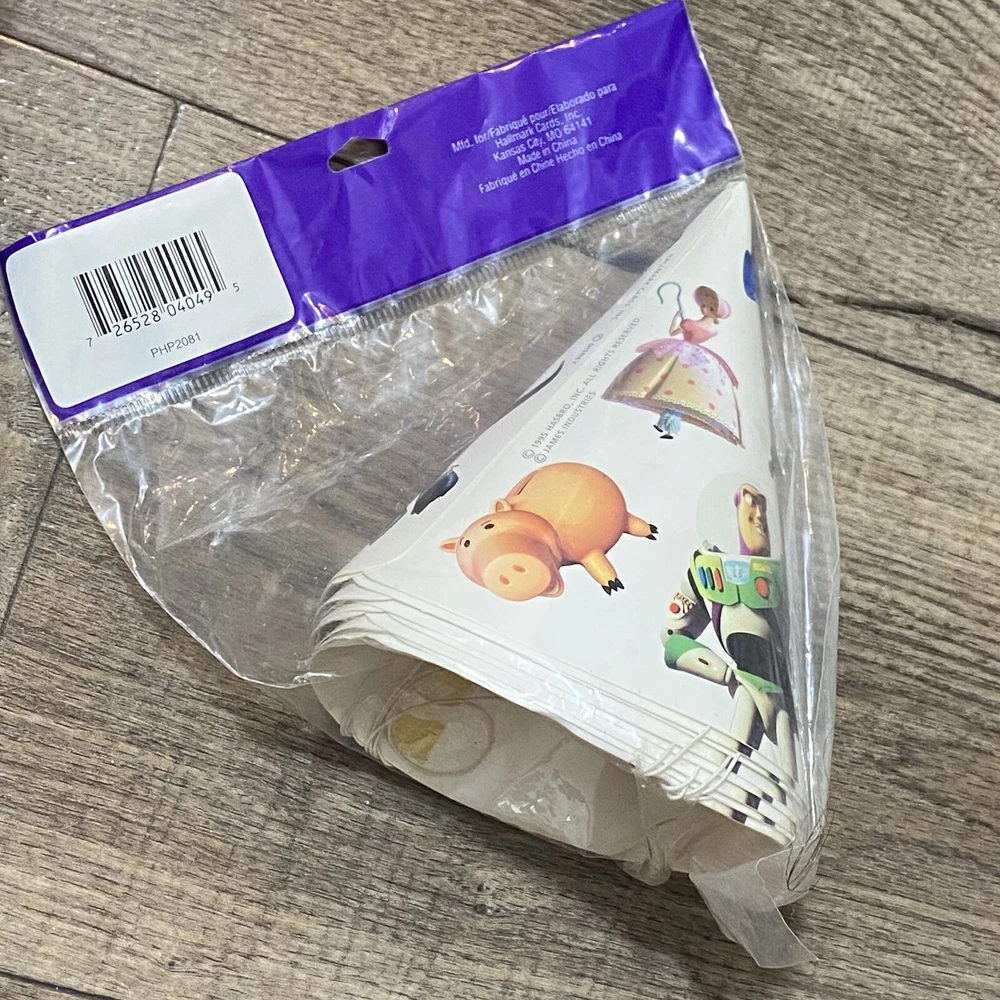 Vintage Disney Pixar Toy Story Party Pack Factory Sealed Package Hallmark 1995. You Story Set includes: 2 Factory Sealed Tablecloths 3 Factory sealed gift bags (8 each) 1 Factory Sealed napkins (16) 1 Factory Sealed invitations (8) 1 factory sealed party hats (8) 1 factory sealed plates (8) 1 open set of plates (7) Please see Pictures for all included and condition.