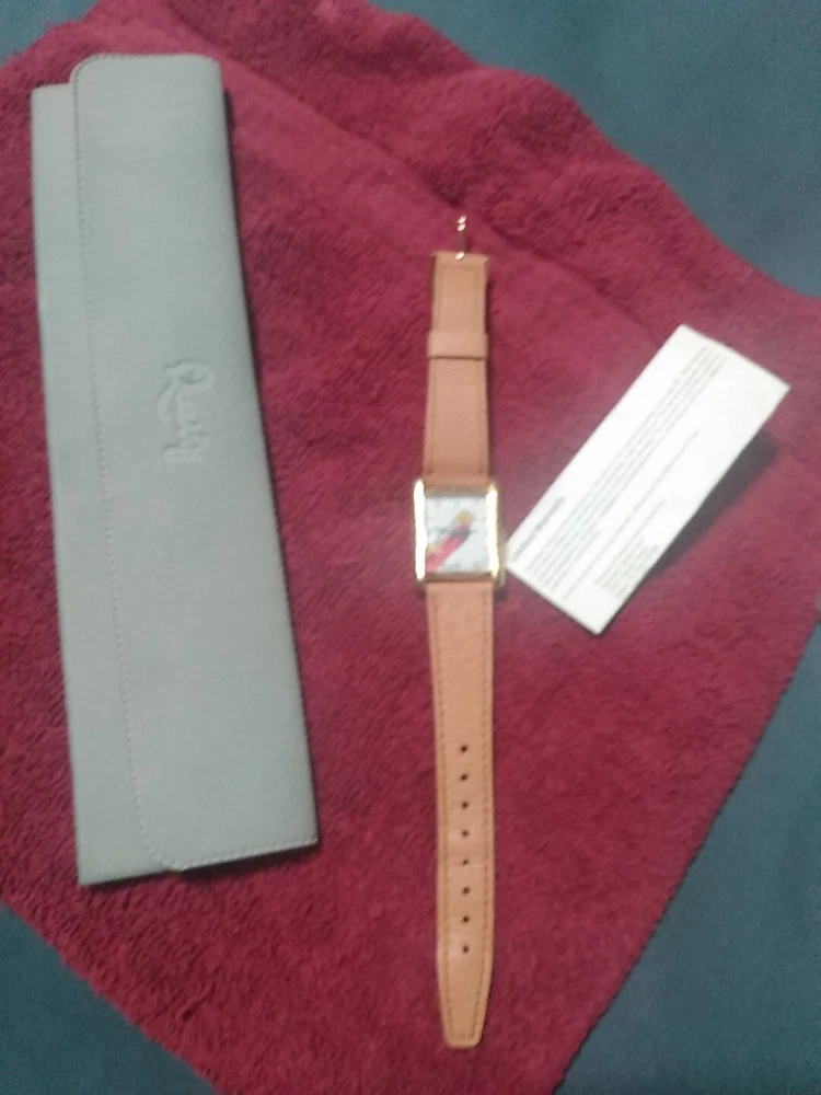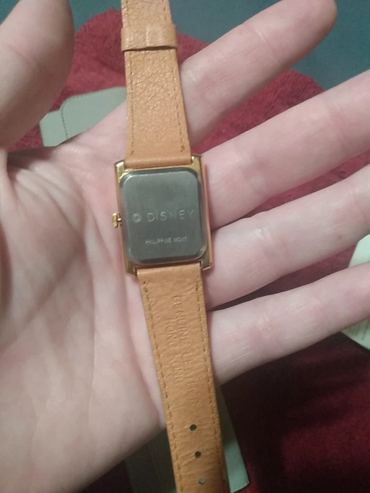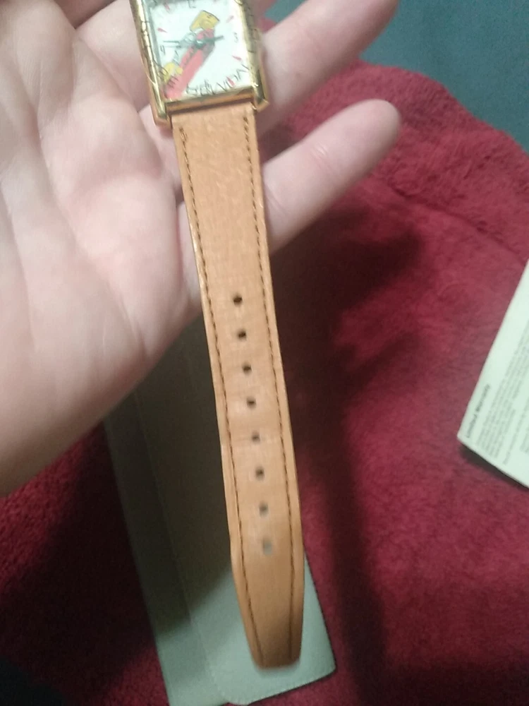 Used please see photos for imperfections. Currently not working, I believe it needs new battery. This vintage Disney Rocketeer watch features a gold tank case and a beige leather buckle band. The watch has a rectangular shape and a white dial with two hands. It is powered by a quartz movement with a battery and has a push/pull crown for adjusting the time. The case finish is glossy and the watch is designed for both men and women. It is a great addition to any Disneyana or Rocketeer collections. This watch is a contemporary piece, manufactured in the Philippines, and is perfect for any watch enthusiast.