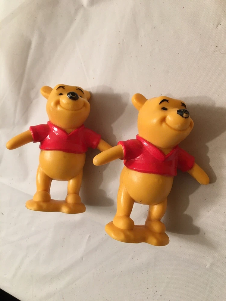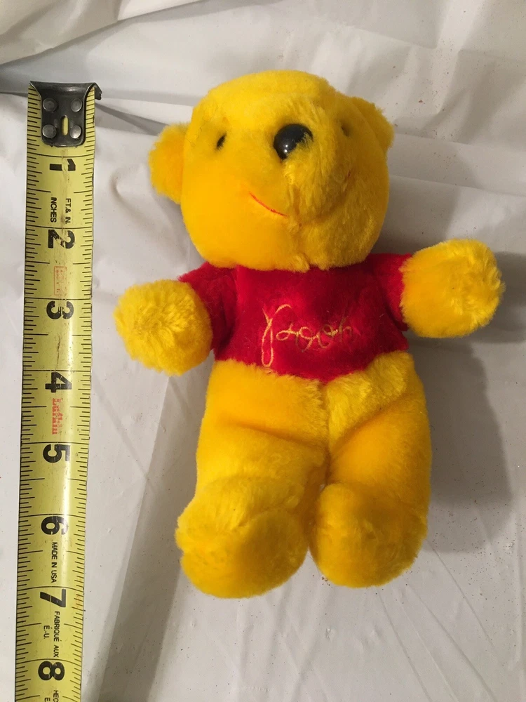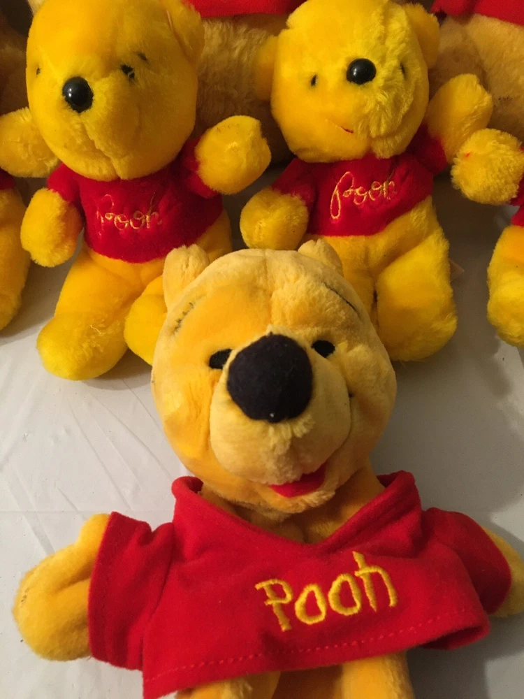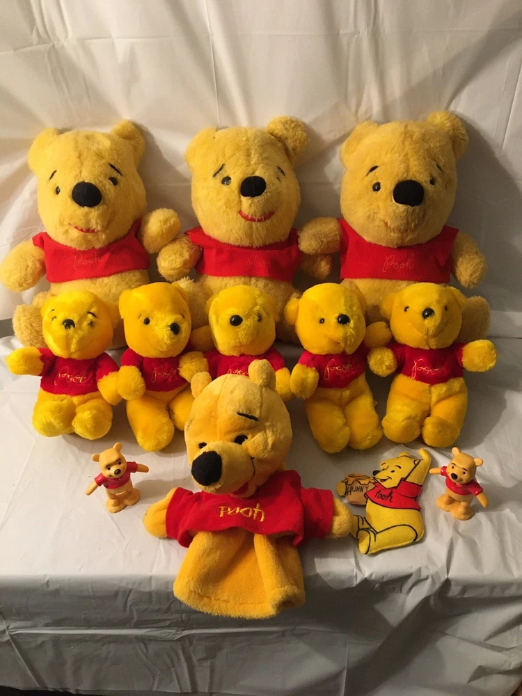 This vintage Disney Winnie the Pooh plush lot features multiple plush toys from the beloved character and franchise. These collectible items are perfect for any Disneyana collector or fan of Winnie the Pooh. The plush toys showcase the charming and timeless design of the character and are a great addition to any Disney collection. The toys appear to be mostly from the 1980’s and are all in good condition. The collection includes 5 small Poohs, 3 larger Poohs, a hand puppet Pooh, a vintage felt ornament Pooh and 2 small PVC Winnie the Poohs.