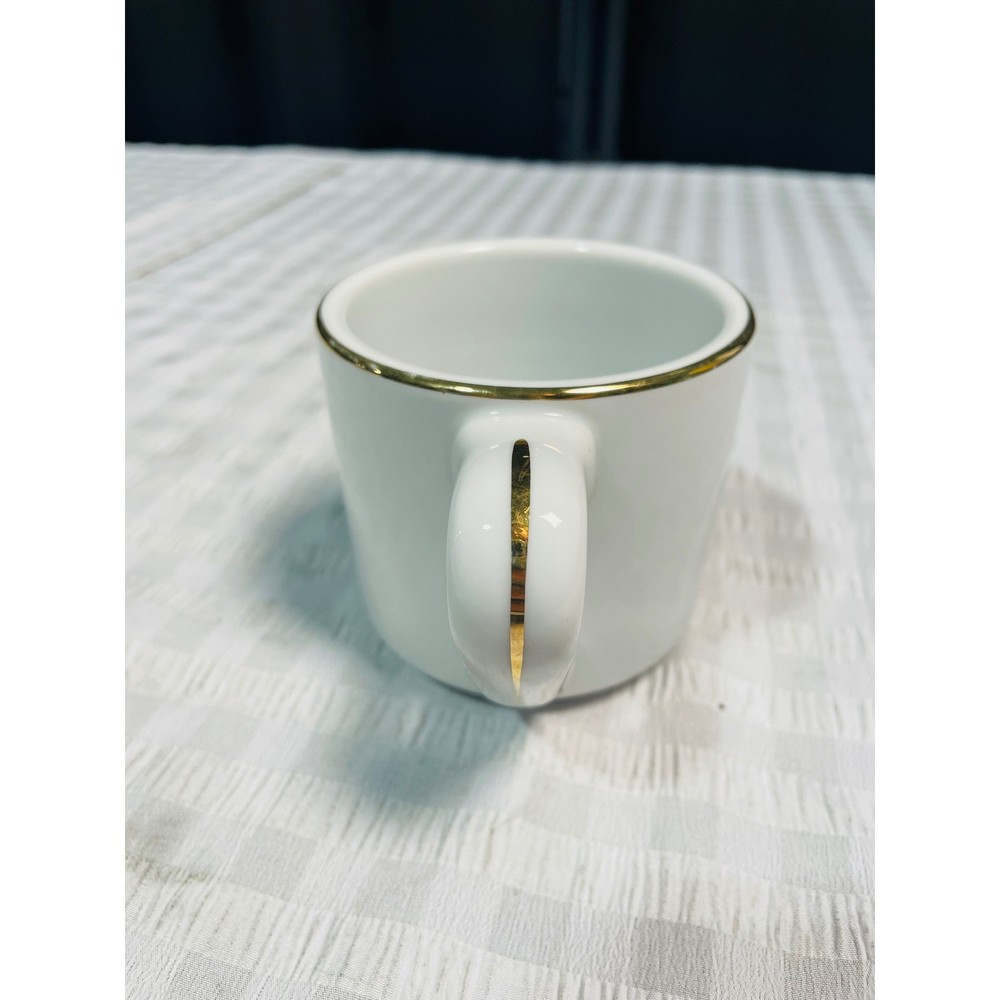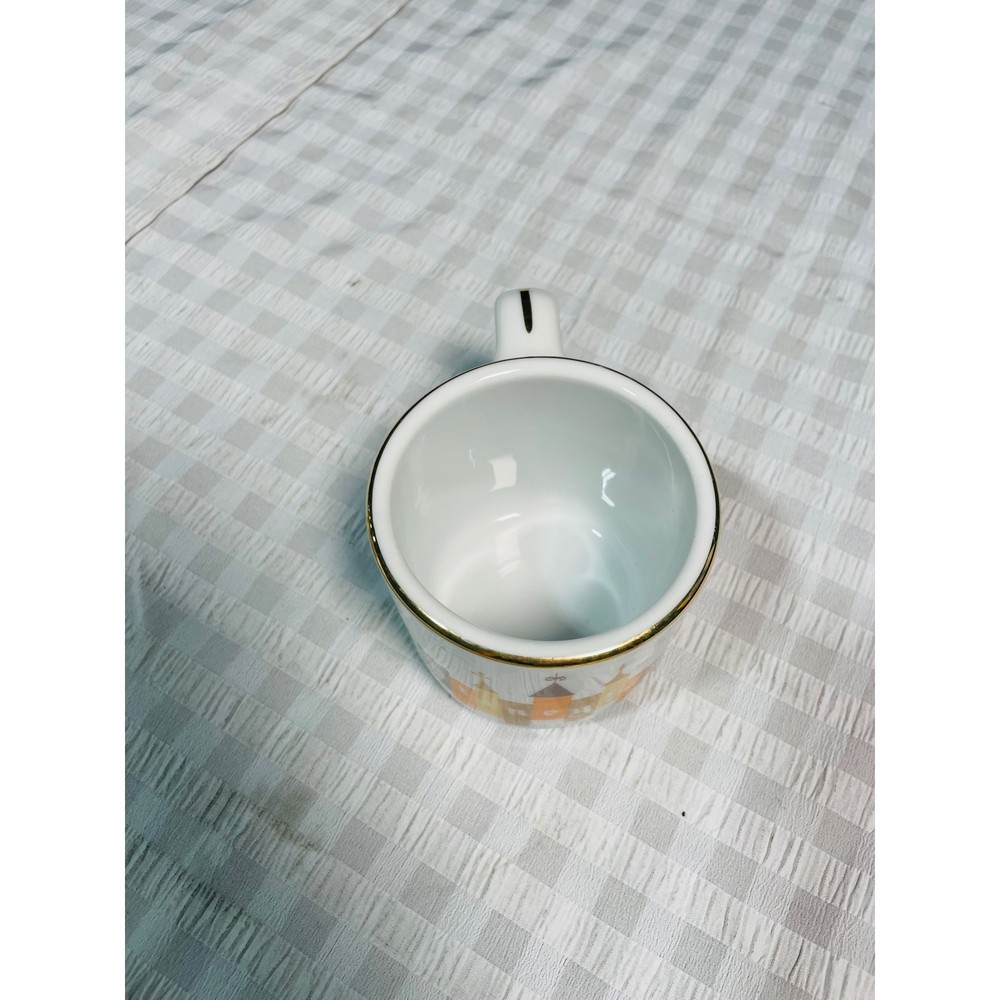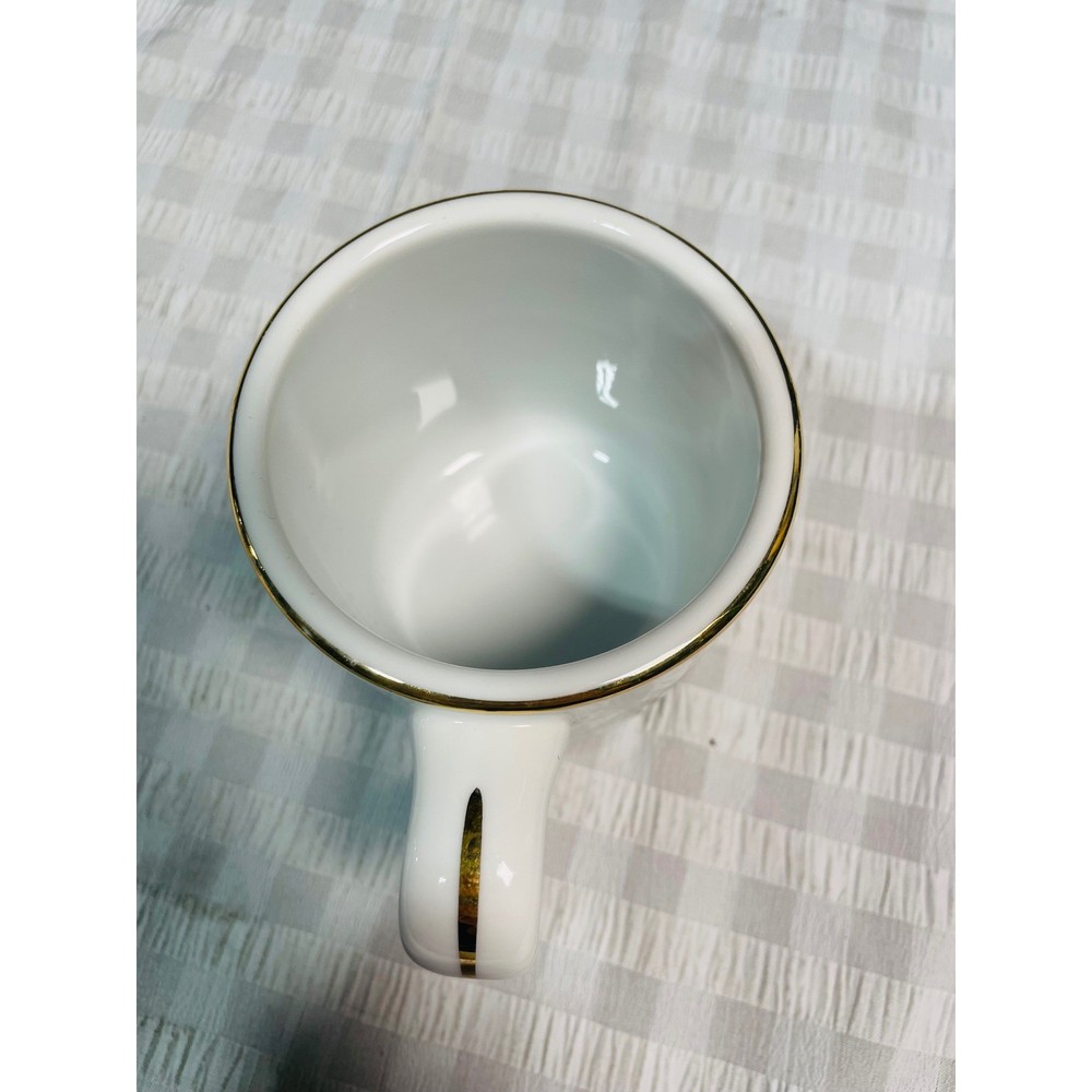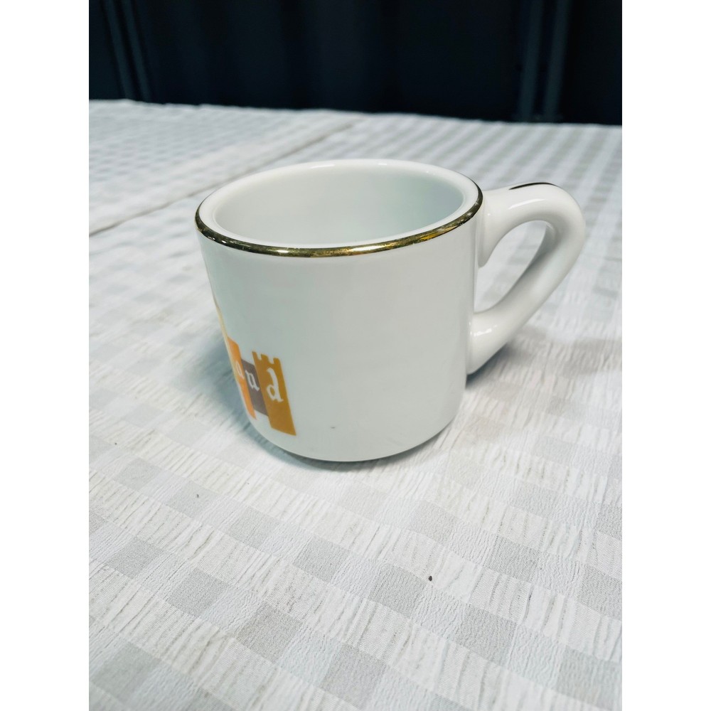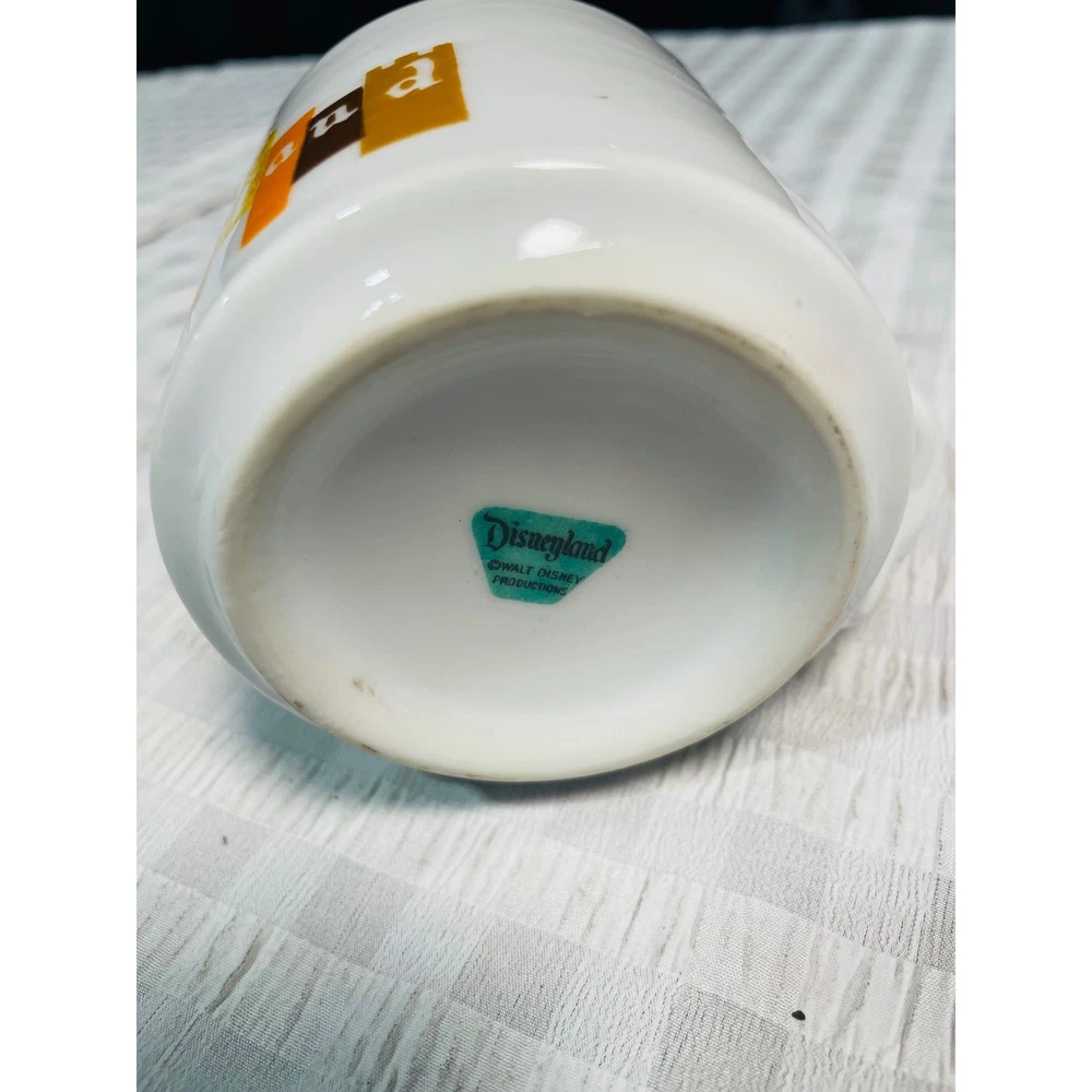 Vintage Disneyland ceramic coffee mug features a retro Sleeping Beauty Castle graphic in shades of orange, yellow, and brown. This classic souvenir piece is accented with a gold-tone rim and a matching gold stripe on the handle, capturing the mid-century charm of Walt Disney Productions. The white ceramic body provides a clean backdrop for the stylized castle towers and the iconic Disneyland logo. Perfect for collectors of Disneyana or fans of vintage theme park memorabilia.