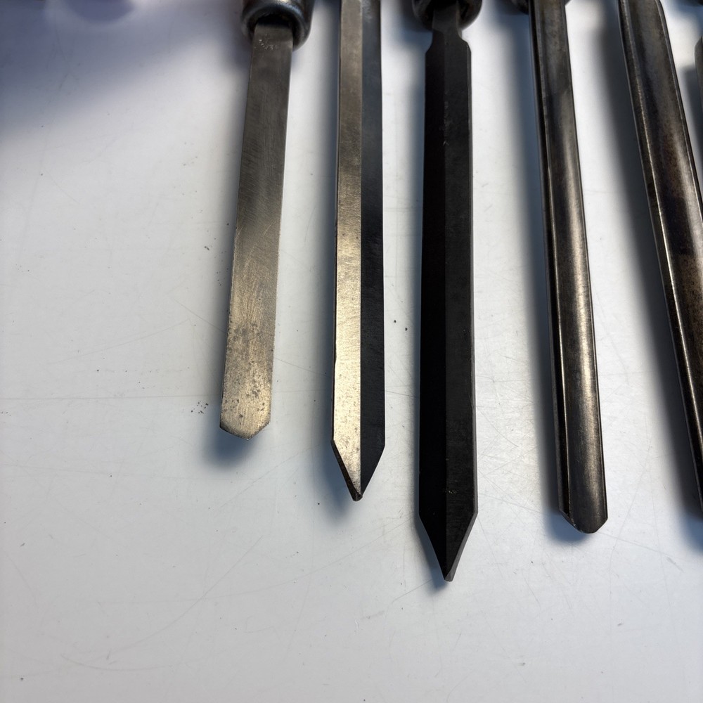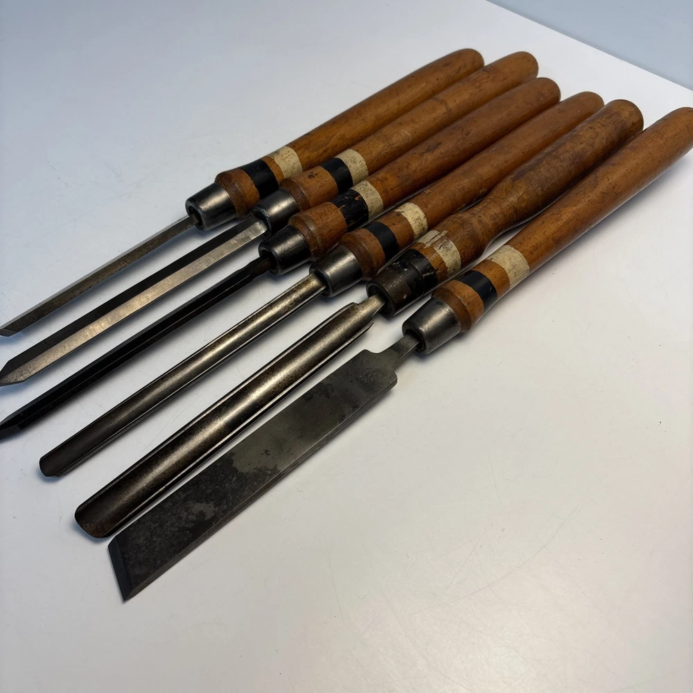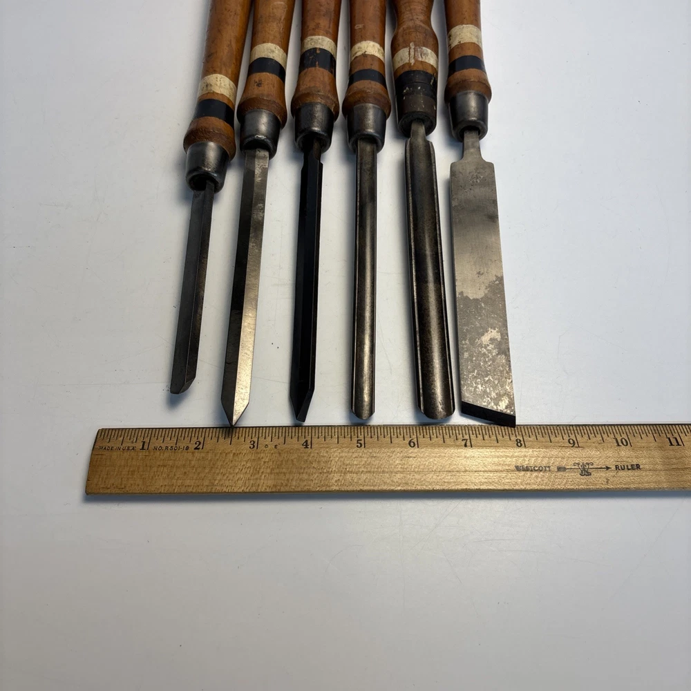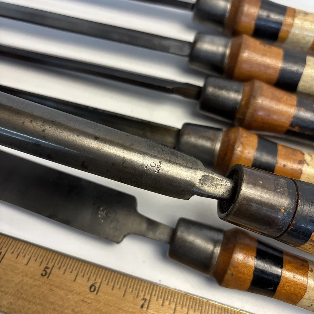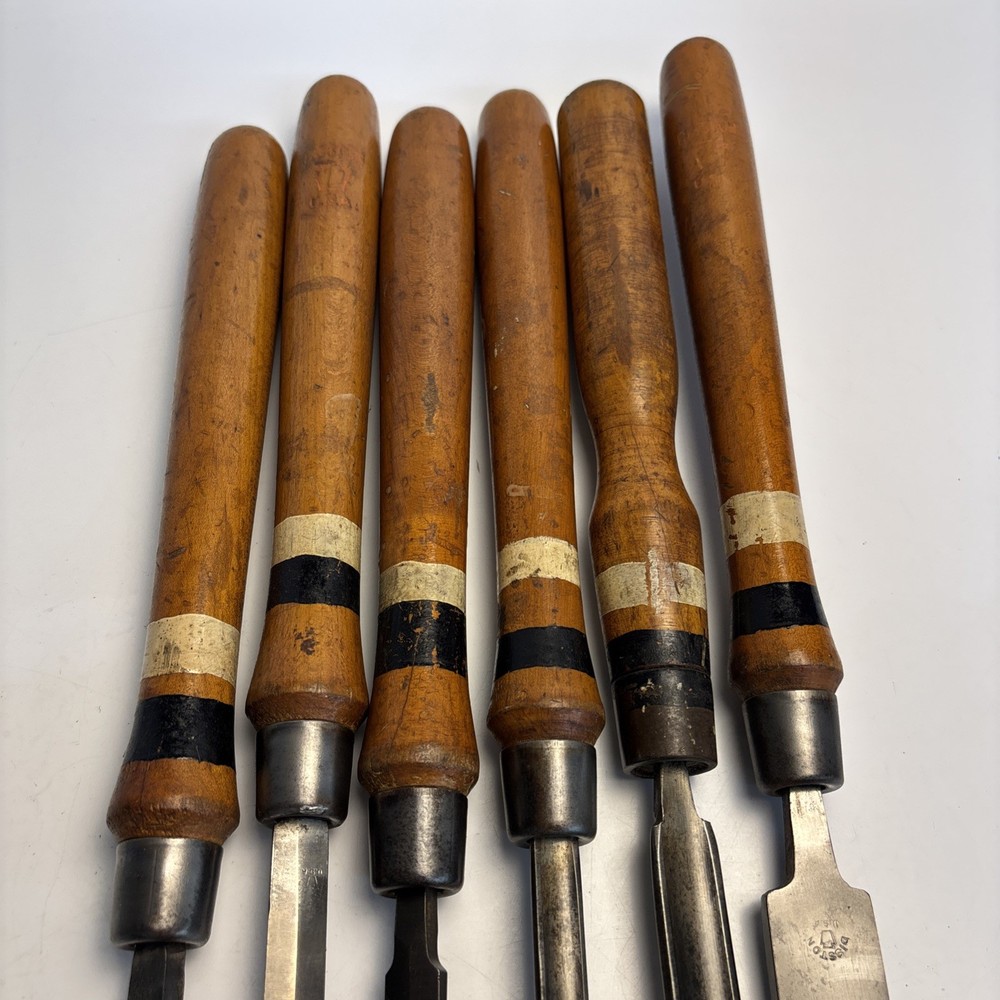Vintage set of 5 Disston 1 Greenlee wood turning chisels for lathe use. Each tool measures approximately 17 inches overall and features turned wood handles with metal ferrules. Includes a variety of cutting profiles such as gouges, skews, and scrapers for shaping and finishing wood on a lathe. Shows wear from use including patina, surface marks, and areas of discoloration on the blades. Cutting edges show use and may benefit from sharpening. Handles show age, wear, and minor marks but remain solid. See photos for complete details.