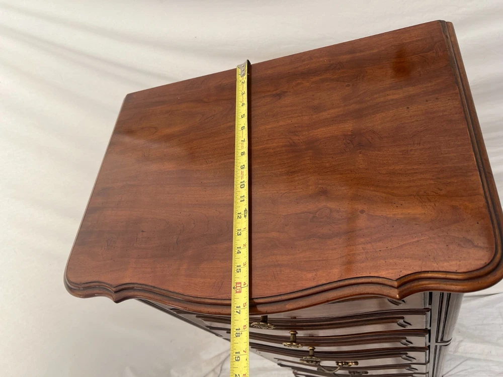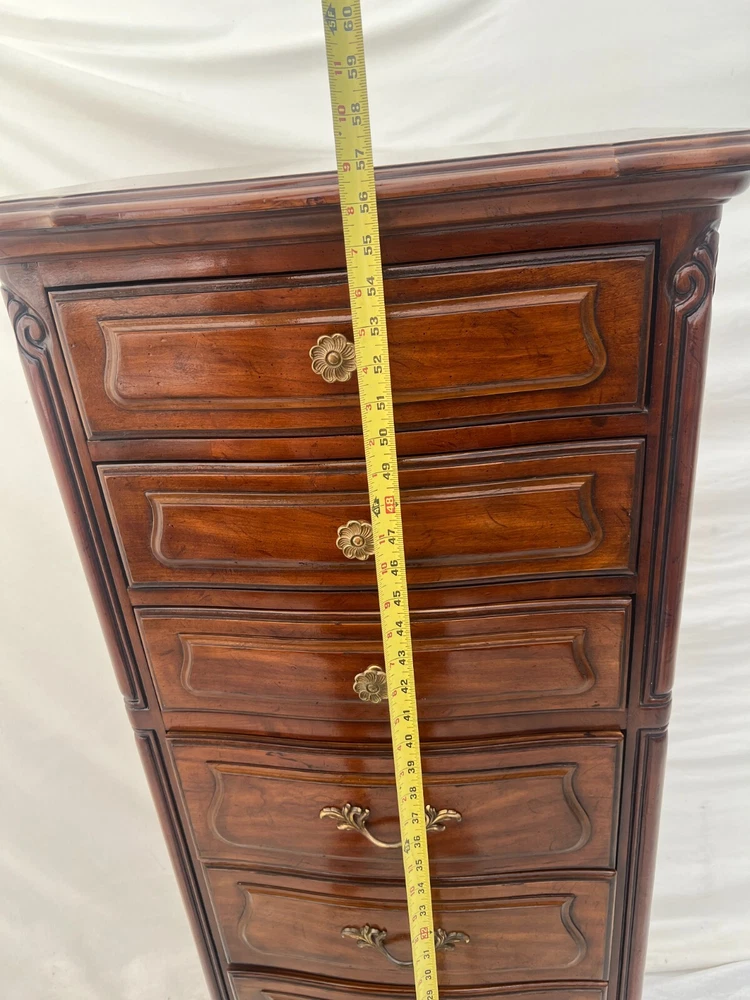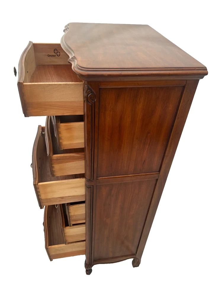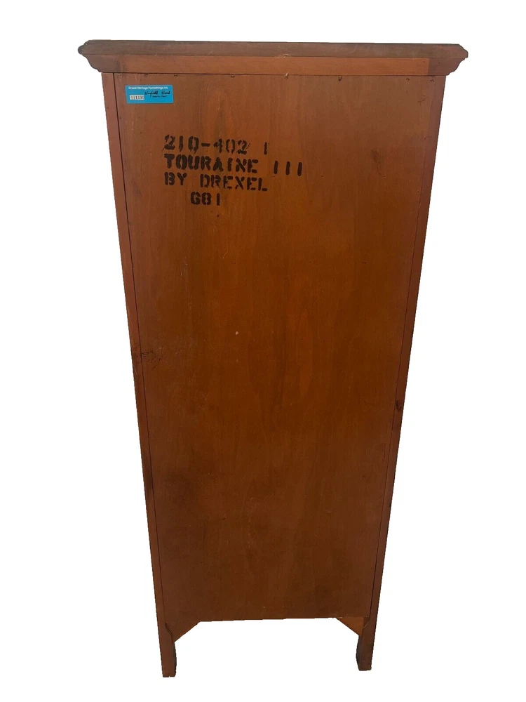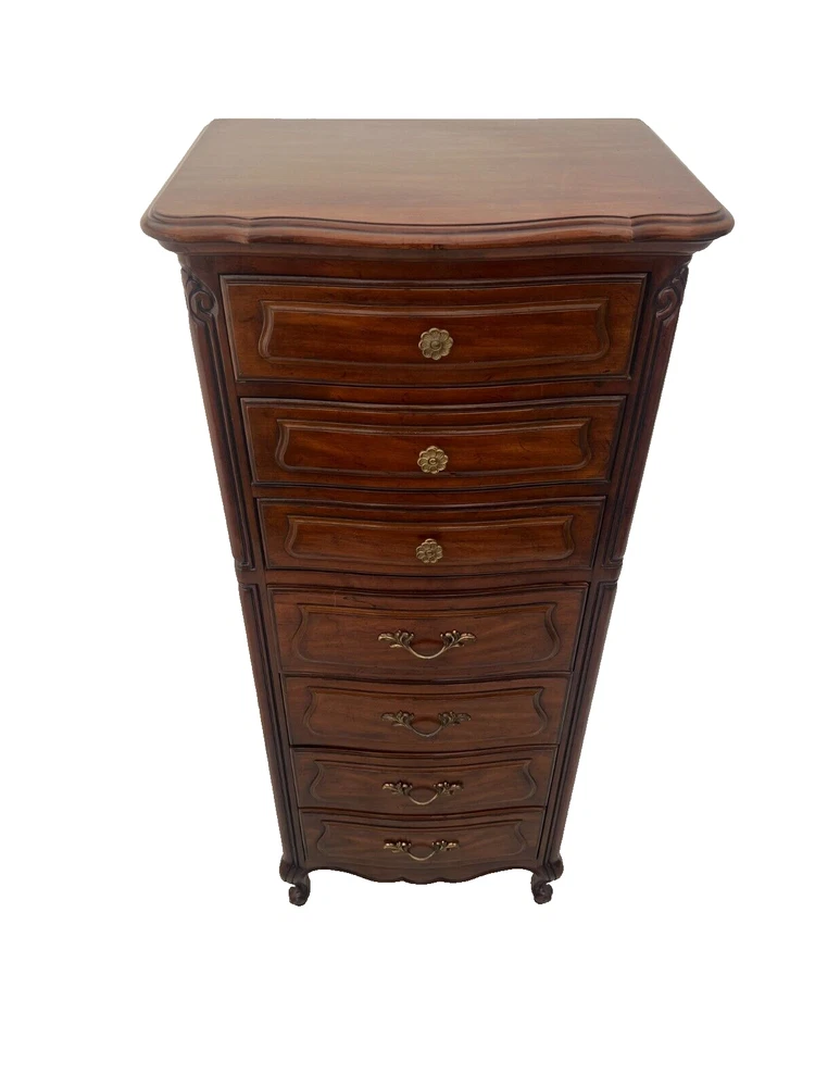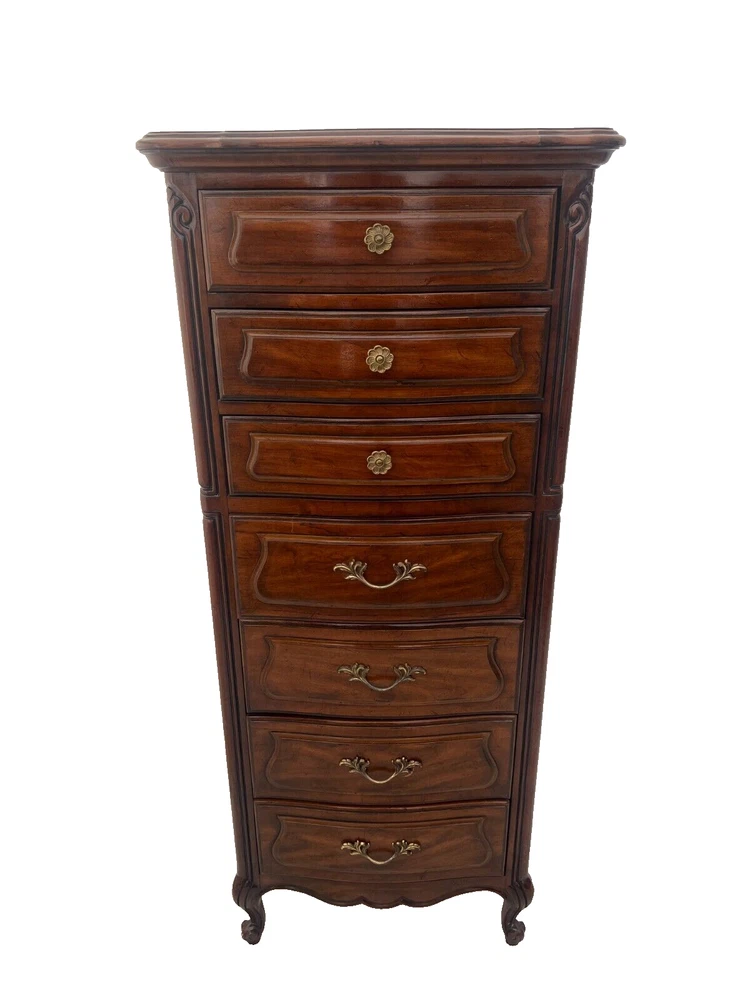 Original/Reproduction: Original Mounting: Free Standing Room: Bedroom, Home Office/Study Material: Brass, Walnut, Wood Handle Material: Brass Assembly Required: No Features: Seven drawers, Lingerie Dresser, Dresser Chest, Chest of Drawers MPN: 210-402 1 Item Width: 24 in Style: French Country Wood Tone: Dark Wood Tone Item Length: 17 in Brand: Drexel UPC: Does not apply Item Height: 57 in Type: Lingerie Dresser Color: Medium wood tone Additional Parts Required: No gtin13: Does not apply Number of Drawers: 7 Shape: Rectangular