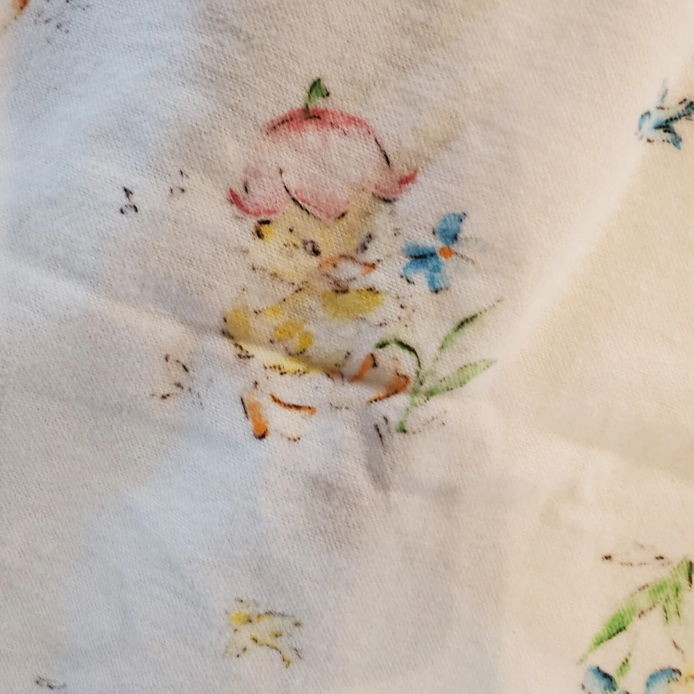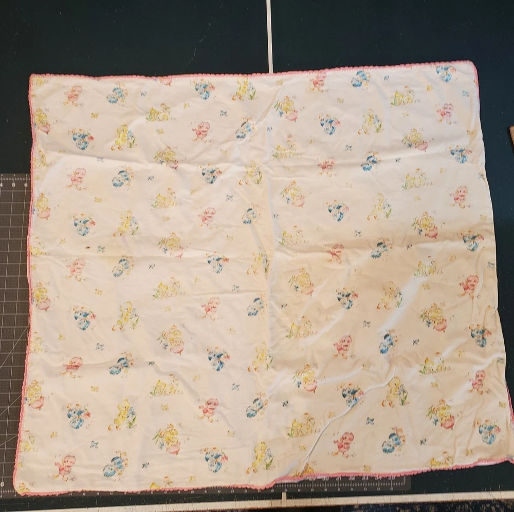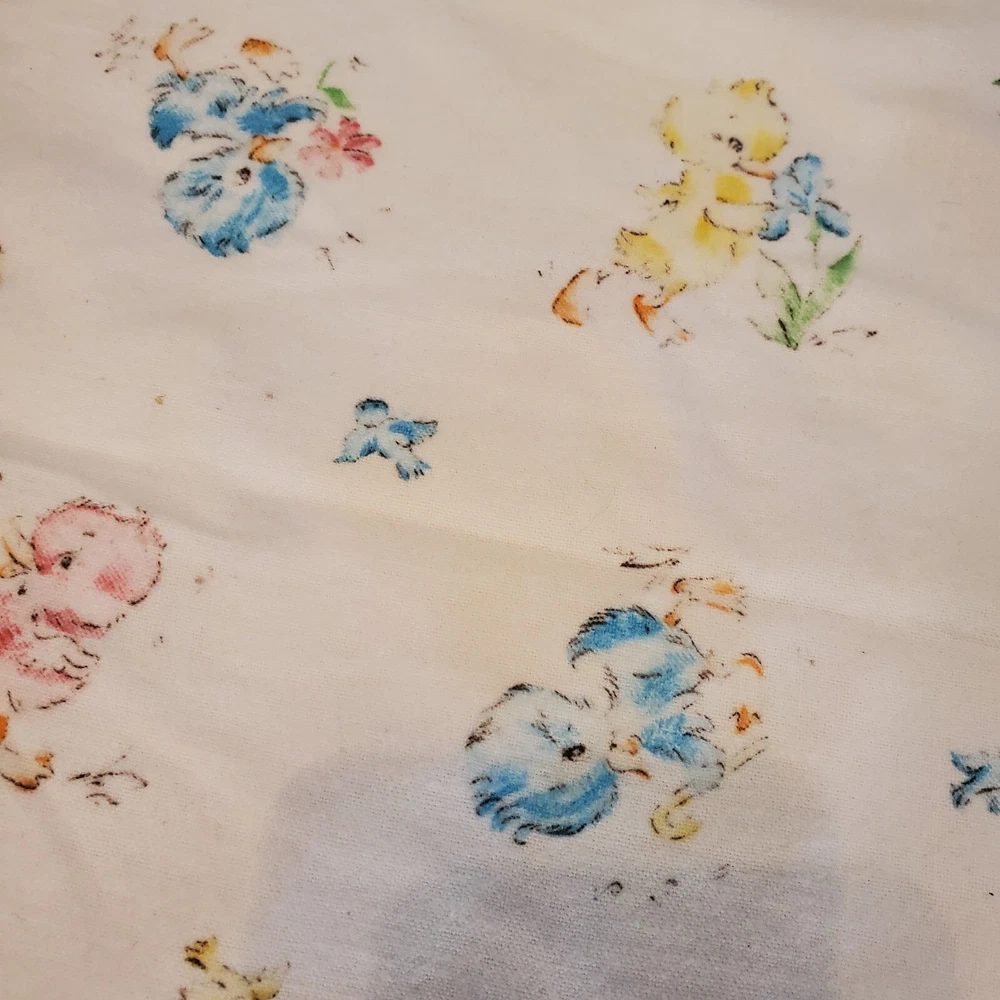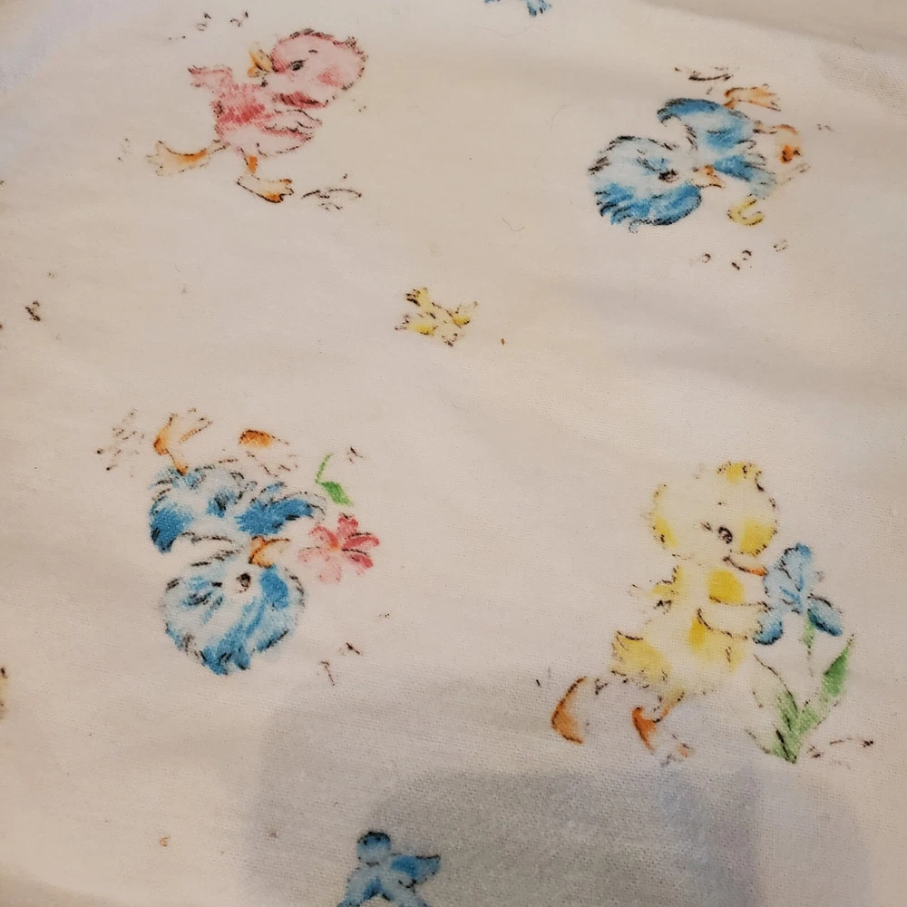 Vintage Dundee Ducklings Flannel Handmade Baby Blanket Crocheted Edge Easter This blanket appears to be handmade by sewing two Dundee Cotton Flannel Baby blankets together and crocheting a trim for them. It has a nice thickness and warmth. Finished size is 33" x 35". Some staining ~ a smaller area with a dark stain and a larger patch that is yellowed but harder to notice. There is also some general wear and fading to the fabric. Please view the photos carefully for condition details. Don't forget to check out the other items in my shop. I'm getting in new fun things all the time. Thank you for looking! Have a great day!