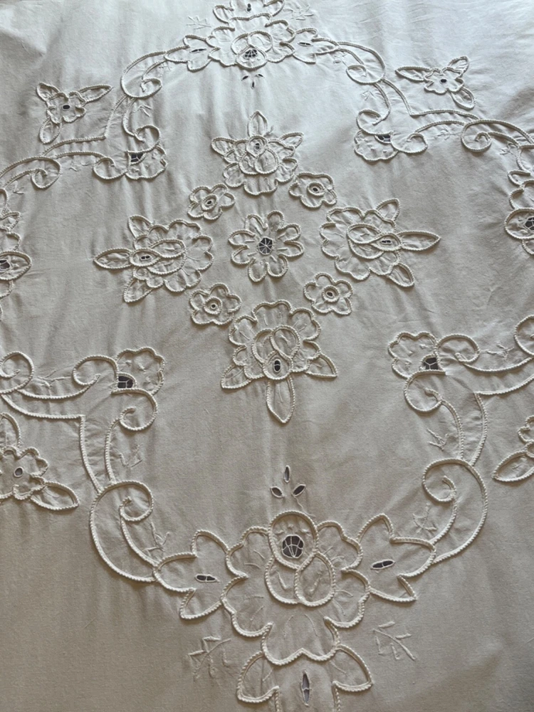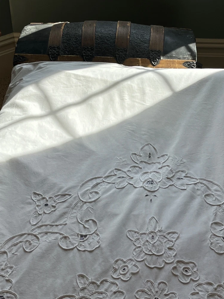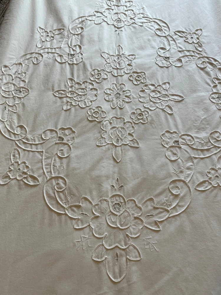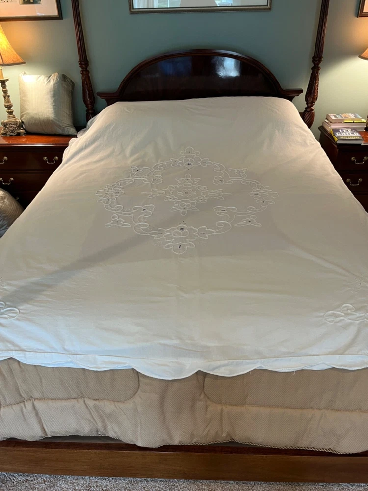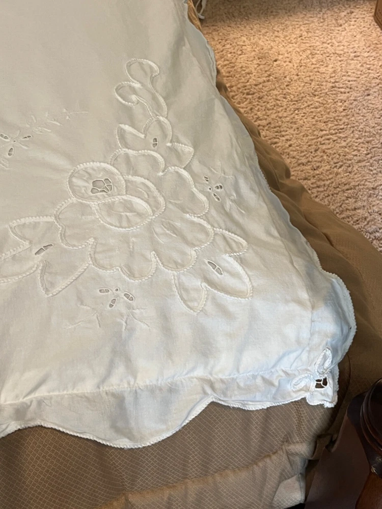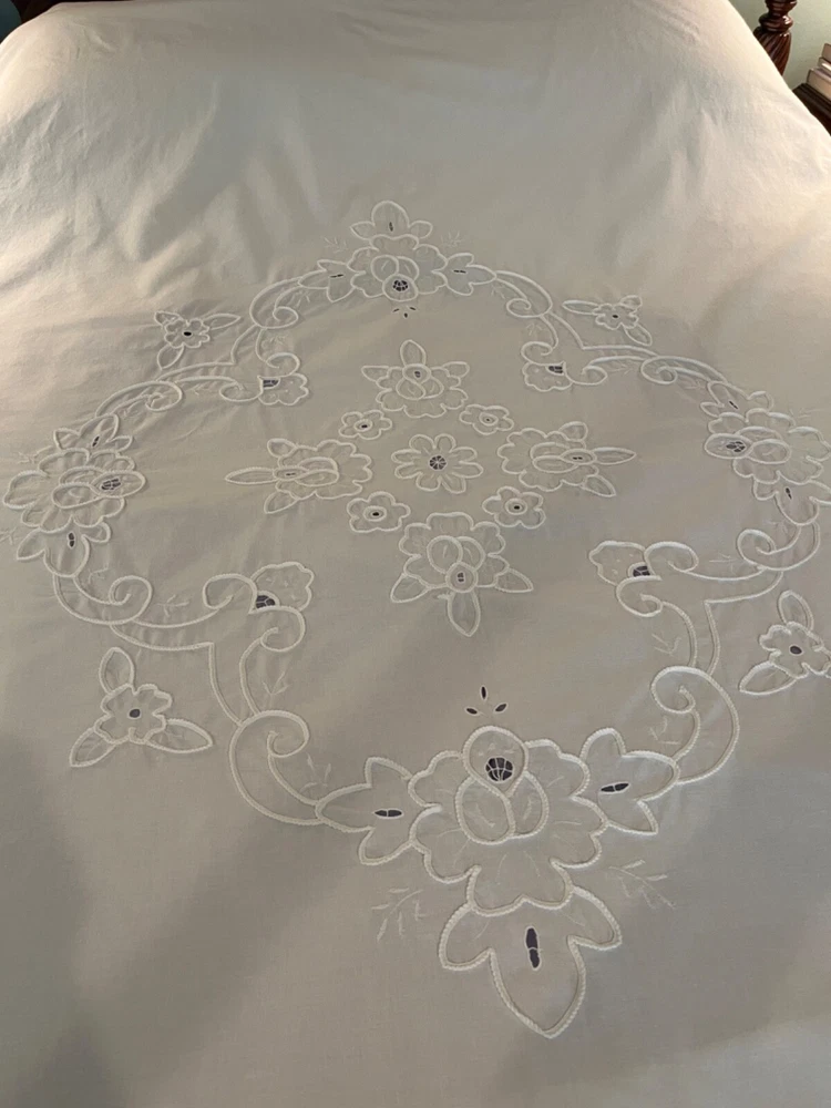 Add a touch of vintage charm to your bedroom with this beautiful duvet cover. Featuring a floral pattern in chain-stitch embroidery and cutwork design, this rectangular cover is made of easy-care cotton material and measures 68 inches in width and 85 inches in length. The cover is machine washable and comes with buttons for easy closure. Ideal for a cottage or farmhouse-style bedroom, this duvet cover is perfect for those who appreciate embroidery and vintage decor. Pictured on both a twin air mattress and flat on a queen bed, this could work as a topper on a larger bed, or a close to complete cover on a twin. Some of the photos have a lavender piece of fabric inserted to show the pattern of cutwork better; this is for photographs only and not included in the listing. And there was a lot of shadow as I took photos; one picture has a piece of white paper to try to show that is is truly a bright white duvet cover. This is scalloped around 3 edges, including the open end at the foot. The closed end at the top of the bed is simply straight across.