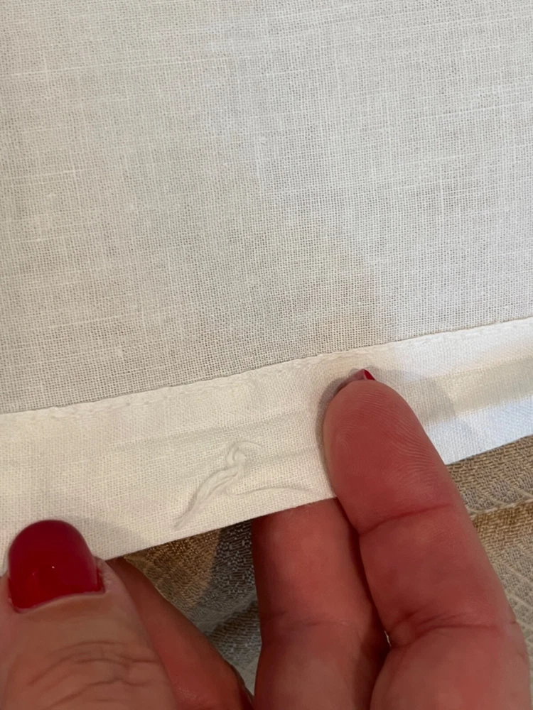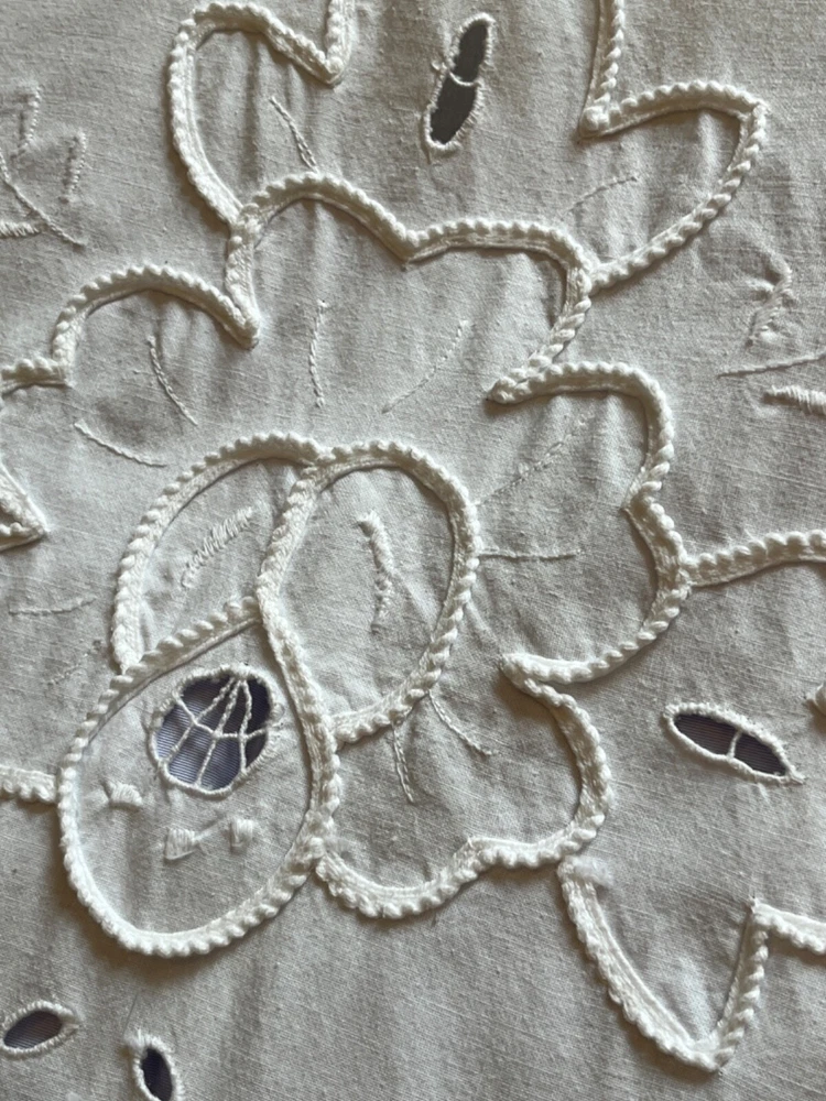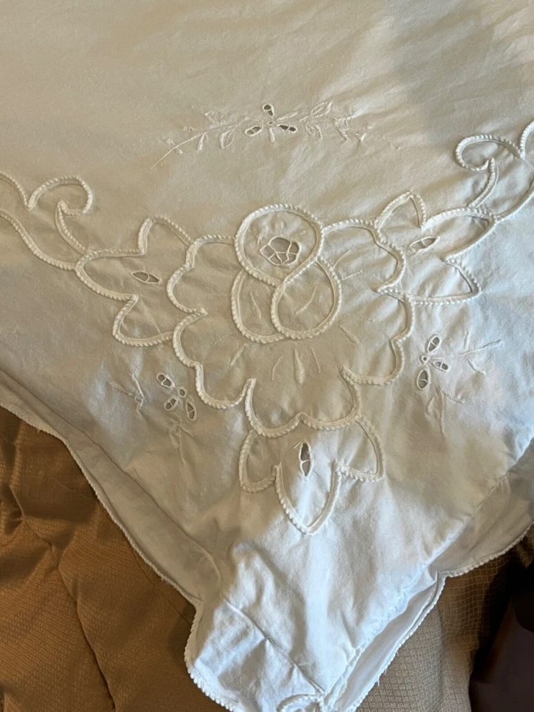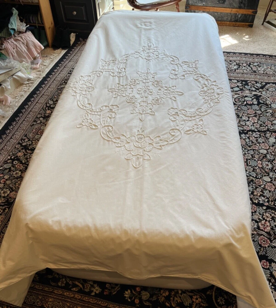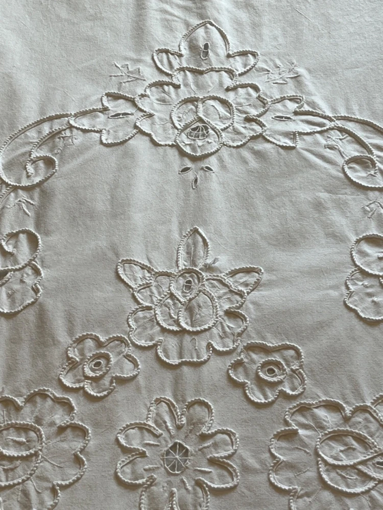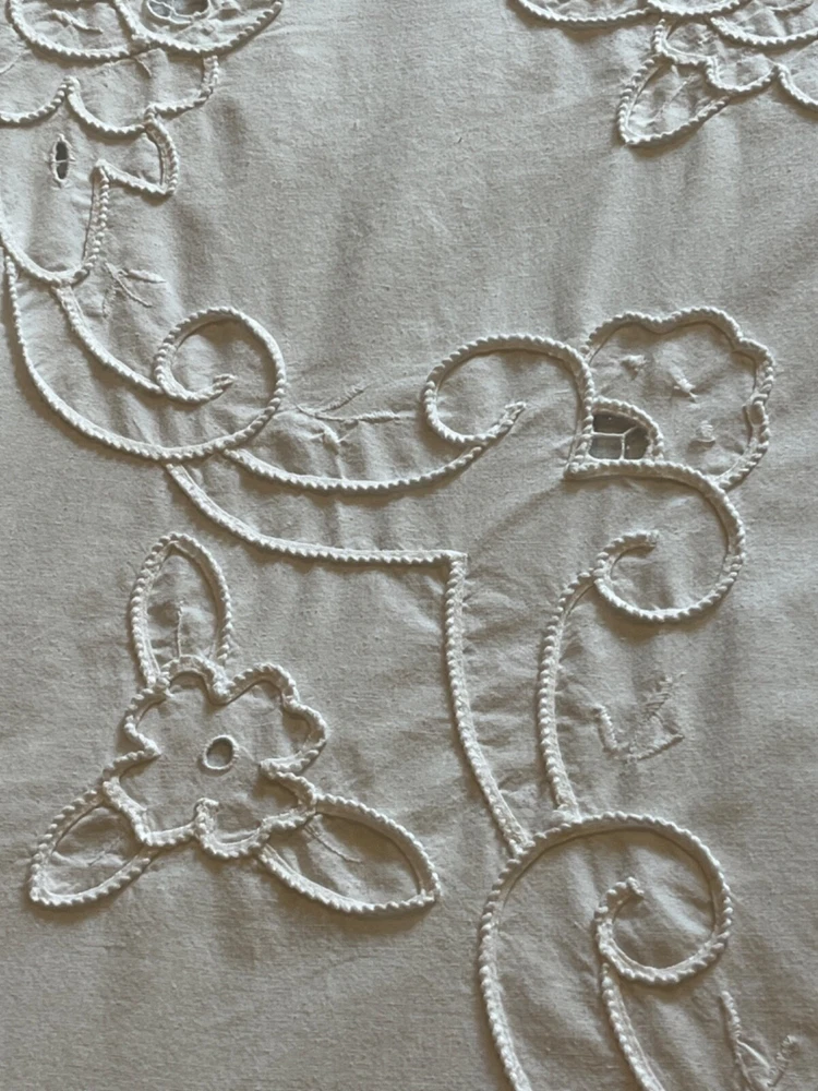 Add a touch of vintage charm to your bedroom with this beautiful duvet cover. Featuring a floral pattern in chain-stitch embroidery and cutwork design, this rectangular cover is made of easy-care cotton material and measures 68 inches in width and 85 inches in length. The cover is machine washable and comes with buttons for easy closure. Ideal for a cottage or farmhouse-style bedroom, this duvet cover is perfect for those who appreciate embroidery and vintage decor. Pictured on both a twin air mattress and flat on a queen bed, this could work as a topper on a larger bed, or a close to complete cover on a twin. Some of the photos have a lavender piece of fabric inserted to show the pattern of cutwork better; this is for photographs only and not included in the listing. And there was a lot of shadow as I took photos; one picture has a piece of white paper to try to show that is is truly a bright white duvet cover. This is scalloped around 3 edges, including the open end at the foot. The closed end at the top of the bed is simply straight across.