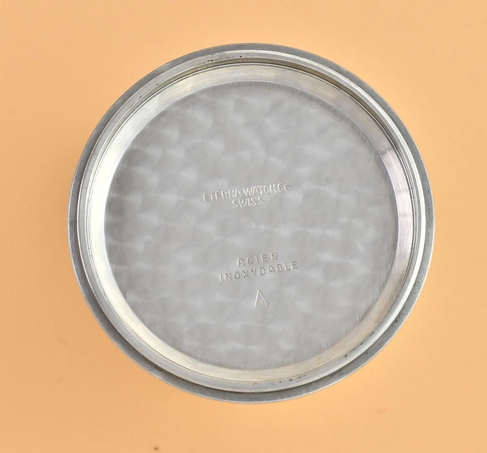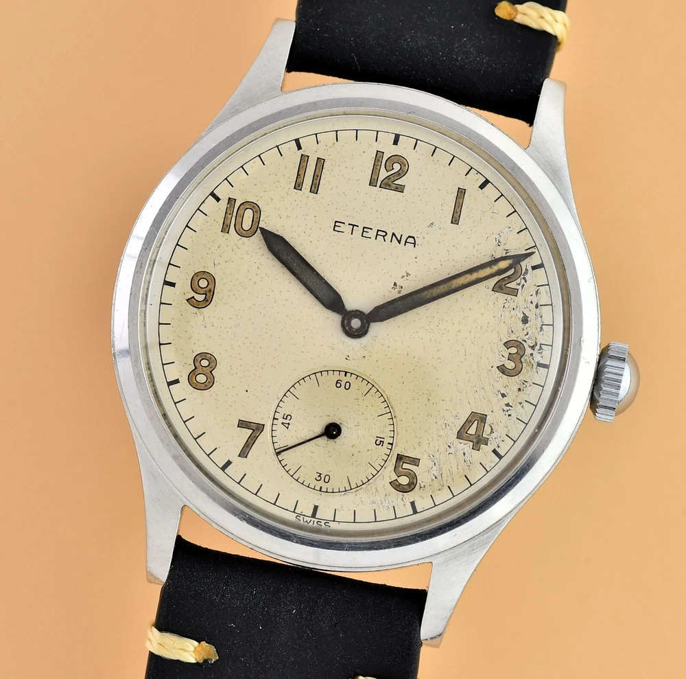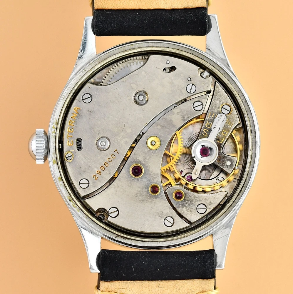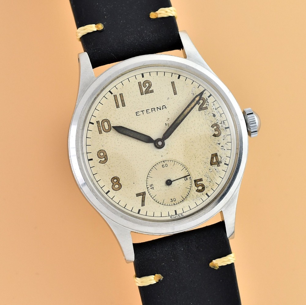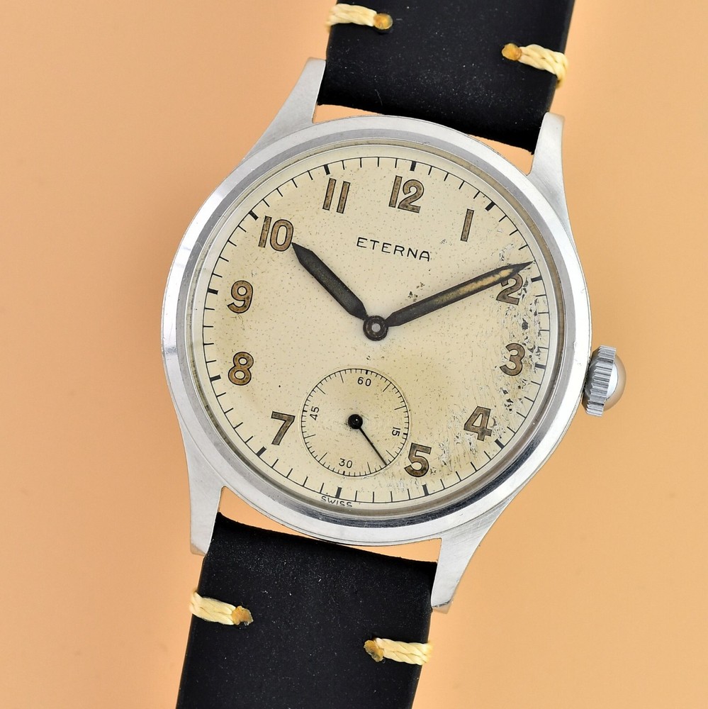 Up for sale is late 40's Eterna Jumbo. Original, unrestored dial in fair vintage condition. Original hands and dial lume. Unpolished stainless steel case with screw back. Movement Cal.852- hand wound in fully working order, keeps correct time. Cleaned and oiler recently. Brand new, genuine leather "vintage" strap included. Size: 36,5mm without the crown, 44mm lug to lug, takes 19mm strap. Free worldwide DHL Express insured delivery. All photos were taken by me. Happy bidding.