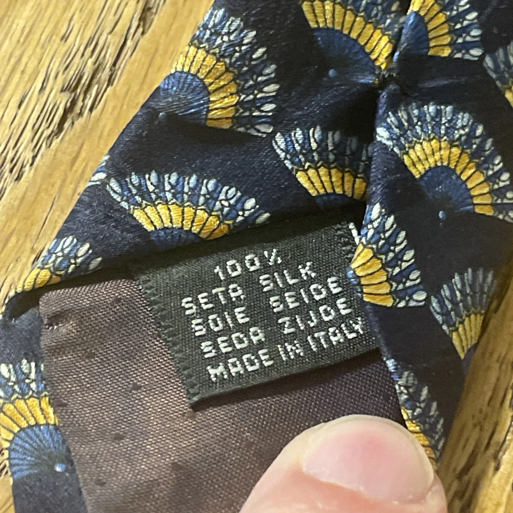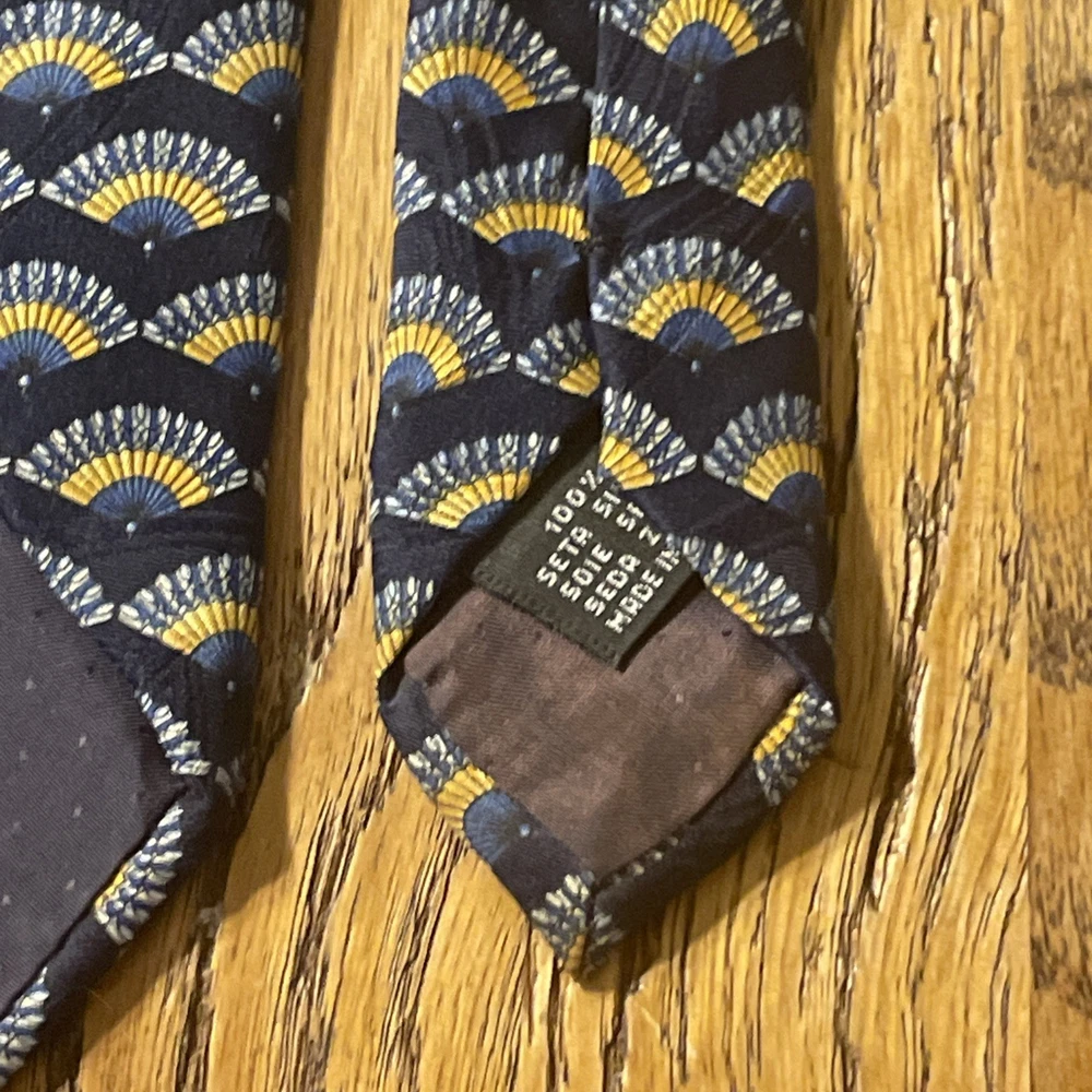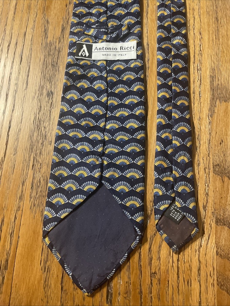 The Vintage EUC Antonio Ricci Geometric Fans Silk Tie Necktie is a high-quality designer accessory made in Italy. This multicolor tie features a classic geometric pattern, perfect for a preppy and sophisticated look. Made from 100% silk satin, this vintage piece exudes timeless elegance and style, making it a must-have for any man's wardrobe.
